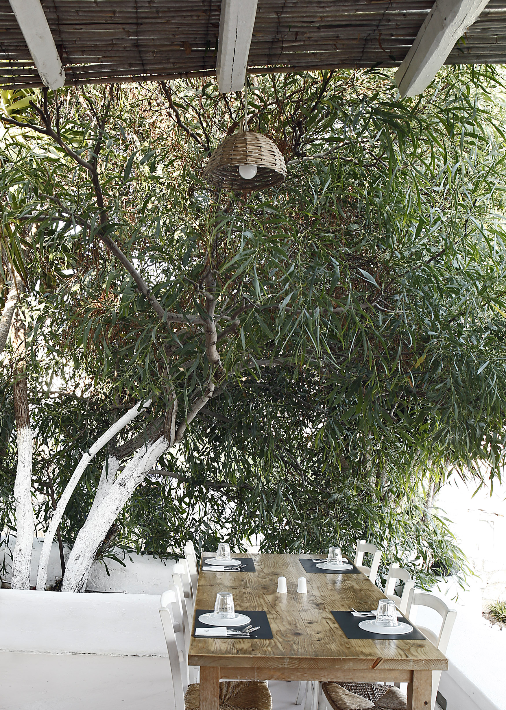 Ο ορισμός “Beach Bar”, νομίζω πως αδικεί λίγο τη συγκεκριμένη επιχείρηση αφού είναι πολλά περισσότερα από αυτό. Από ψηλά, κατεβαίνοντας το μονοπάτι προς την παραλία του Κέδρου, είναι μια πράσινη όαση μέσα στο στεγνό, κυκλαδίτικο τοπίο. Τα μποστάνια με τις βιολογικές καλλιέργειες κυκλώνουν το σεμνό, ταιριαστό απόλυτα με το περιβάλλον, κτίσμα, λίγα μόλις μέτρα και μια ξερολιθιά απόσταση από την απαλή αμμουδιά της παραλίας. Κάτω από τις αραιές καλαμιές που επιτρέπουν το φως του ήλιου να περνά τις ακτίνες του δημιουργώντας μια ατμόσφαιρα αποικιακού τύπου, στιβαροί ξύλινοι πάγκοι αλλά και διάσπαρτα μικρότερα τραπέζια φιλοξενούν την ησυχία και την όρεξη των
