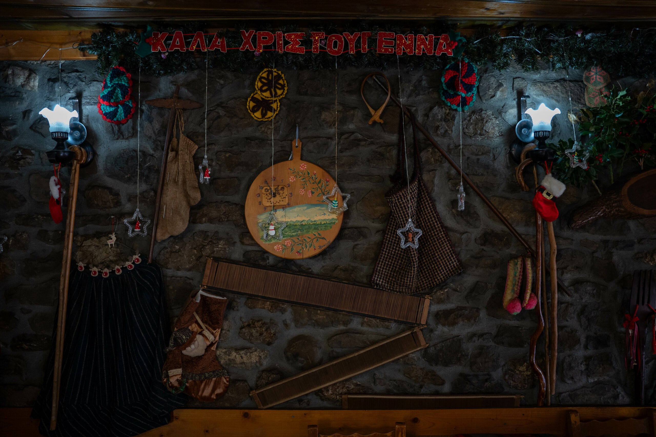 Δεν είσαι σε καφενείο. Είσαι στο σαλόνι του σπιτιού τους. Εδώ, ο χρόνος κινείται με τους δικούς του ρυθμούς. Οι τοίχοι φιλοξενούν όχι διακοσμητικά, αλλά εργαλεία και υφαντά που κάποτε ήταν καθημερινή ανάγκη και τη μνήμη τεσσάρων γενεών.