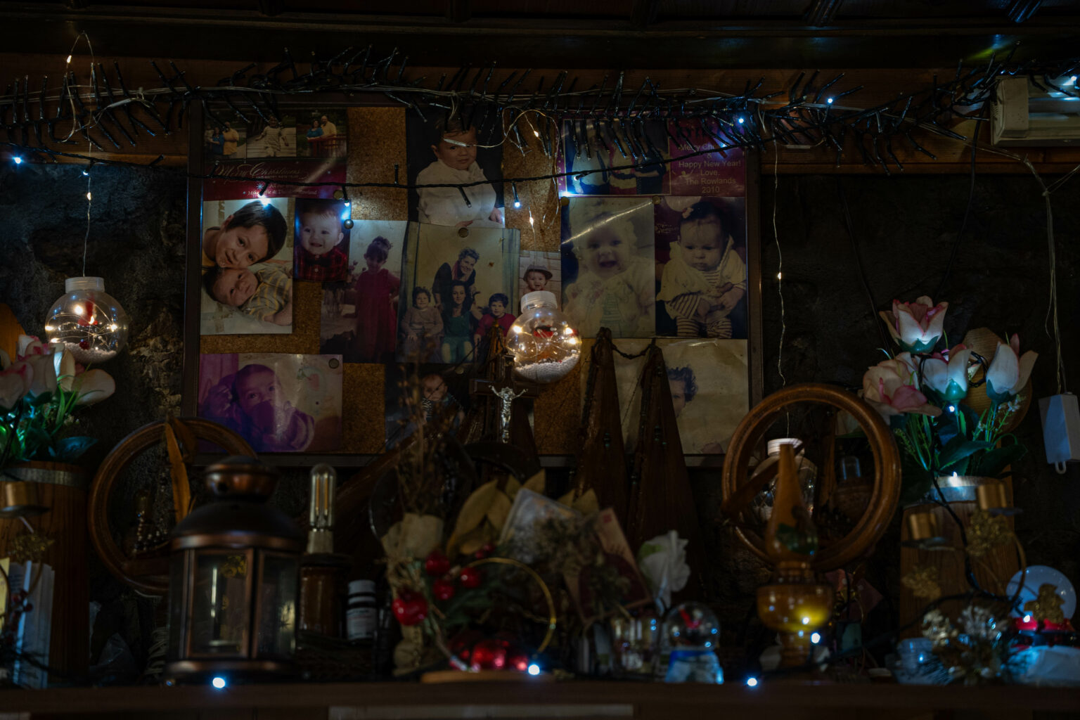 Χρειάζονται μερικά δευτερόλεπτα για να προσαρμοστούν τα μάτια στο ημίφως. Χριστουγεννιάτικα στολίδια κρέμονται από τις σκοτεινιασμένες δοκούς, αστέρια, γιρλάντες, μικρά φωτάκια που αναβοσβήνουν απαλά. Οι τοίχοι είναι φορτωμένοι με κορνίζες: οικογενειακές φωτογραφίες από βαφτίσια, γάμους, πανηγύρια. Ο παππούς Πέτρος νέος, με μουστάκι. Η Αλίκη με την προίκα της. Η Δήμητρα μικρή, να παίζει στην πλατεία.