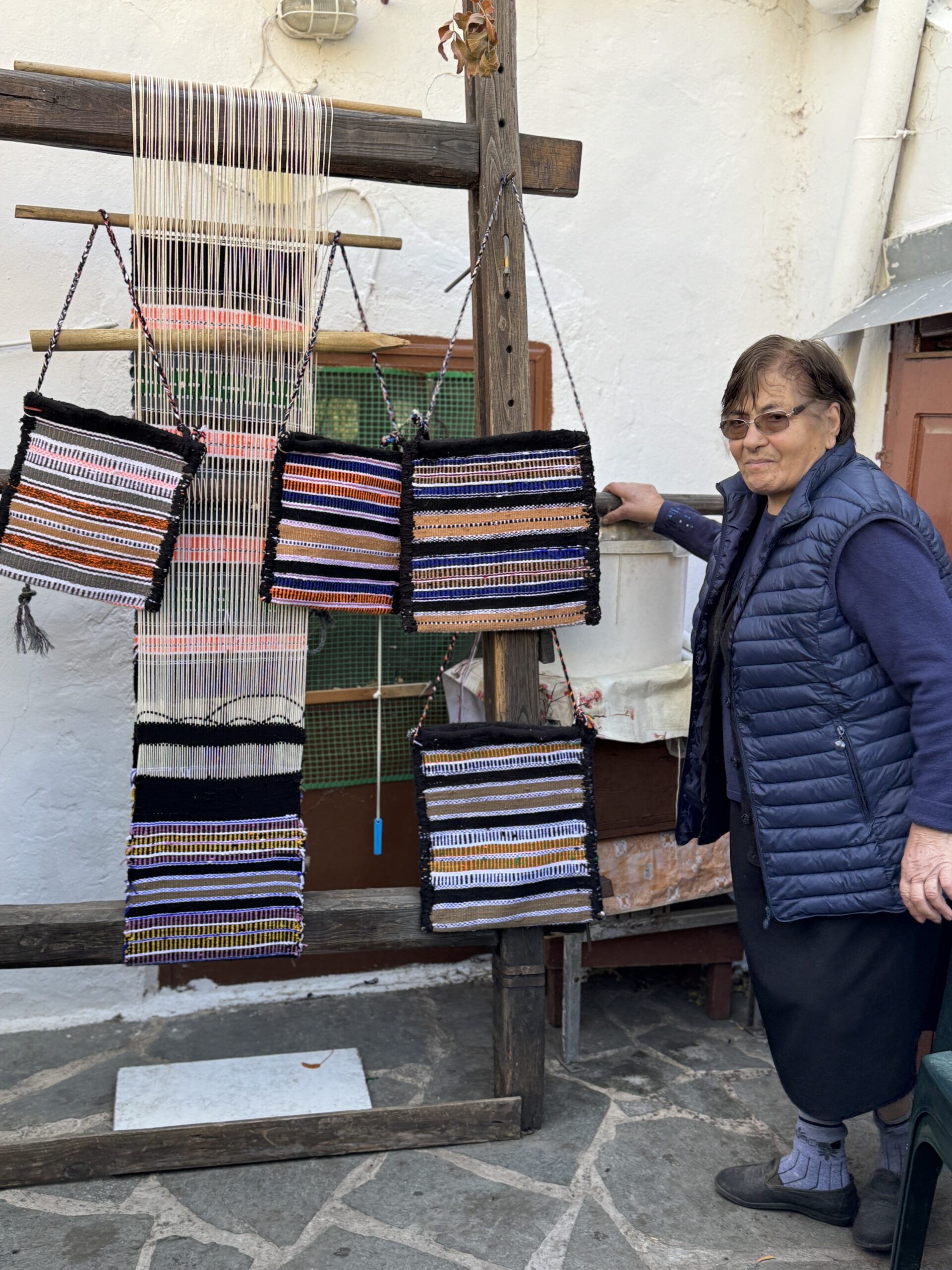 Όμως, η καρδιά του χωριού χτυπά στον παραδοσιακό ξυλόφουρνο του κυρ Γιάννη. «Σήμερα έχουμε τα νεύρα μας, δεν έχει νερό το χωριό», μας λέει αρχικά με μια γκριμάτσα που γρήγορα μετατρέπεται σε χαμόγελο. Η μυρωδιά του φρεσκοψημένου ψωμιού γεμίζει τον αέρα, ενώ τα περίφημα παξιμάδια του, που έχουν κάνει το Πιτυός γνωστό σε όλη τη Χίο, στοιβάζονται σε ξύλινα τελάρα. Στην αυλή του φούρνου, μια άλλη έκπληξη μας περιμένει. Η σύζυγος του κυρ Γιάννη, η κυρία Δέσποινα, στέκεται μπροστά σε έναν κάθετο αργαλειό, διατηρώντας ζωντανή μια ακόμη παραδοσιακή τέχνη. Καθώς δοκιμάζουμε το ζεστό ψωμί, ο κυρ Γιάννης ξετυλίγει ιστορίες από τα παλιά, για ένα χωριό που παρά τις δυσκολίες – όπως η σημερινή έλλειψη νερού – επιμένει να κρατά ζωντανές τις παραδόσεις του.