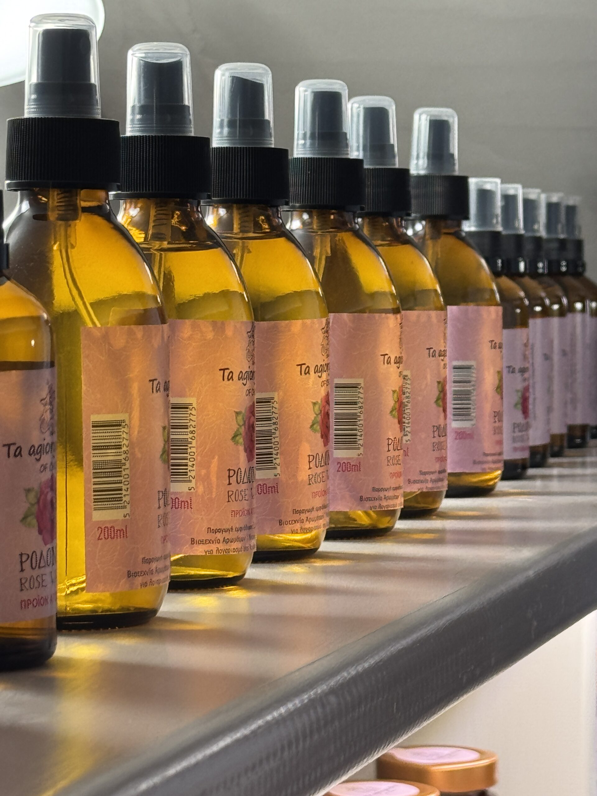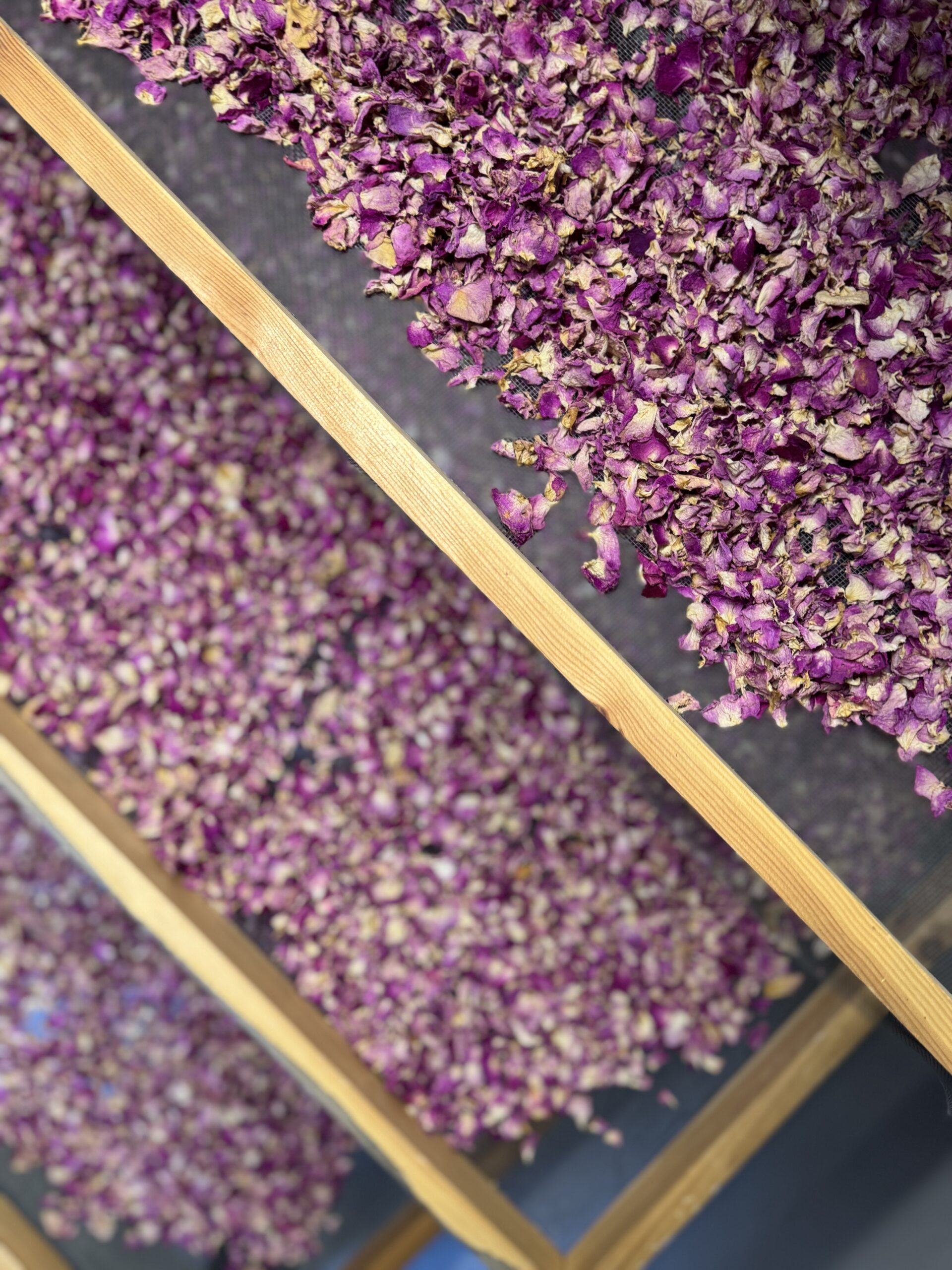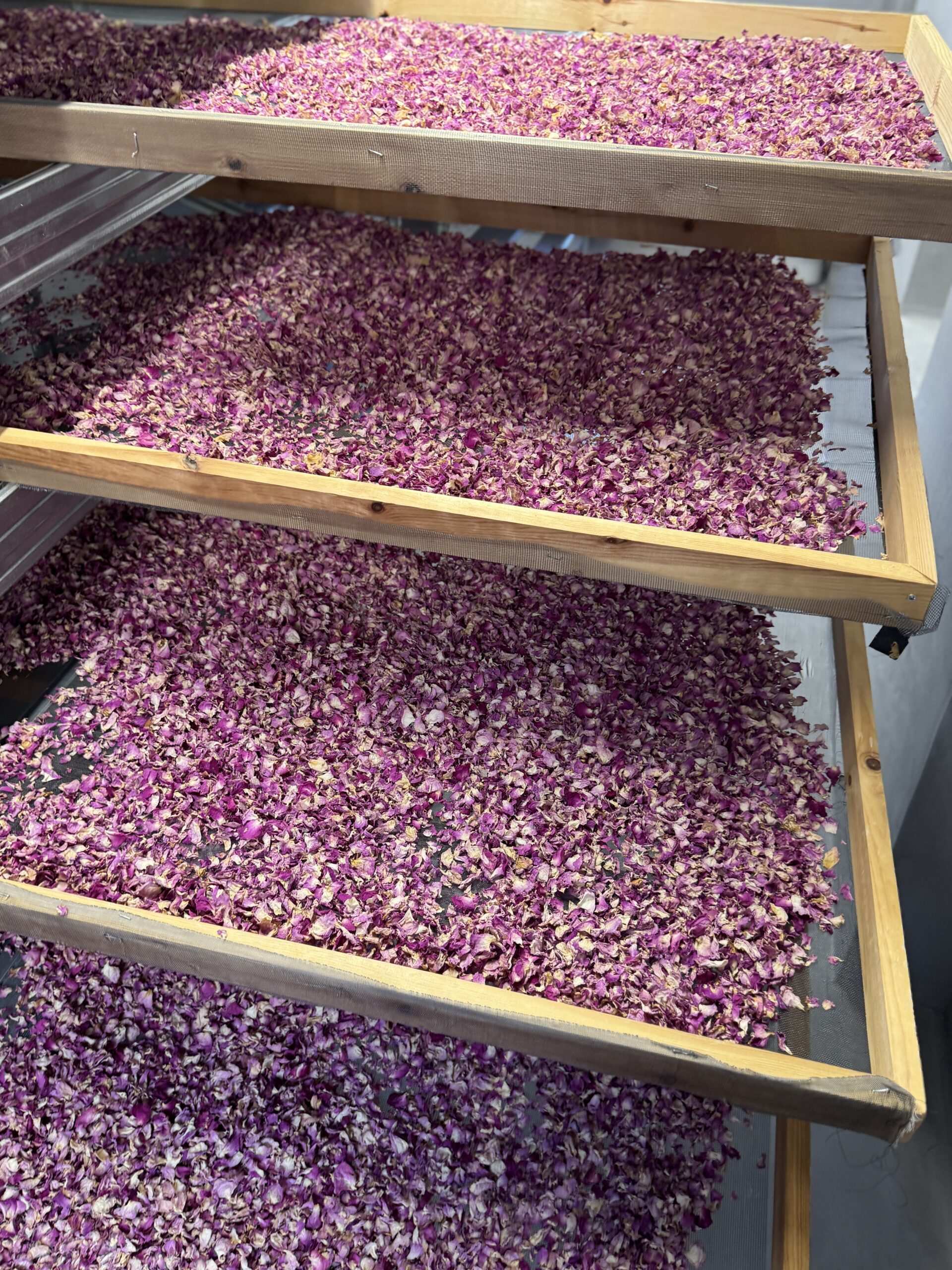 «Κάθε είδος τριαντάφυλλου έχει τη δική του προσωπικότητα», μας εξηγεί ο κύριος Νίκος καθώς ανεβαίνουμε στους επόμενους ορόφους. «Το απριλιάτικο, το μαγιάτικο, το εκατόφυλλο -το καθένα προσφέρει διαφορετικές γευστικές και αρωματικές νότες». Η περιήγηση κορυφώθηκε στον τρίτο όροφο, το ξηραντήριο, όπου αντικρίσαμε τα απλωμένα ροδοπέταλα σε διάφορα στάδια αποξήρανσης -μια εικόνα και μια μυρωδιά που θα μας συνοδεύει για καιρό. Η οικογένεια Κύλη δεν έχει μείνει στην παράδοση. Αξιοποιώντας σύγχρονες μεθόδους, έχουν επεκτείνει τη χρήση του τριαντάφυλλου πέρα από το κλασικό γλυκό του κουταλιού. Δοκιμάσαμε το αρωματικό τους αφέψημα -που μπορεί να καταναλωθεί ζεστό ή κρύο- το λικέρ τριαντάφυλλο και το αγνό ροδόνερο, ενώ εντυπωσιαστήκαμε από τη σειρά καλλυντικών που έχουν αναπτύξει.