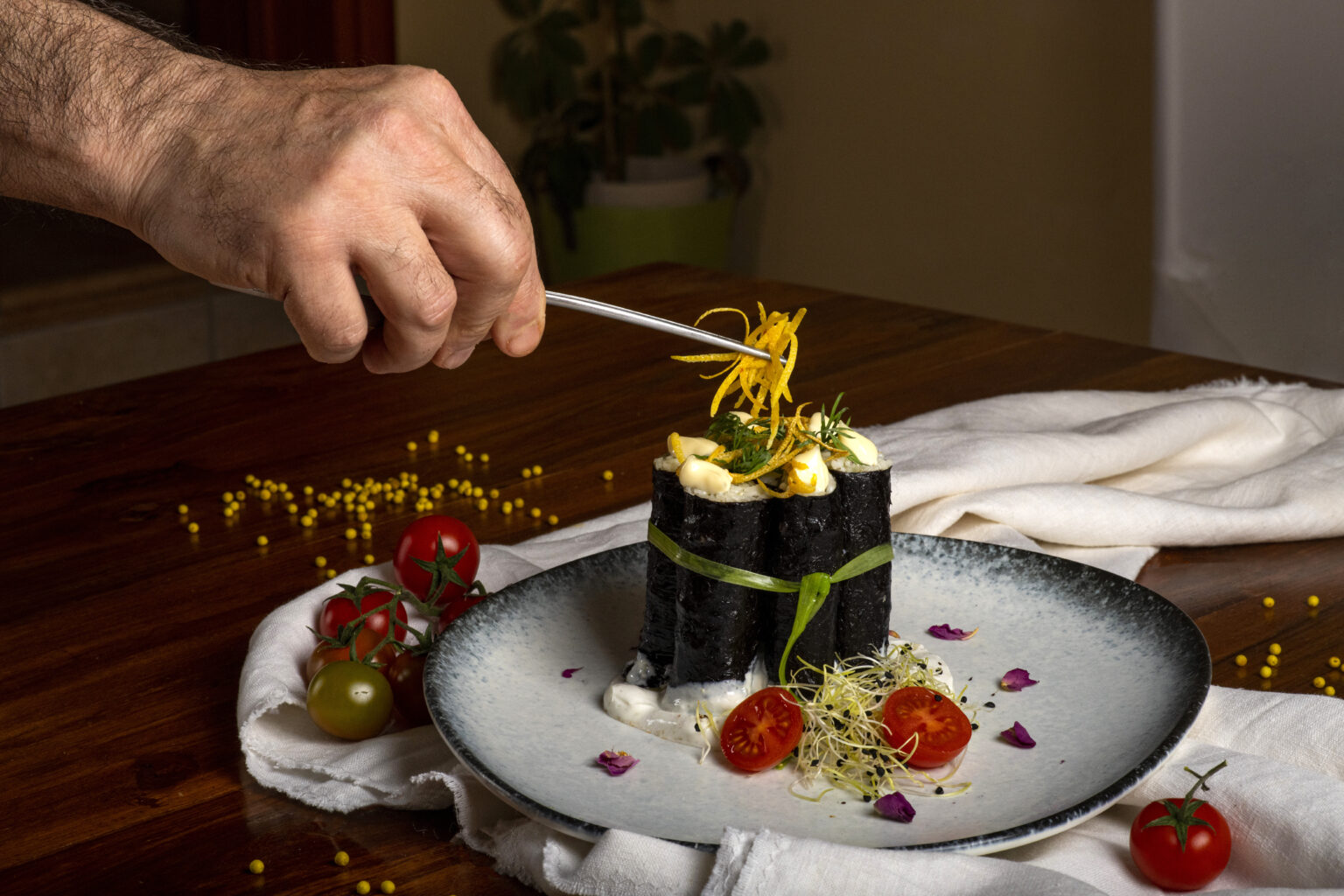 Απλώνουμε γρήγορα σε ένα μεγάλο ταψί και το βάζουμε στο ψυγείο να κρυώσει. Αφού κρυώσει, προσθέτουμε αλάτι, πιπέρι, το μιριν, το ξύδι και ανακατεύουμε. Παίρνουμε το μπαμπού που τυλίγουμε σούσι, βάζουμε στη μέση ένα φύλλο φύκι απλώνουμε το ρύζι και τυλίγουμε σφιχτά. Κόβουμε σε μικρότερα κομμάτια και σερβίρουμε με κρέμα γιαούρτι σόγιας και wasabi.