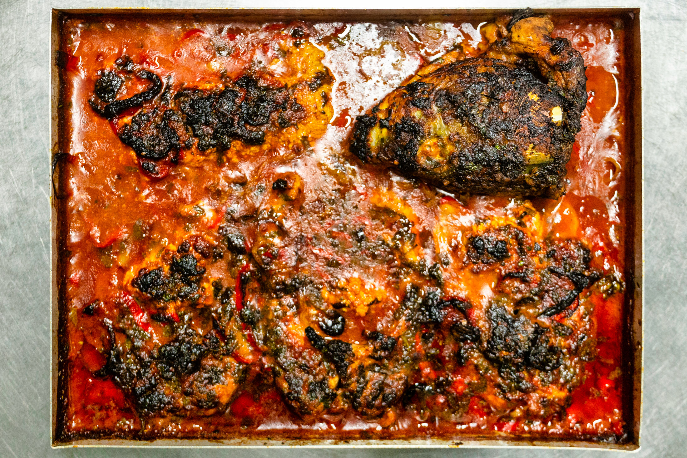 Στο ταψί και στον φούρνο δηλαδή, μαζί με ψιλοκομμένες πατάτες, τομάτες και πιπεριές, ενώ το σκόρδο, η τριμμένη φρυγανιά και το κόκκινο πιπέρι δίνουν ξεχωριστή γεύση στο αποτέλεσμα.