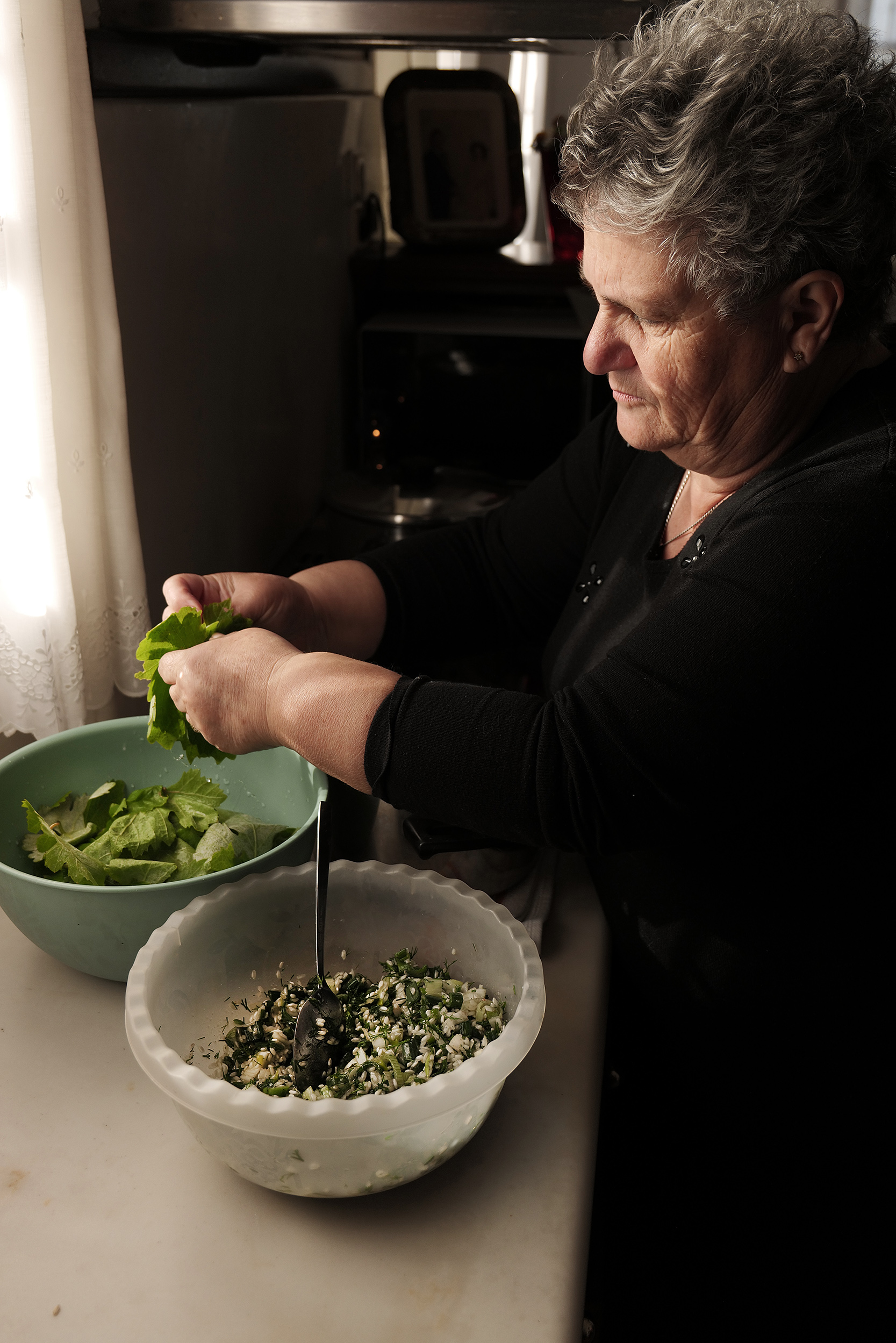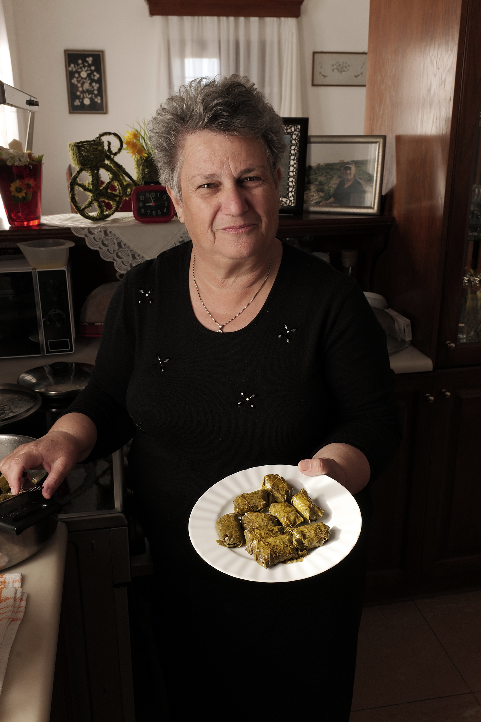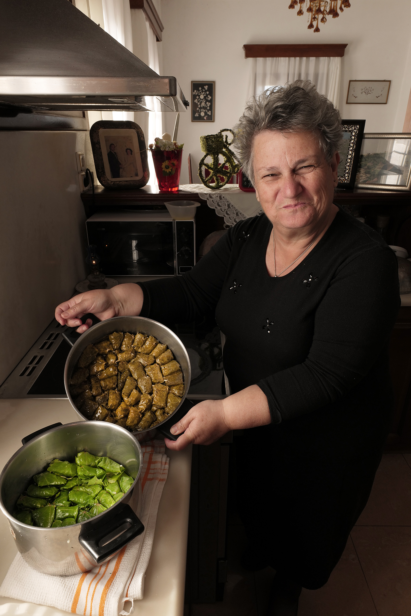 Ο βαθύς σεβασμός στην παράδοση είναι έκδηλος, εξάλλου η κ. Πελεκάνου είναι ο άνθρωπος που κινητοποιεί όλο το Μεγαλοχώρι για τη θεαματική αναβίωση του πασχαλινού εθίμου της ύψωσης του Λαζάρου κάθε χρόνο, στρέφοντας όλα τα βλέμματα του νησιού στο χωριό της το Σάββατο πριν από την Ανάσταση. Δουλεύοντας επί μέρες ασταμάτητα πλέκει στο χέρι τα «βαγίδια», σταυρούς από φοινικόφυλλα σε διάφορα μεγέθη, αφού τα μεγάλα στολίζουν εκκλησίες και αυλές σπιτιών, ενώ τα μικρά σταυρουδάκια μοιράζονται στους πιστούς μετά τη λειτουργία. Μας δείχνει βίντεο στο κινητό της και αφήνοντάς μας έκπληκτους, δηλώνει χωρίς έπαρση ότι το φετινό Πάσχα έφτιαξε 130 βαγίδια και μαγείρεψε 400 γιαπράκια που μοιράστηκαν σε όσους παρευρέθηκαν στο στολισμό του Λαζάρου στο Μεγαλοχώρι. Πιθανολογούμε με την ίδια άνεση που ετοίμασε άλλη μια κατσαρόλα όσο μιλάμε: τρεις στρώσεις, το ανάλογο νερό που πάντα προστίθεται σε σωστή αναλογία, μια σειρά αμπελόφυλλα κι ένα αναποδογυρισμένο πιάτο για να τα συγκρατεί στη θέση τους. Υψηλή θερμοκρασία μέχρι να πάρουν βράση κι ύστερα χαμηλότερη, ώσπου σε 20΄να είναι έτοιμα. Και πεντανόστιμα, θα προσθέσουμε απολαμβάνοντας σαν δεκατιανό τα πρώτα πρωινά, καθισμένοι όλοι μαζί στο φιλόξενο οικογενειακό τραπέζι.