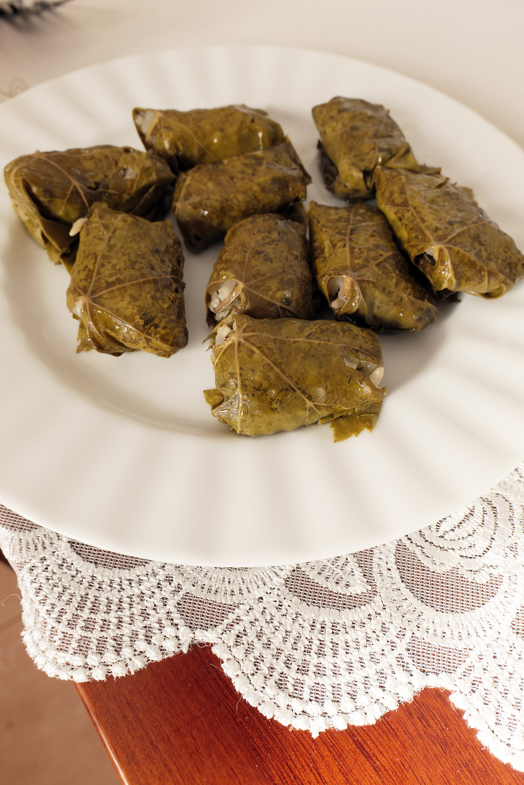 «Κτηνοτροφία δεν είχε ποτέ το νησί» μας πληροφορεί η κα Μαρία, τυλίγοντας με ταχύτητα το μείγμα ρυζιού και μυρωδικών στα πλυμένα αμπελόφυλλα, τα οποία, σημειωτέον, δεν ζεματίζει προηγουμένως. «Τα παλιά χρόνια είχαμε αρκετή φάβα, τις ντομάτες μας που το ηφαιστειογενές έδαφος έκανε πεντανόστιμες και μελιτζάνες πράσινες που δεν βγαίνουν πια. Είχαμε φέσκουλα -έτσι λέμε εδώ τα σέσκουλα- που τα κάναμε ωραιότατους τηγανητούς κεφτέδες, όπως και τις ντομάτες, και τους έπαιρναν οι εργάτες στα αμπέλια και τα παιδιά στο σχολείο για κολατσιό. Και τούτο δω το φαγητό, τα γιαπράκια όπως αποκαλούμε τα ντολμαδάκια γιαλαντζί στη Σαντορίνη, καμιά φορά μόνο τα έφτιαχναν με μοσχαρίσιο κιμά. Ως φαγητό της φτωχικής κουζίνας γίνονταν συνήθως σκέτα, με ρύζι ή με πελτέ ντομάτας που είχε κάθε Σαντορινιά στην κουζίνα της. Φαγάκι νόστιμο, απλό, οικονομικό και νηστίσιμο».