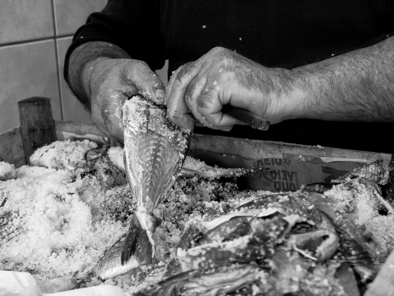 Γιατί μπορούν να ρυθμίζουν και την αλμυρότητα, αφήνοντας τα ψάρια λιγότερες ώρες στο αλάτι, είκοσι ή ακόμη και δεκαοκτώ, αν τα θέλουν λιγότερο αλμυρά. Το αλάτι που χρησιμοποιούν είναι η αφρίνα, ο πολύ δυνατός και λεπτός αφρός που συσσωρεύει ο αγέρας στις άκρες καθώς σαρώνει την επιφάνεια των «τηγανιών» και μαζεύουν με τα χέρια. Καθώς το αλάτι στραγγίζει το υποδόριο λίπος, το δέρμα είναι εύκολο να αφαιρεθεί. Τα γδαρμένα ψάρια, αν είναι μικρά ολάκερα αν είναι μεγαλύτερα φιλεταρισμένα, μπαίνουν πριν πέντε λεπτά στο χυμό του λεμονιού για να ασπρίσουν και μετά να σερβιριστούν με ελαιόλαδο.