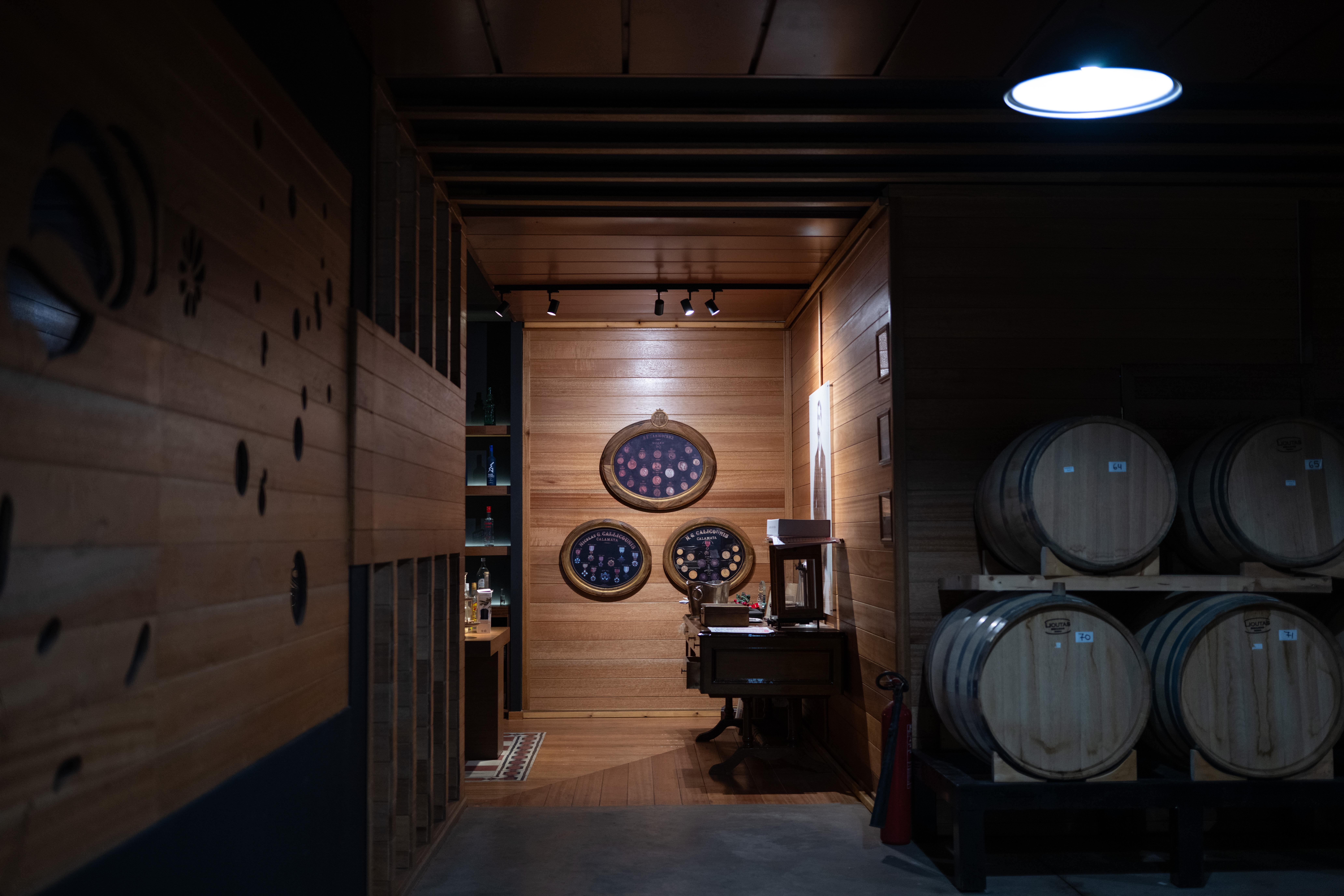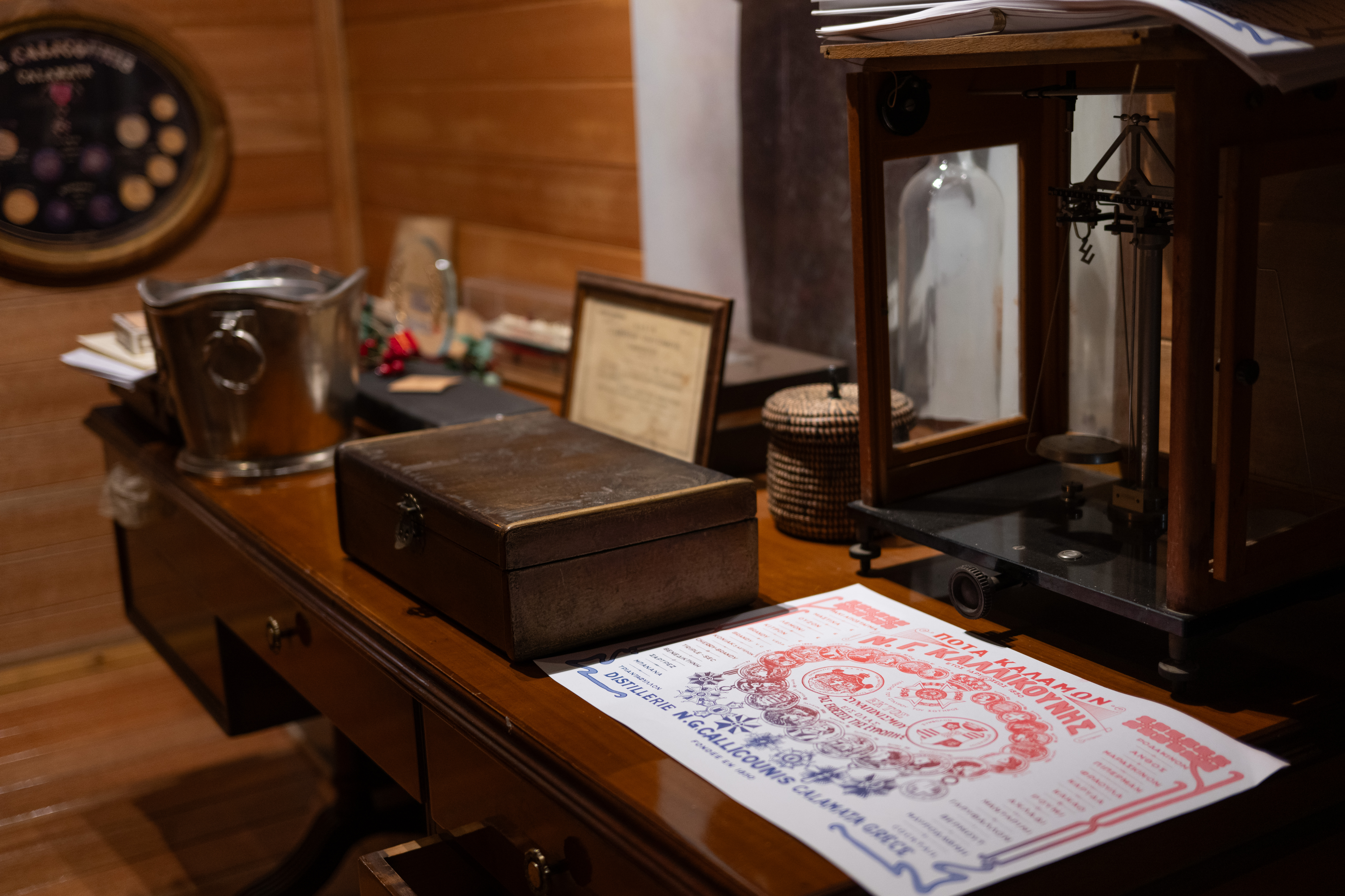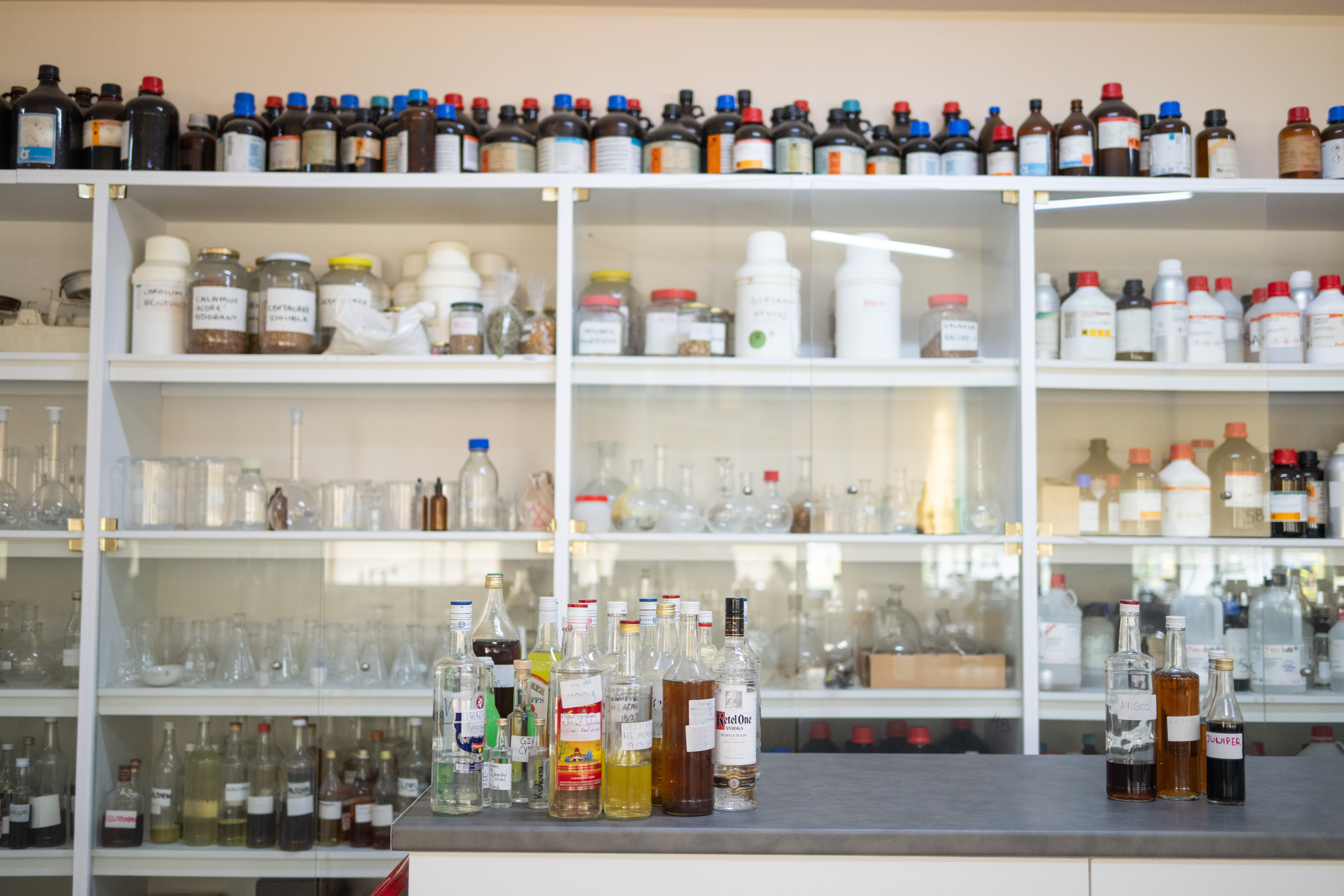 Το αποστακτήριο μοιάζει με ζωντανό μουσείο όπου το παρελθόν και το παρόν συνυπάρχουν σε τέλεια αρμονία. Στο χημείο, μικρά μπουκαλάκια με αποστάγματα και δοκιμαστικοί σωλήνες γεμίζουν τα ράφια -κάποιες συνθέσεις χρονολογούνται από δεκαετίες πριν, άλλες αναπτύσσονται για νέα προϊόντα. Αυτά είναι τα δομικά στοιχεία των χαρακτηριστικών γεύσεων τους. «Η χημεία ήταν πάντα θεμελιώδης για την επιχείρησή μας», εξηγεί ο κ. Καλλικούνης, καθώς εξετάζουμε το εργαστήριο. «Ο πρόγονός μου σπούδασε χημεία στην Τεργέστη πριν ιδρύσει αυτή την επιχείρηση. Έκτοτε κάθε γενιά διατήρησε αυτή την επιστημονική προσέγγιση τιμώντας παράλληλα τις παραδοσιακές μεθόδους». Σε όλη την εγκατάσταση, γυάλινες προθήκες παρουσιάζουν προϊόντα από την εποχή ίδρυσης της εταιρείας -πρωτότυπα μπουκάλια, ετικέτες και εξοπλισμό που έχουν διατηρηθεί προσεκτικά. Κορνιζαρισμένα βραβεία κρέμονται στους τοίχους, αφηγούμενα την ιστορία της διεθνούς αναγνώρισης που χρονολογείται από τον 19ο αιώνα.