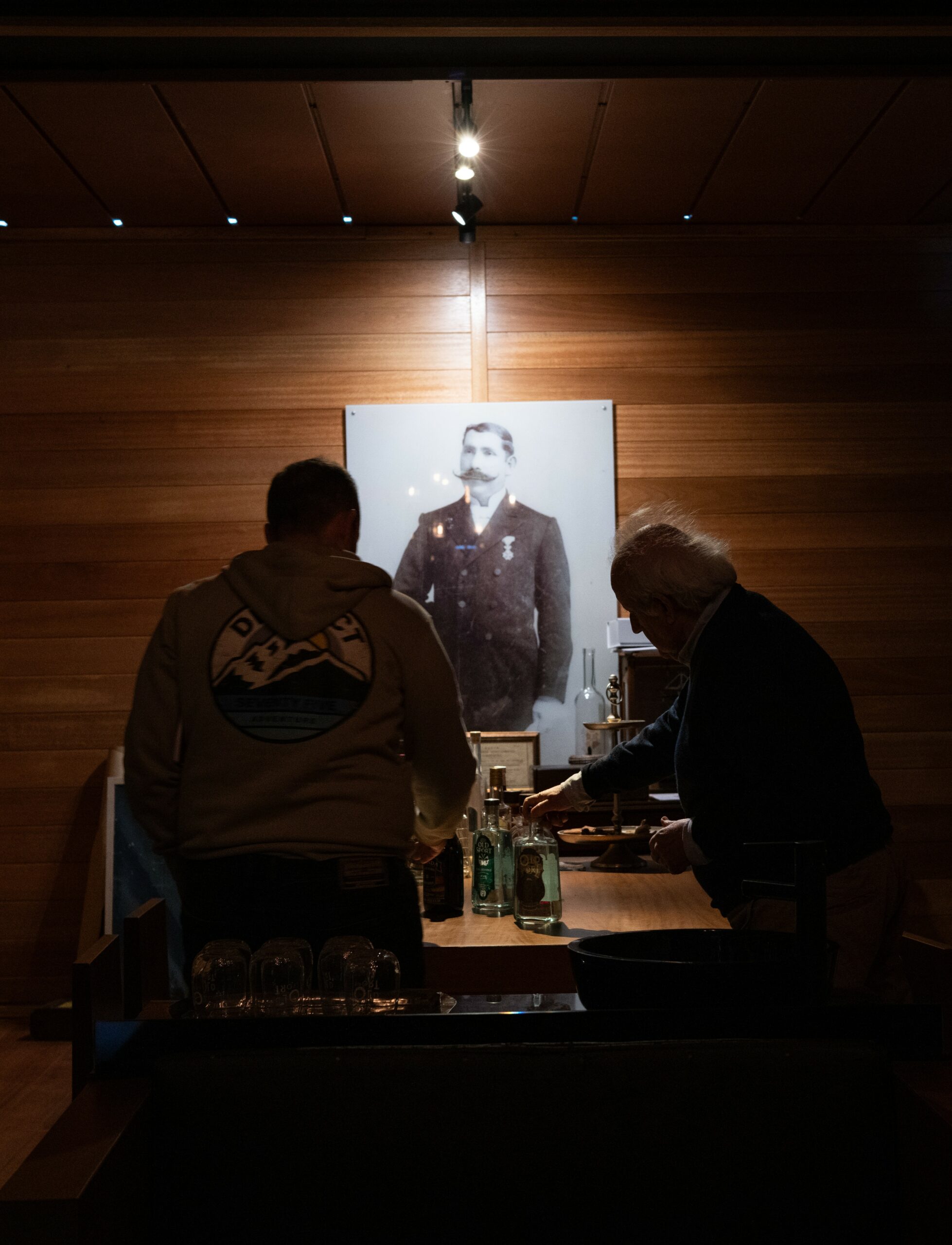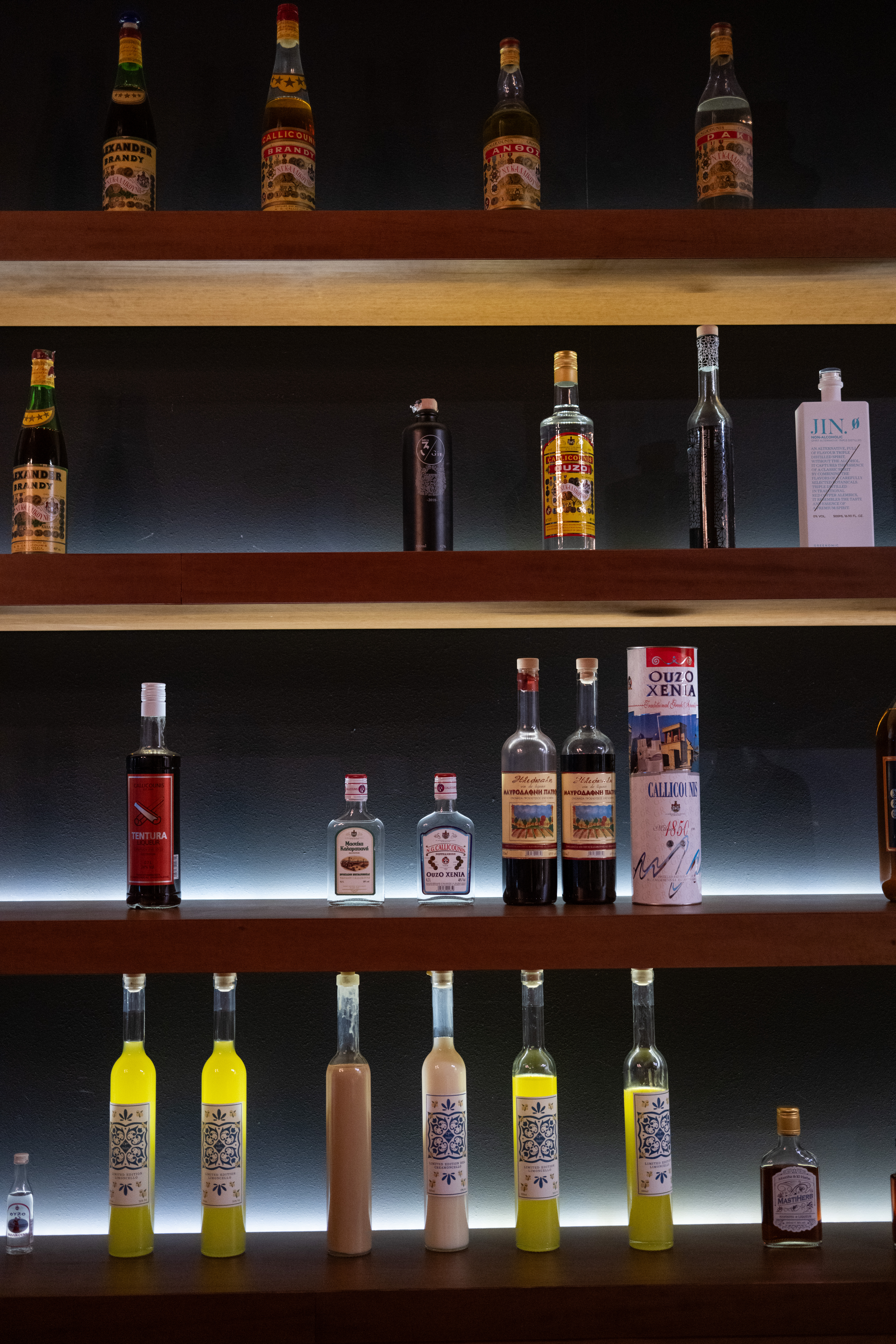 Η περιήγησή μας κορυφώνεται σε μια αίθουσα γευσιγνωσίας όπου προθήκες παρουσιάζουν την τρέχουσα γκάμα προϊόντων της εταιρείας μαζί με ιστορικά μπουκάλια. Ο κ. Καλλικούνης, παρατάσσει αρκετά χαρακτηριστικά μπουκάλια για δοκιμή –Old Sport Gin, Vermouth Pikron βασισμένο σε συνταγή του 1905, αρωματικά βότανα bitters, και το στολίδι τους, το Brandy Alexander.