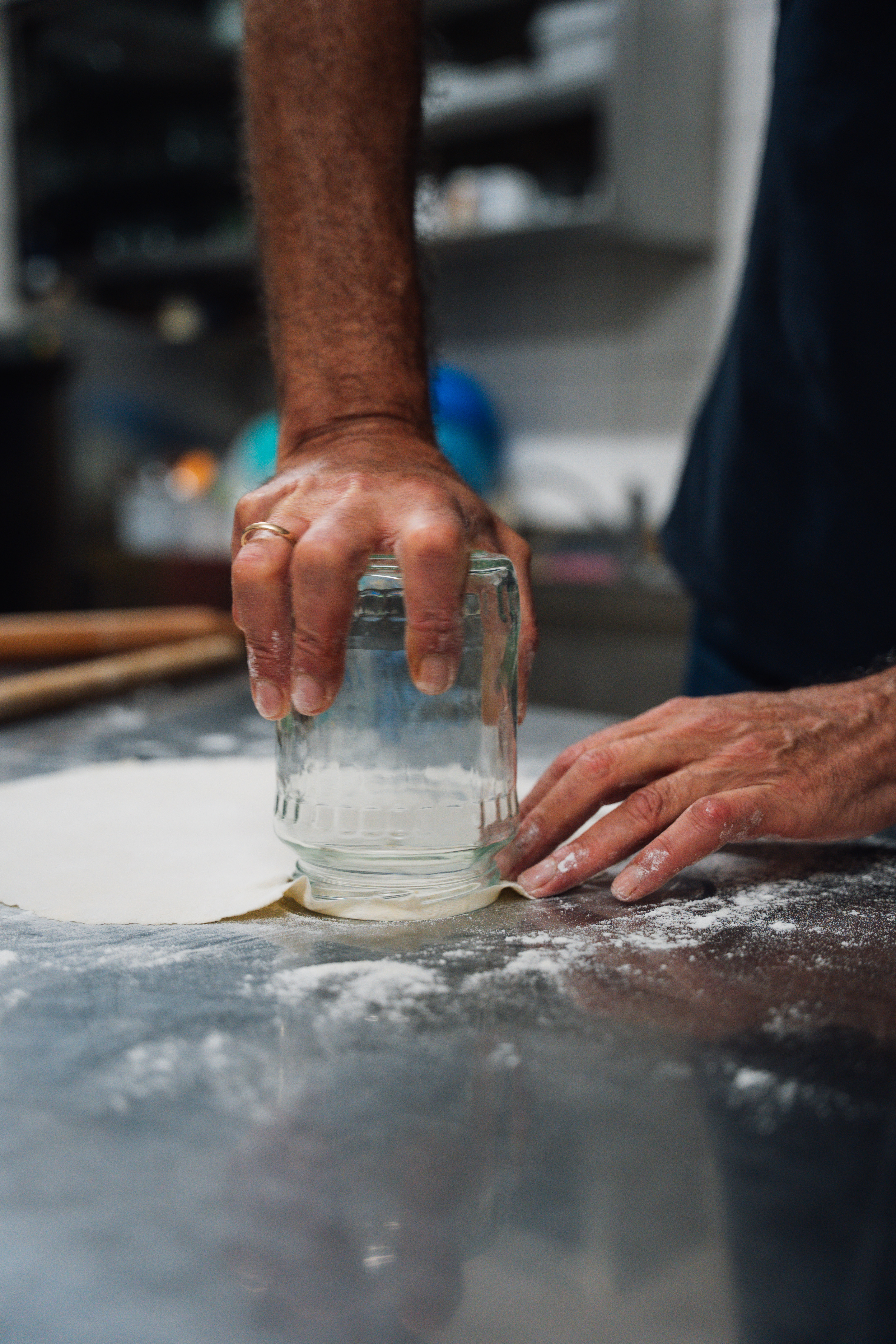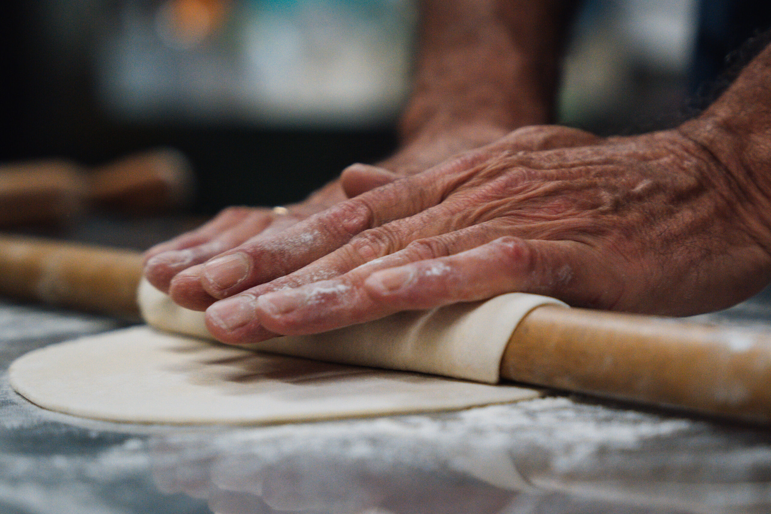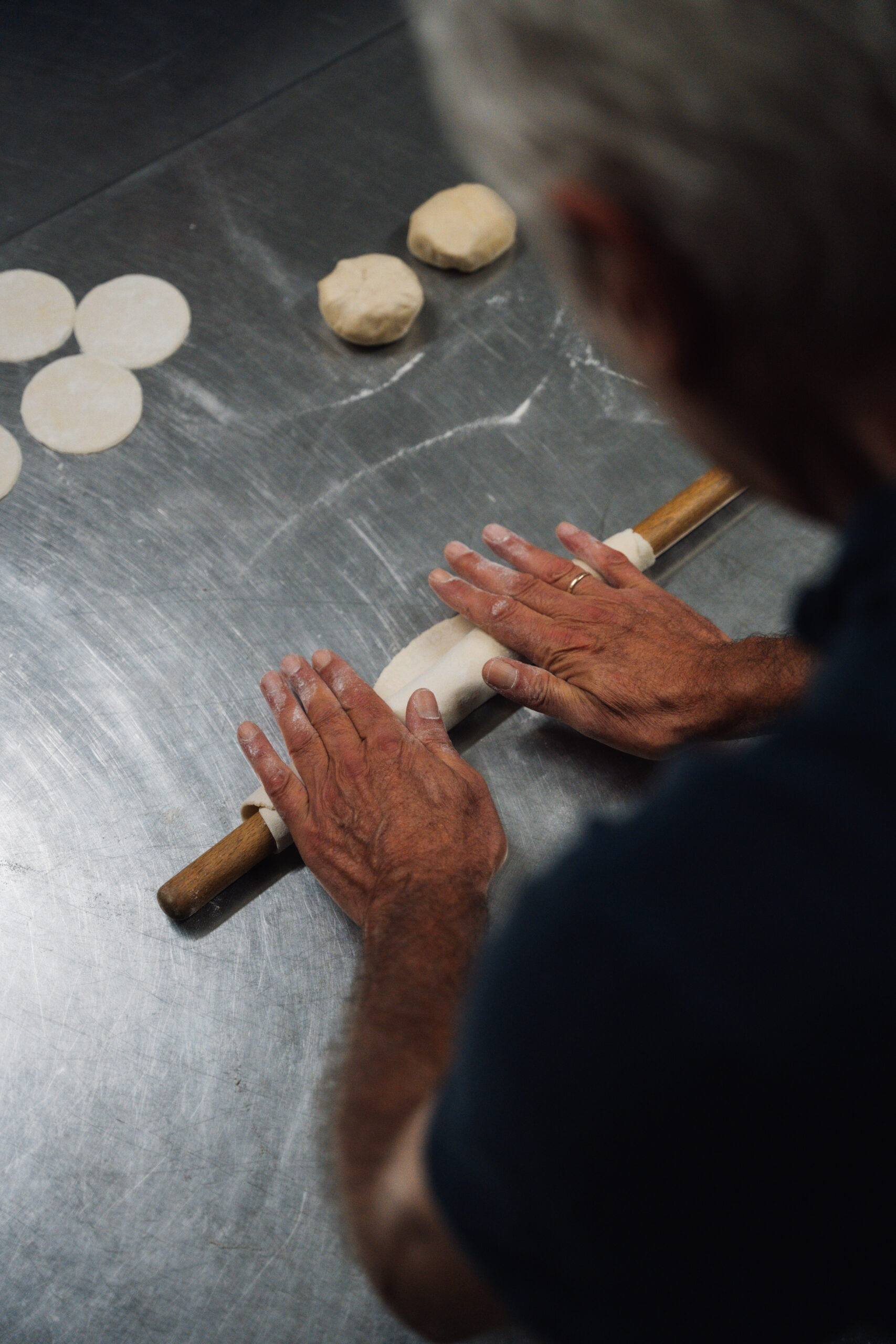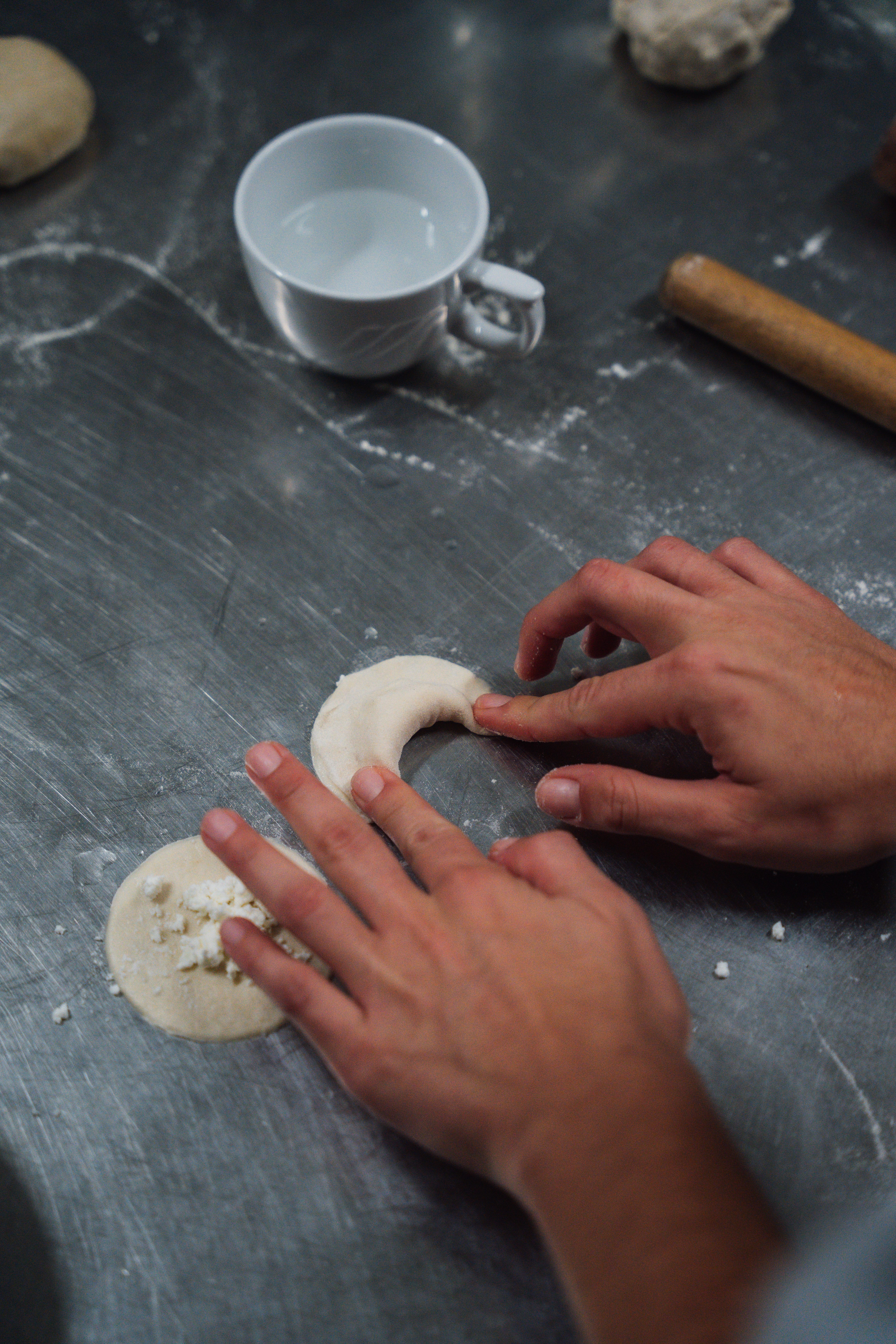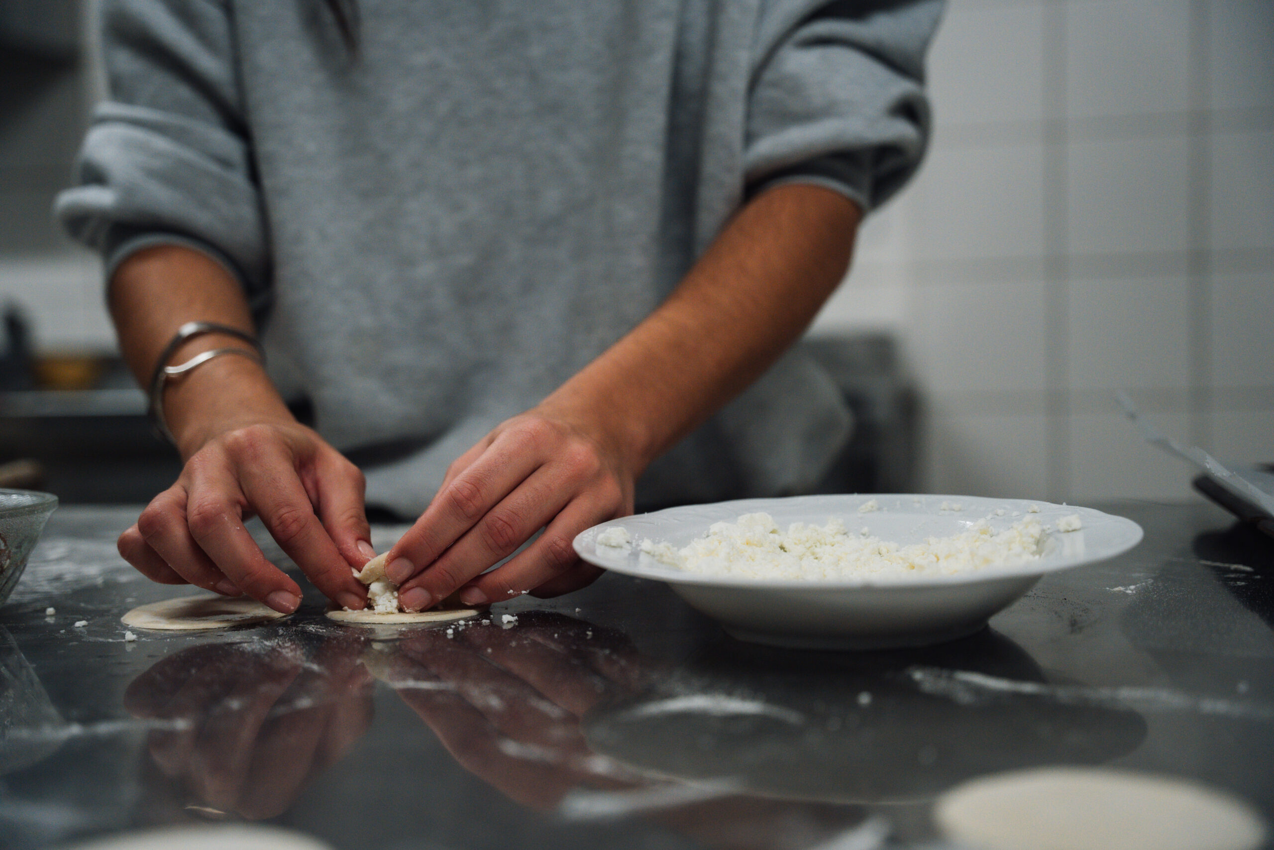 Η διαδικασία παρασκευής του μαντί είναι μια μικρή χορογραφία όπου κάθε κίνηση έχει τη σημασία της. Η Γεωργία, χωρίζει τη ζύμη σε μικρά, ομοιόμορφα μπαλάκια. «Τριάντα λεπτά υπομονή,» μας λέει χαμογελώντας, καθώς αφήνει τη ζύμη να ξεκουραστεί. «Είναι σαν μια μικρή άσκηση διαλογισμού». Στη συνέχεια, με κινήσεις που θυμίζουν περισσότερο τέχνη παρά μαγειρική, ανοίγει τη ζύμη σε λεπτά φύλλα. Το στόμιο ενός γυάλινου βάζου μεταμορφώνεται στα χέρια της σε εργαλείο ακριβείας, καθώς κόβει μικρούς, τέλειους κύκλους. «Στην Ολλανδία, οι φίλοι μου εντυπωσιάζονται από αυτή την τεχνική. Είναι τόσο απλή, μα τόσο αποτελεσματική,» σχολιάζει, ενώ γεμίζει κάθε κύκλο με ένα λεπτοδουλεμένο μείγμα από κιμά και φέτα.