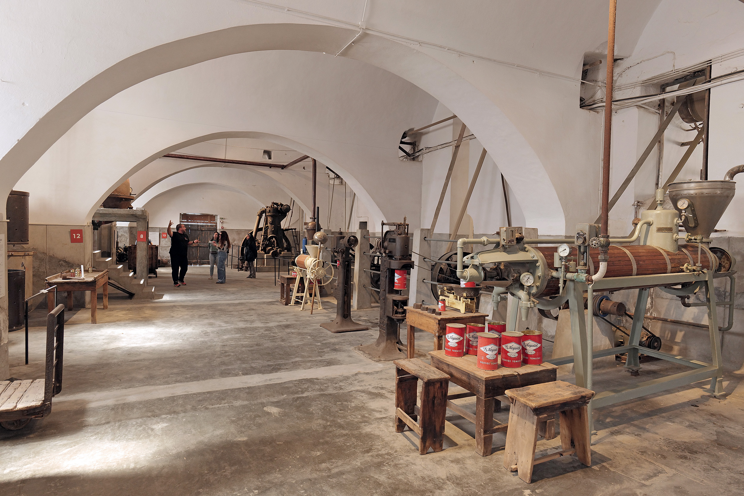 Οι παλιοί χώροι παραγωγής, με φωτογραφίες εποχής στους τοίχους και τα μηχανήματα να μοιάζουν έτοιμα να επαναλειτουργήσουν, προσφέρονται για μια συναρπαστική περιήγηση. Από τους γεμάτους θαλασσινό νερό κάδους πρόπλυσης, ως τα μηχανήματα διαλογής όπου στέκονταν από τέσσερις γυναίκες σε κάθε πλευρά -νεότερες δίπλα σε γηραιότερες για να μαθαίνουν τη δουλειά-, κι από τις «μπόλες», τα μεγάλα καζάνια όπου έβραζε ο χυμός για να συμπυκνωθεί σε ντοματοπολτό ως τη θερμογεμιστική, ένα από τα σημαντικότερα μηχανήματα του εργοστασίου και τη μόνη καθιστή εργασία σε όλη τη γραμμή παραγωγής, ένα διαδραστικό πρόγραμμα επαυξημένης πραγματικότητας ζωντανεύει όλα τα στάδια επεξεργασίας των πολύτιμων καρπών. Διοράματα και άλλα τεχνολογικά μέσα μας επιτρέπουν να συμμετάσχουμε εικονικά, ακόμη και να δούμε τον εαυτό μας στην απαιτητική εργασία της παστερίωσης.
