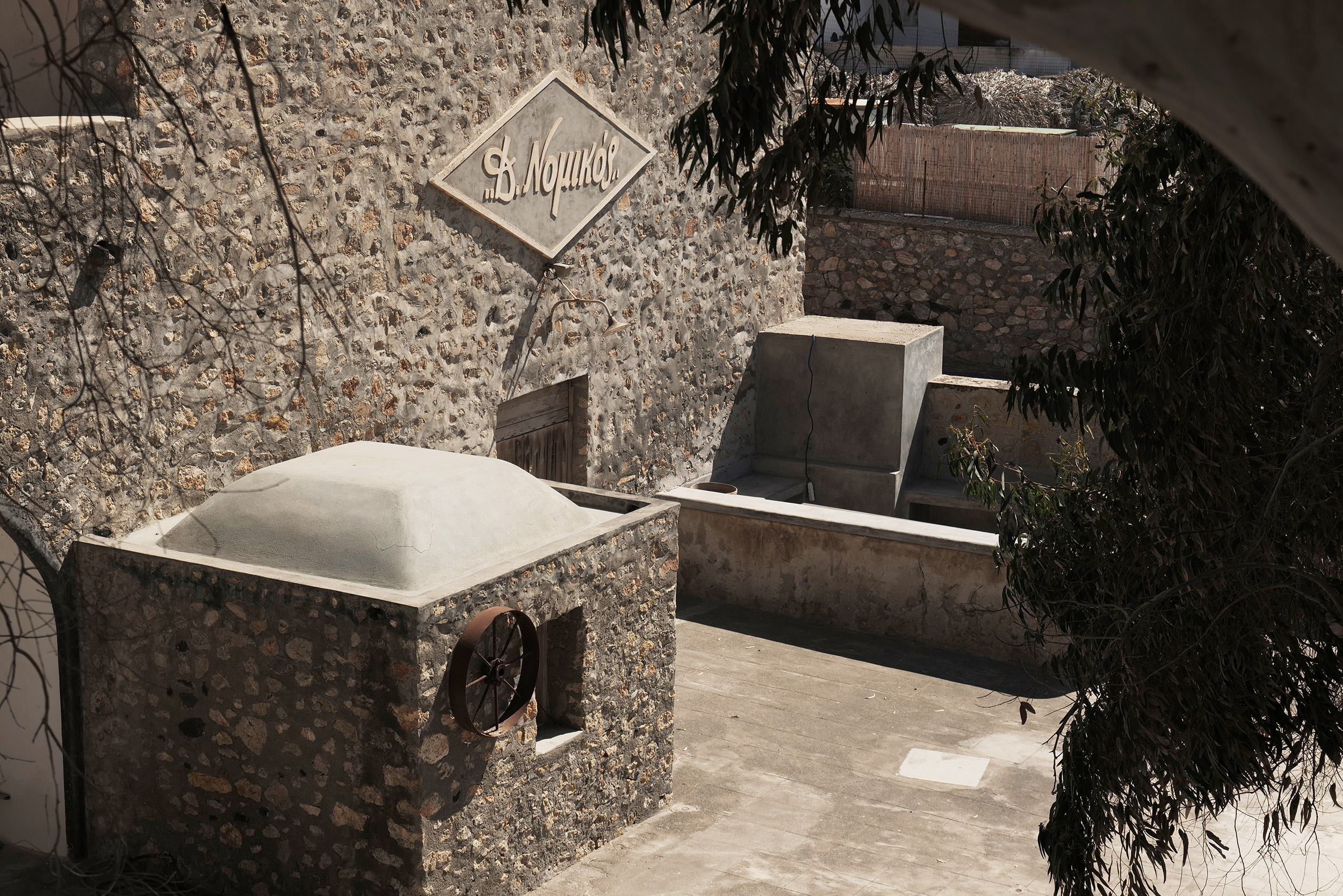 Εκεί, πλάι στη θάλασσα ώστε το θαλασσινό νερό να αξιοποιείται για το πλύσιμο της ντομάτας και την ψύξη των μηχανημάτων, ανάμεσα στο κυρίως εργοστάσιο, το αγέρωχο φουγάρο στα δεξιά, το σπίτι του ιδιοκτήτη που βρισκόταν στον ίδιο χώρο και τις αποθήκες, μπορεί κανείς εύκολα να φανταστεί πώς κάθε καλοκαίρι η ανακαινισμένη πλέον μεγάλη αυλή κοκκίνιζε, καθώς ανά μισή ώρα κατέφθαναν ξυπόλυτοι οι αγρότες απ΄ όλα τα χωριά της Σαντορίνης για να πουλήσουν τις ντομάτες τους μέσα σε κοφίνια 40 οκάδων, δηλαδή περίπου 50 κιλών.
