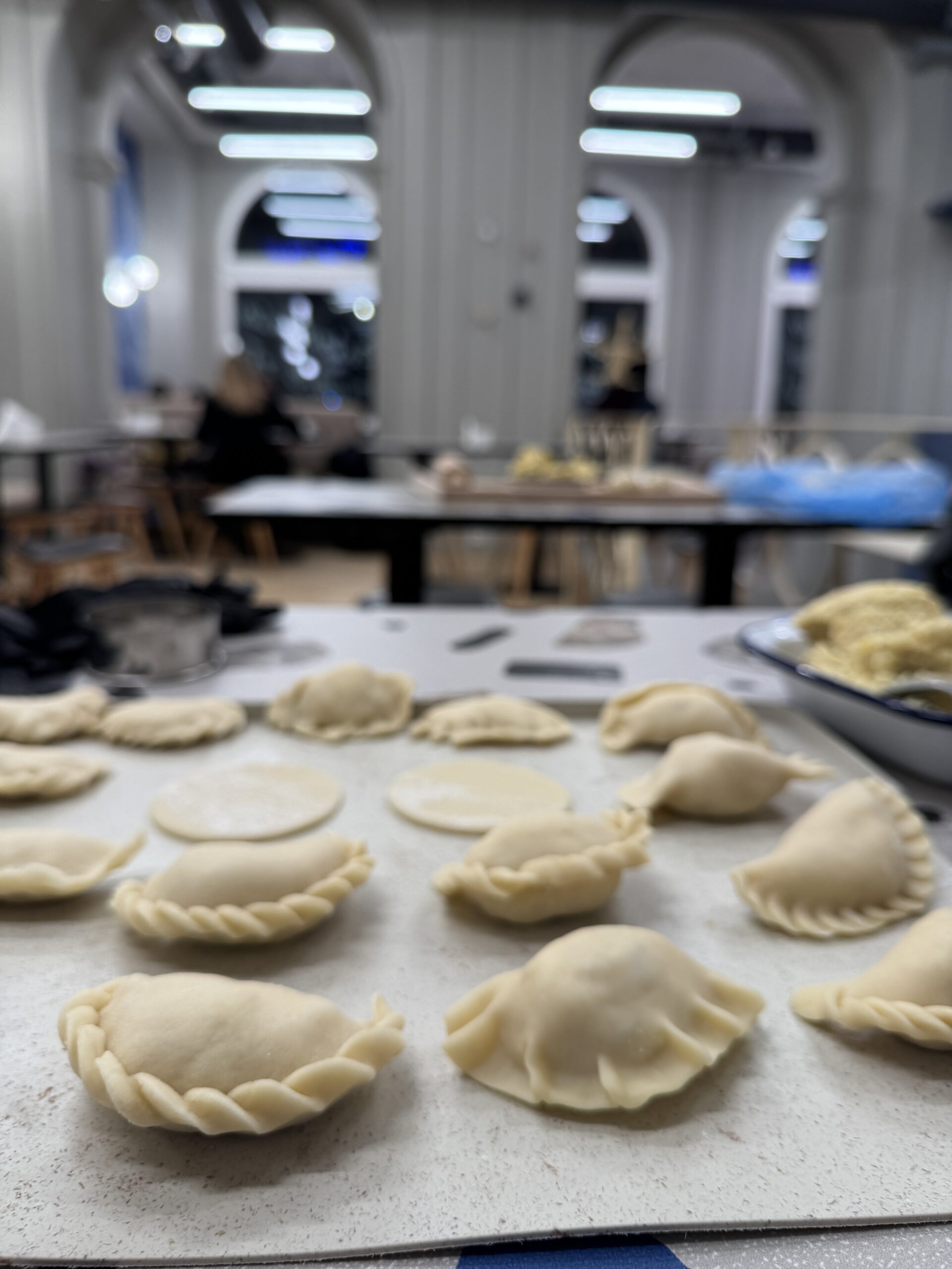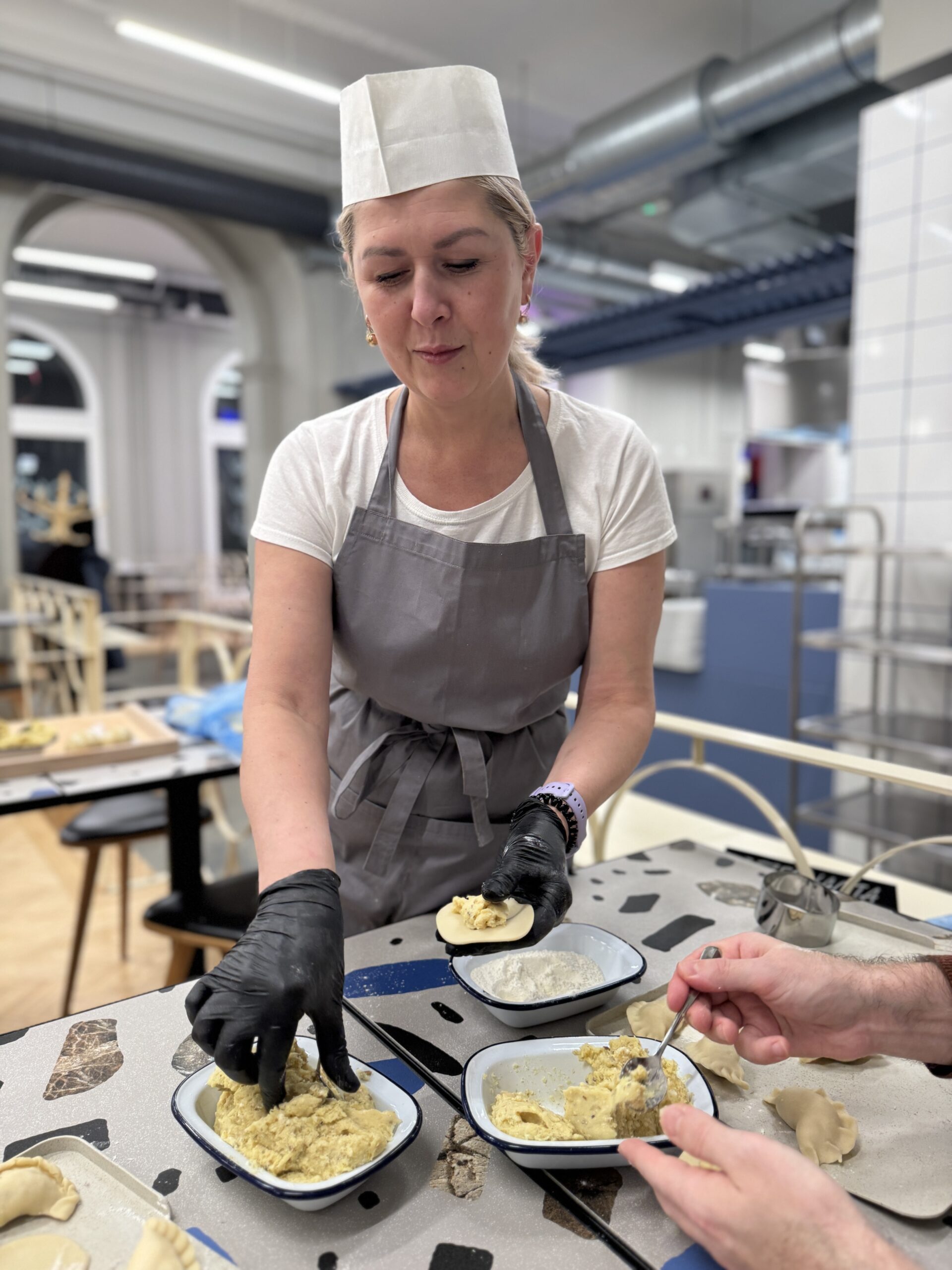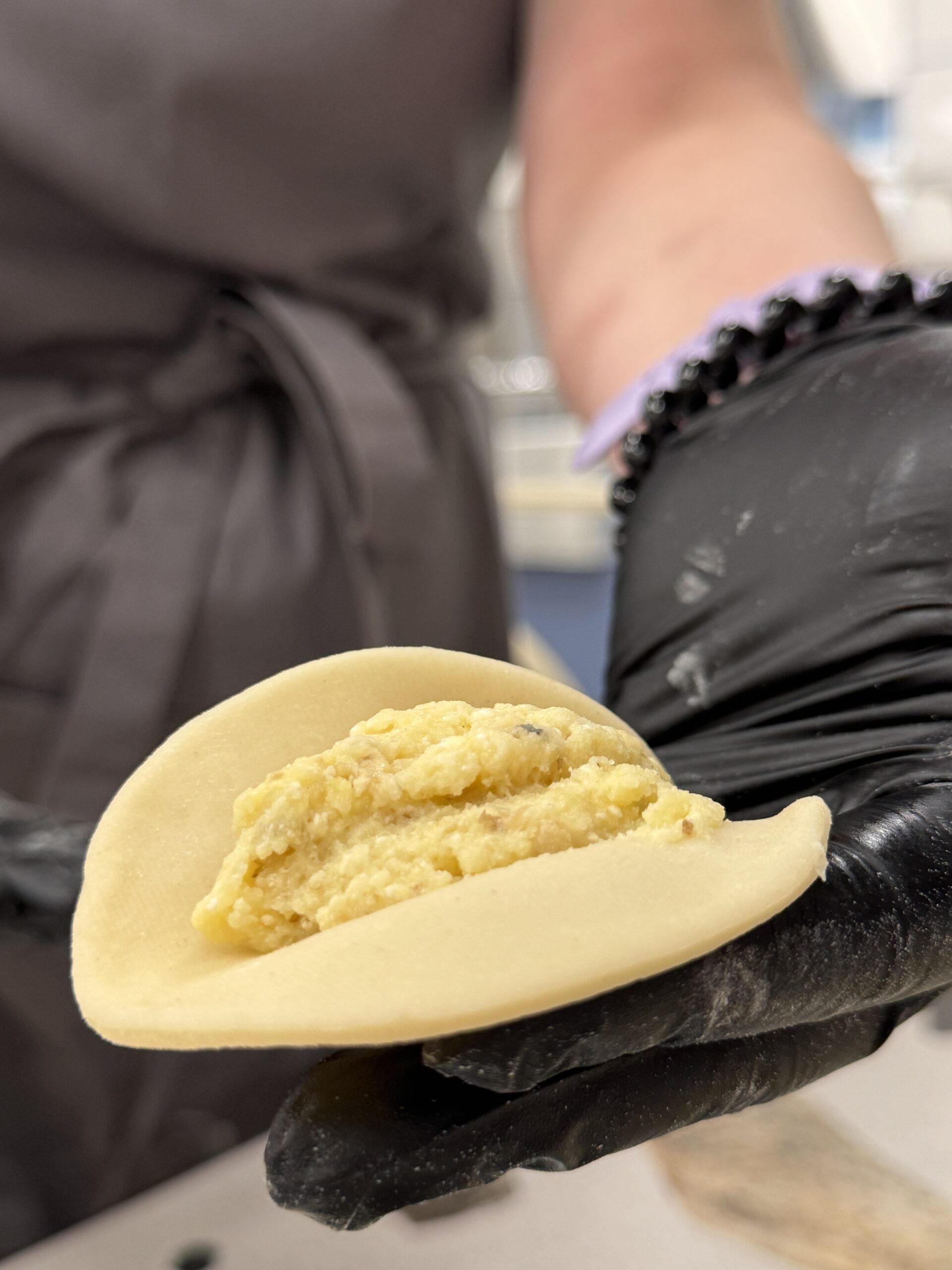 Η γέμιση που επιλέξαμε να ετοιμάσουμε ήταν η κλασική: πατάτα, τυρί cottage και καραμελωμένα κρεμμύδια. Καθώς γεμίζαμε τα ζυμαρικά, η Syrene μάς διόρθωνε με υπομονή, δείχνοντάς μας πώς να τοποθετούμε τη σωστή ποσότητα ώστε το pierogi να παραμένει κλειστό και να μην «εκρήγνυται» στο βράσιμο.