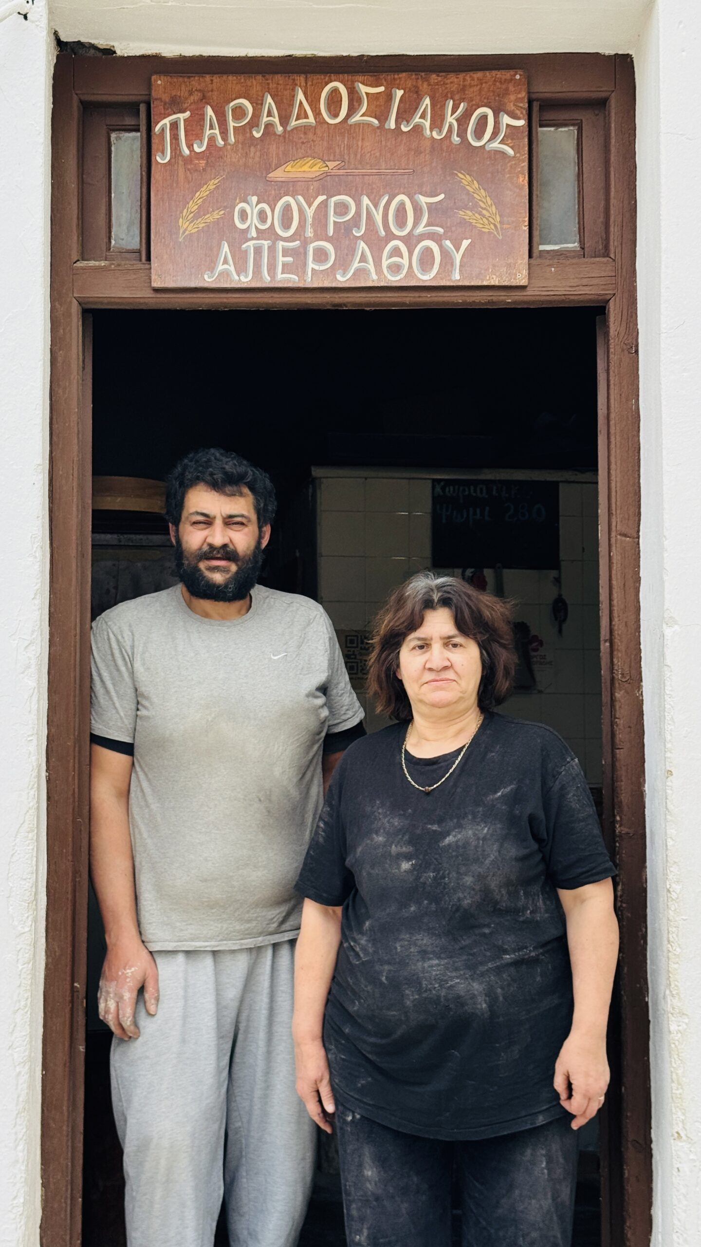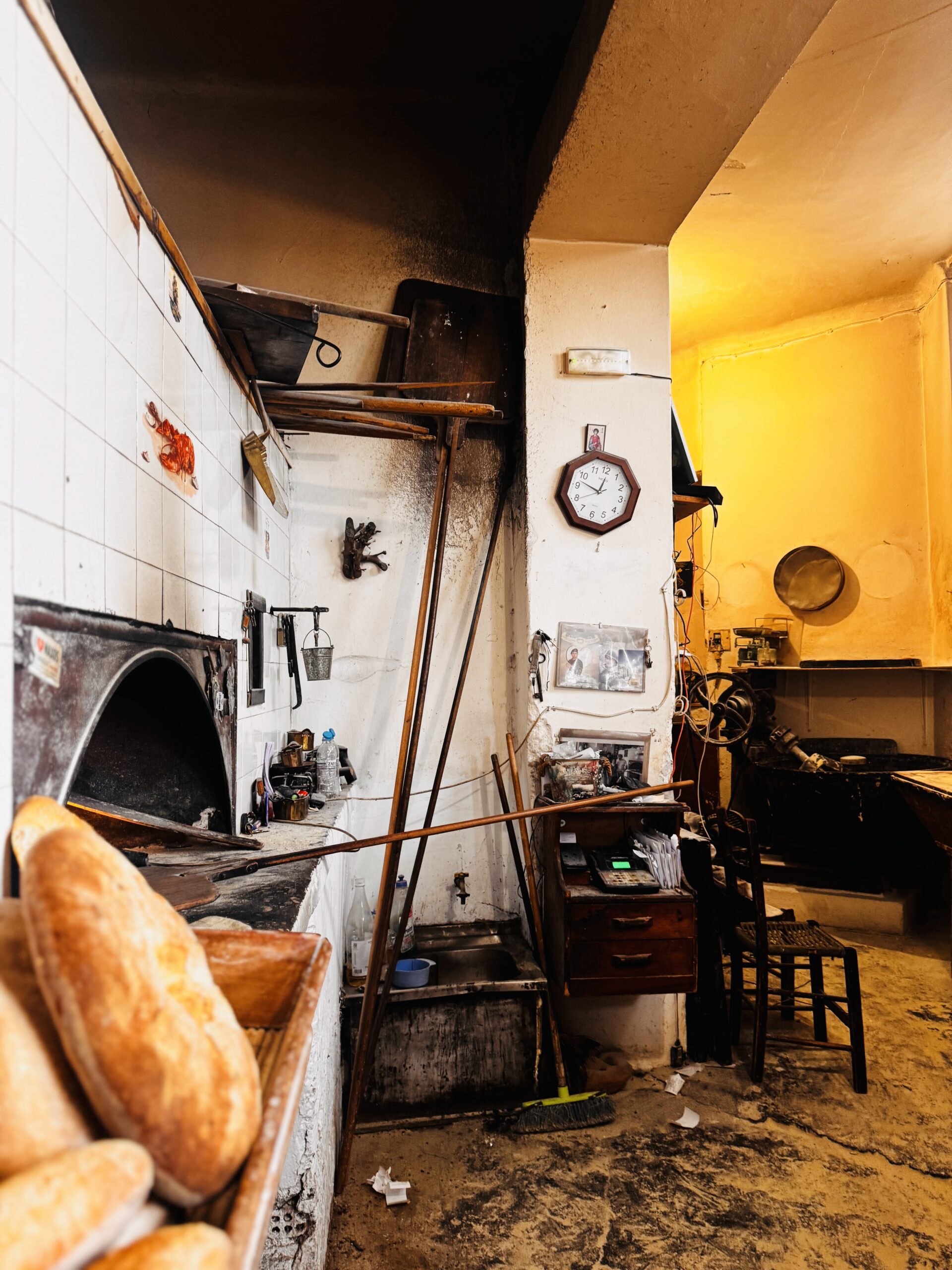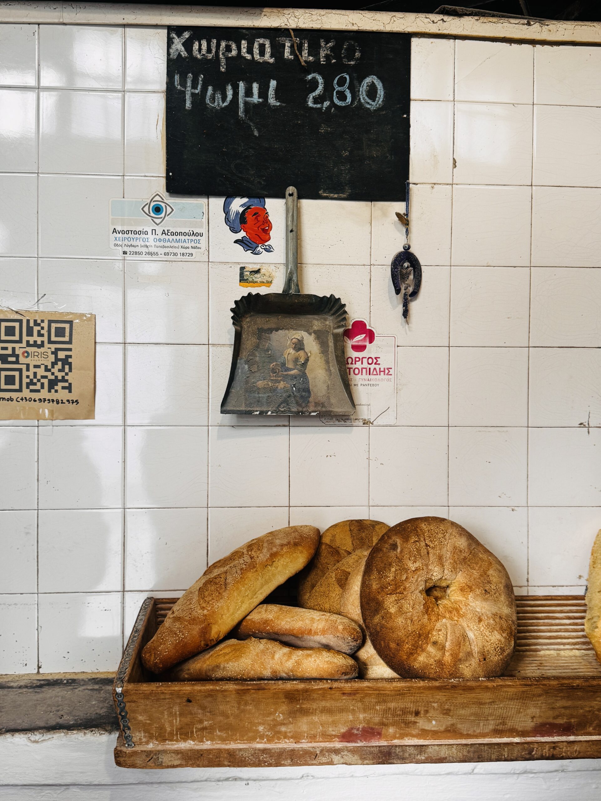 Φτάσαμε το πρωί, νωρίς. Ο Γιάννος, τρίτη γενιά στον φούρνο, ήταν ήδη μέσα και φούρνιζε. Η πρώτη φουρνιά είχε βγει, το ψωμί κρύωνε πάνω στον πάγκο και η μυρωδιά του απλωνόταν στα πλακόστρωτα στενά. Μας έδωσε να δοκιμάσουμε. Στον δεύτερο πάγκο, τα καρβέλια της δεύτερης φουρνιάς περίμεναν, σκεπασμένα, στο στάδιο που φουσκώνει η ζύμη πριν μπει στη φωτιά. Μια εικόνα που δεν τη βλέπεις συχνά, γιατί, για να την πετύχεις, πρέπει να είσαι εκεί στην ώρα της. Τράβηξα μερικές φωτογραφίες. Ο Γιάννος, αλλά και η μητέρα του, η κυρία Βούλα, στέκονταν μπροστά στον φούρνο, τα καρβέλια παραταγμένα, το φως του πρωινού να πέφτει πλάγια. Τέτοιες εικόνες δεν χρειάζονται πολλή επεξεργασία για να αναδειχθεί η ομορφιά τους.