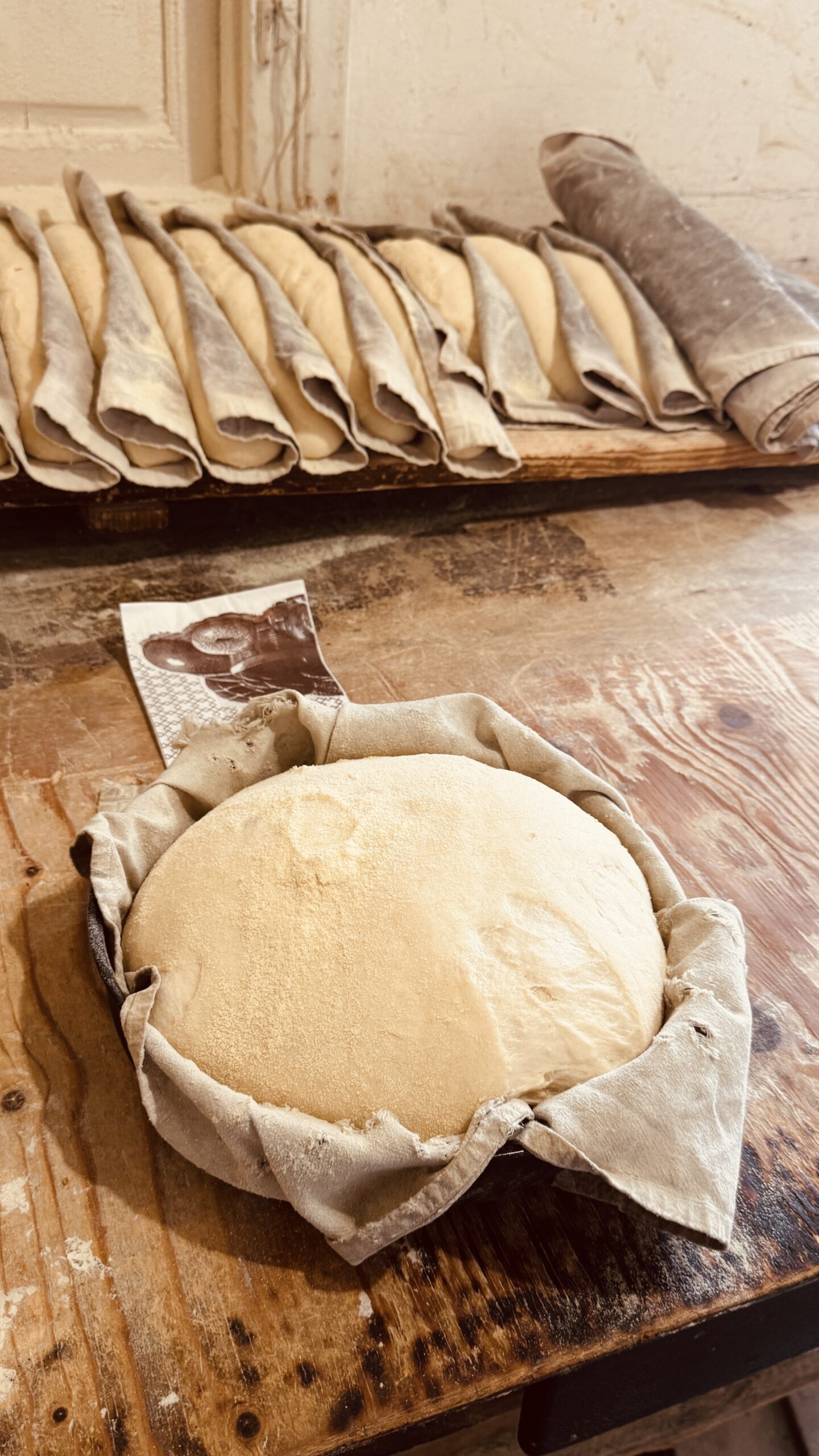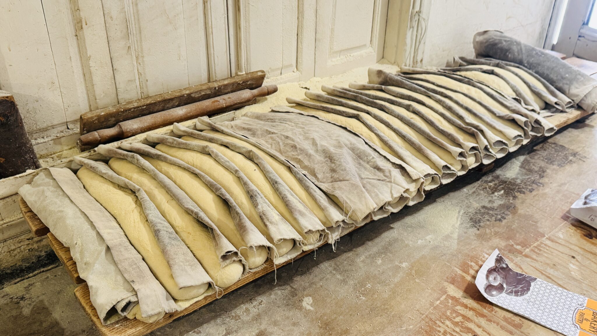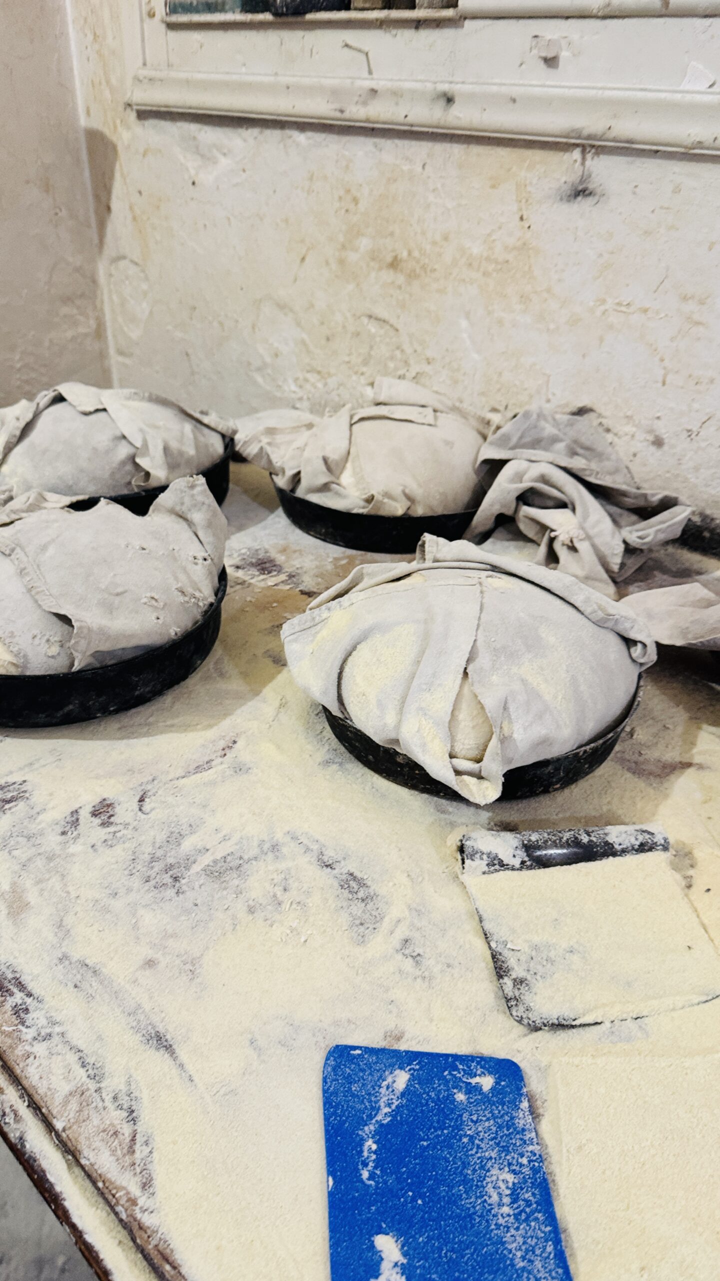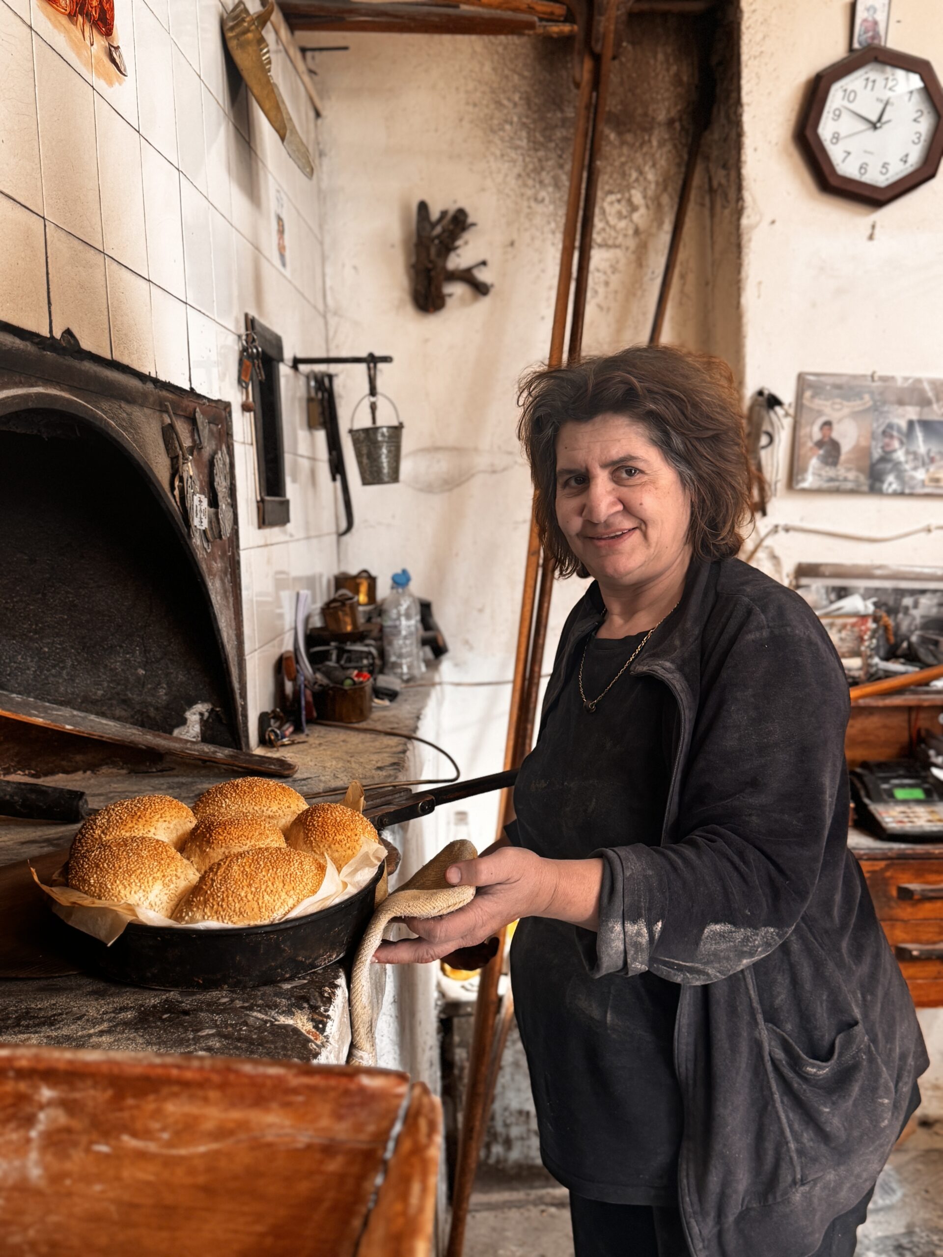 Φτάσαμε το πρωί, νωρίς. Ο Γιάννος, τρίτη γενιά στον φούρνο, ήταν ήδη μέσα και φούρνιζε. Η πρώτη φουρνιά είχε βγει, το ψωμί κρύωνε πάνω στον πάγκο και η μυρωδιά του απλωνόταν στα πλακόστρωτα στενά. Μας έδωσε να δοκιμάσουμε. Στον δεύτερο πάγκο, τα καρβέλια της δεύτερης φουρνιάς περίμεναν, σκεπασμένα, στο στάδιο που φουσκώνει η ζύμη πριν μπει στη φωτιά. Μια εικόνα που δεν τη βλέπεις συχνά, γιατί, για να την πετύχεις, πρέπει να είσαι εκεί στην ώρα της. Τράβηξα μερικές φωτογραφίες. Ο Γιάννος, αλλά και η μητέρα του, η κυρία Βούλα, στέκονταν μπροστά στον φούρνο, τα καρβέλια παραταγμένα, το φως του πρωινού να πέφτει πλάγια. Τέτοιες εικόνες δεν χρειάζονται πολλή επεξεργασία για να αναδειχθεί η ομορφιά τους.