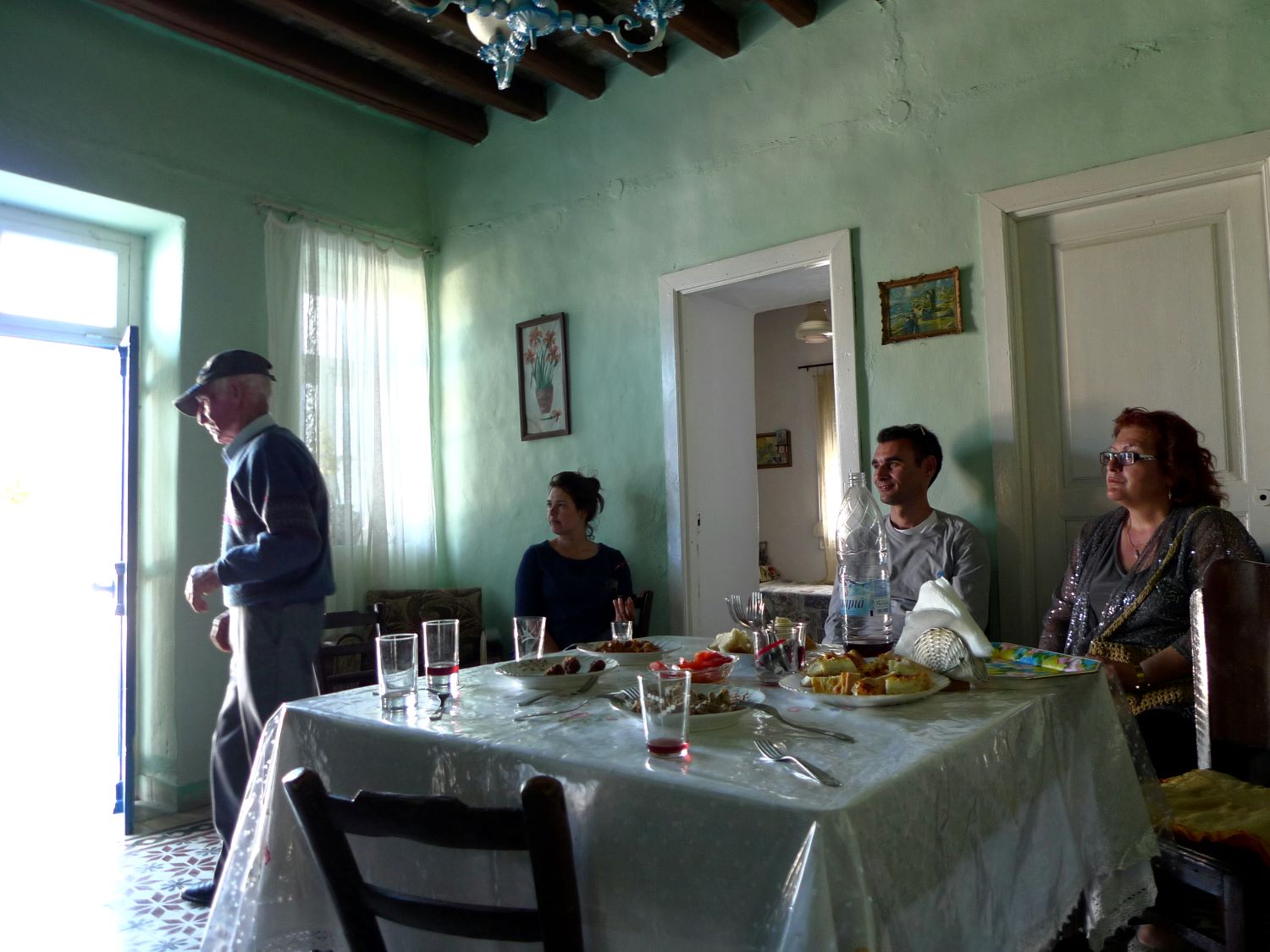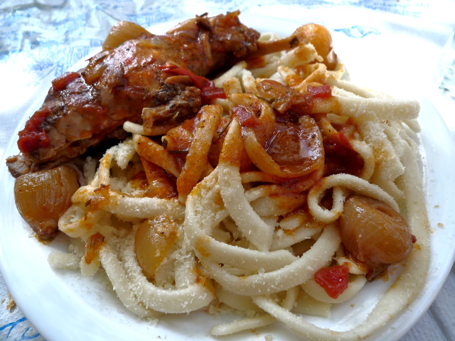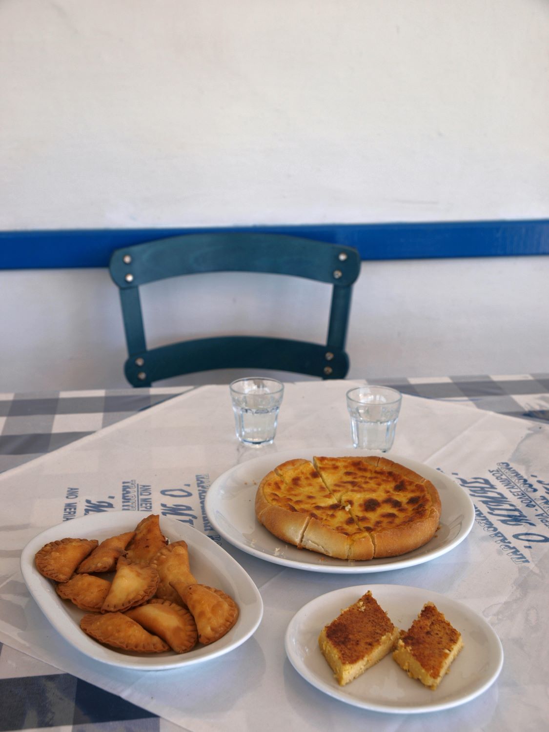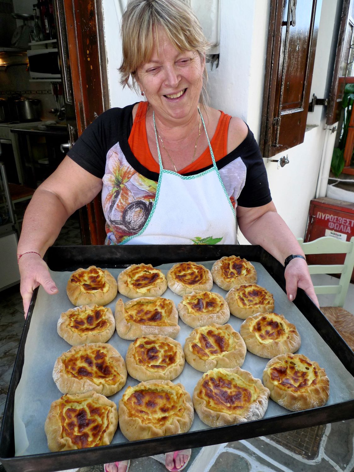Στα ενδότερα της Χώρας, στο σοκάκι του «Σπιτικού» η Ρηνιώ παραλαμβάνει από τον όμορο φούρνο το ταψί με τις πίτες και μόλις το τακτοποιεί πηγαίνει πάνω από τις κατσαρόλες που βράζουν τα χερίσια ματσάτα ζυμαρικά που παραδοσιακά ταιριάζουν με κόκορα κοκκινιστό ή λεμονάτο, κουνέλι κοκκινιστό ή κιμά. Και κάπου εδώ αυτό το εμβληματικό φαγητό συναντάται με τα αυτόχθονα τυριά, τη τριμμένη μανούρα επάνω στα μακαρόνια και το σουρωτό στην κορυφή της ταιριαστής χωριάτικης σαλάτας που παραπέμπει απευθείας σε τσαχπινιά του καλοκαιριού, έτσι όπως εφορμά με δύναμη επάνω από τον ψηλό βράχο της Χώρας προς το πέλαγος, για να καθαγιάσει τα πάντα με τη χάρη του.