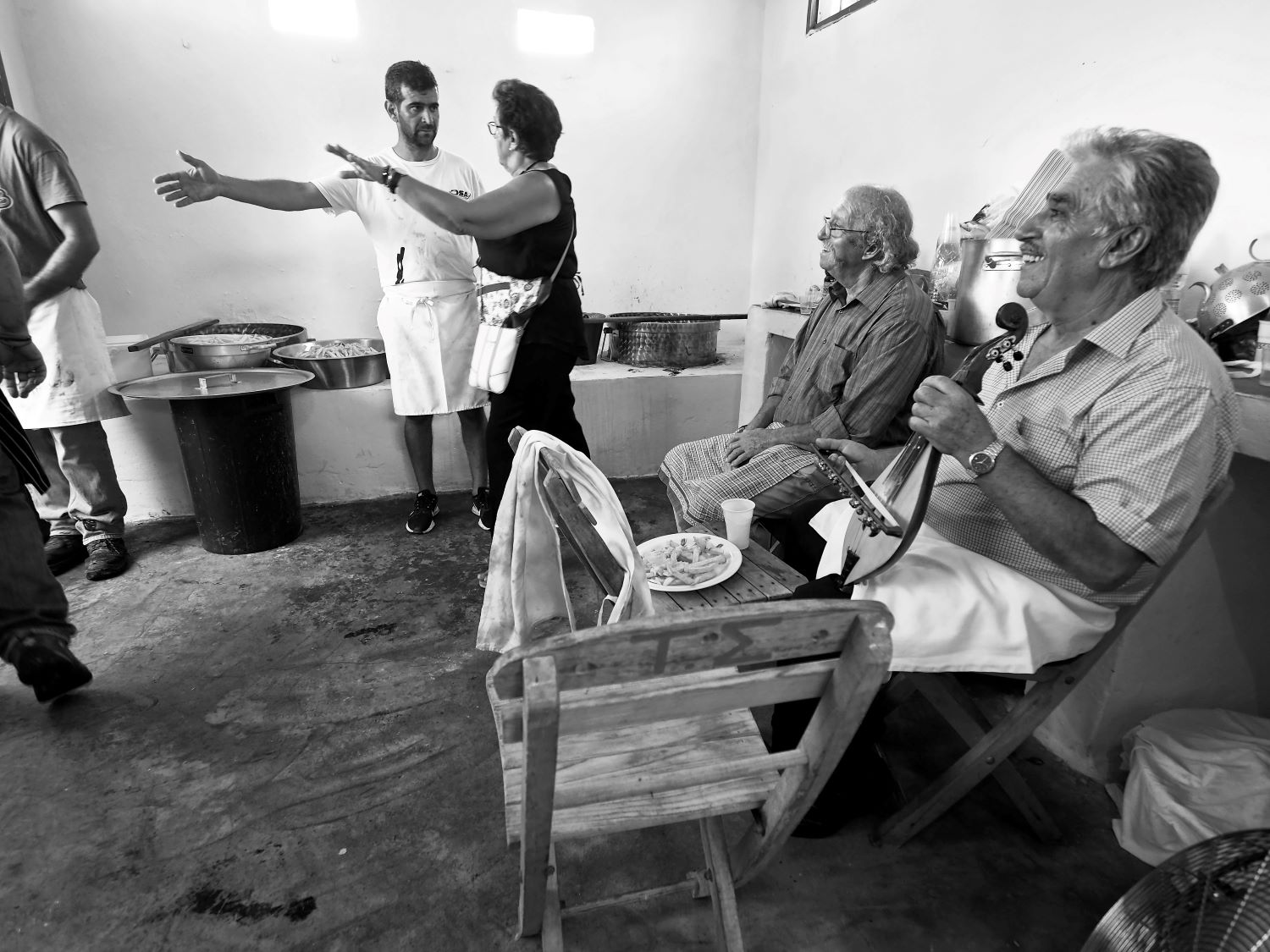 Οι ίδιοι άνθρωποι, φορώντας τις χαρακτηριστικές ποδιές τους, πότε πιάνουν τις κουτάλες και πότε τα παραδοσιακά όργανα, τη λύρα και το λαγούτο. Στέκονται για λίγο όρθιοι στην ομήγυρη γύρω από τα όργανα και μετά πετάγονται για να κάνουν κάποια δουλειά που στο μεταξύ προκύπτει. Κάποιοι προλαβαίνουν να πουν και τη μαντινάδα τους, τη στιγμή που δίπλα οι γυναίκες πλένουν χρησιμοποιημένα πιάτα και σερβίτσια και αμέσως τα προωθούν καθαρά από το παράθυρο για να τα γεμίσουν και να τα προωθήσουν οι σερβιτόροι και στους υπόλοιπους που αδημονούν να δοκιμάσουν τη τσαϊτιά.