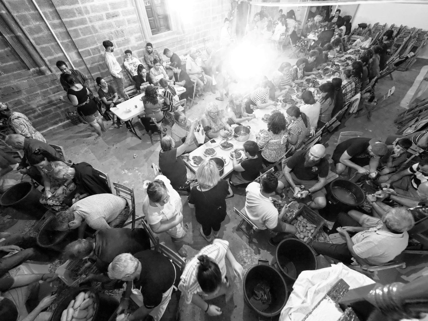 Στο μεταξύ, όλη η ενέργεια και η συσσωρευμένη δυναμική των συναισθημάτων της κοινότητας μοιάζουν να εκρήγνυνται στο μικρό κουζινάκι των μαγειρείων του Σταυρού, σε ένα απίστευτο γλέντι, πριν την ώρα του και ανεπίσημο, κρυμμένο στο άδυτο των μαγειρείων. Ο αρχικός, γενεσιουργός, πυρήνας του πανηγυριού, μοιάζει ασυγκράτητος. Οι άνθρωποι θέλουν τόσο πολύ να επιδείξουν με το γλέντι την ταυτότητά τους και την ευτυχία τους που ανήκουν σε μια κοινή ομάδα που πιστεύει και μοιράζεται τις ίδιες αξίες και παραδόσεις και υπερηφανεύονται για αυτό.