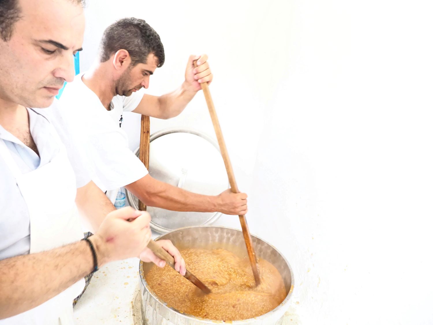 Ο έχων το γενικό πρόσταγμα στα μαγειρεία Μιχάλης του Αγά, μας μυεί στα μυστικά της «τσαϊτιάς» του Σταυρού: στο μεγάλο καζάνι επάνω στην παρανιστιά που από κάτω καίνε ξύλα, τσιγάρισαν σε ελαιόλαδο, μπόλικο ψιλοκομμένο κρεμμύδι και σκόρδο. Τα «καβουρδίζεις» και μετά βάζεις ξύδι, δάφνη, ξύλο κανέλλας, αλάτι, πιπέρι, χοντροκομμένα ντοματάκια κονσέρβα για να παραμείνουν κάποια ορατά και αισθητά μέσα στο φαγητό, για να τη βρίσκεις τη ντομάτα, όπως λέει ο Βασίλης. Για να μελώσει το ζουμί πρέπει να κοχλάζει κάπου τέσσερις ώρες. Τακτικά, το δοκιμάζουν και διορθώνουν τη γεύση του με αλάτι, υπολογίζοντας ότι κάποια ποσότητα θα απορροφήσει και το ρύζι που θα βράσει μέσα σε αυτό το ζουμί κοντά μια ώρα.