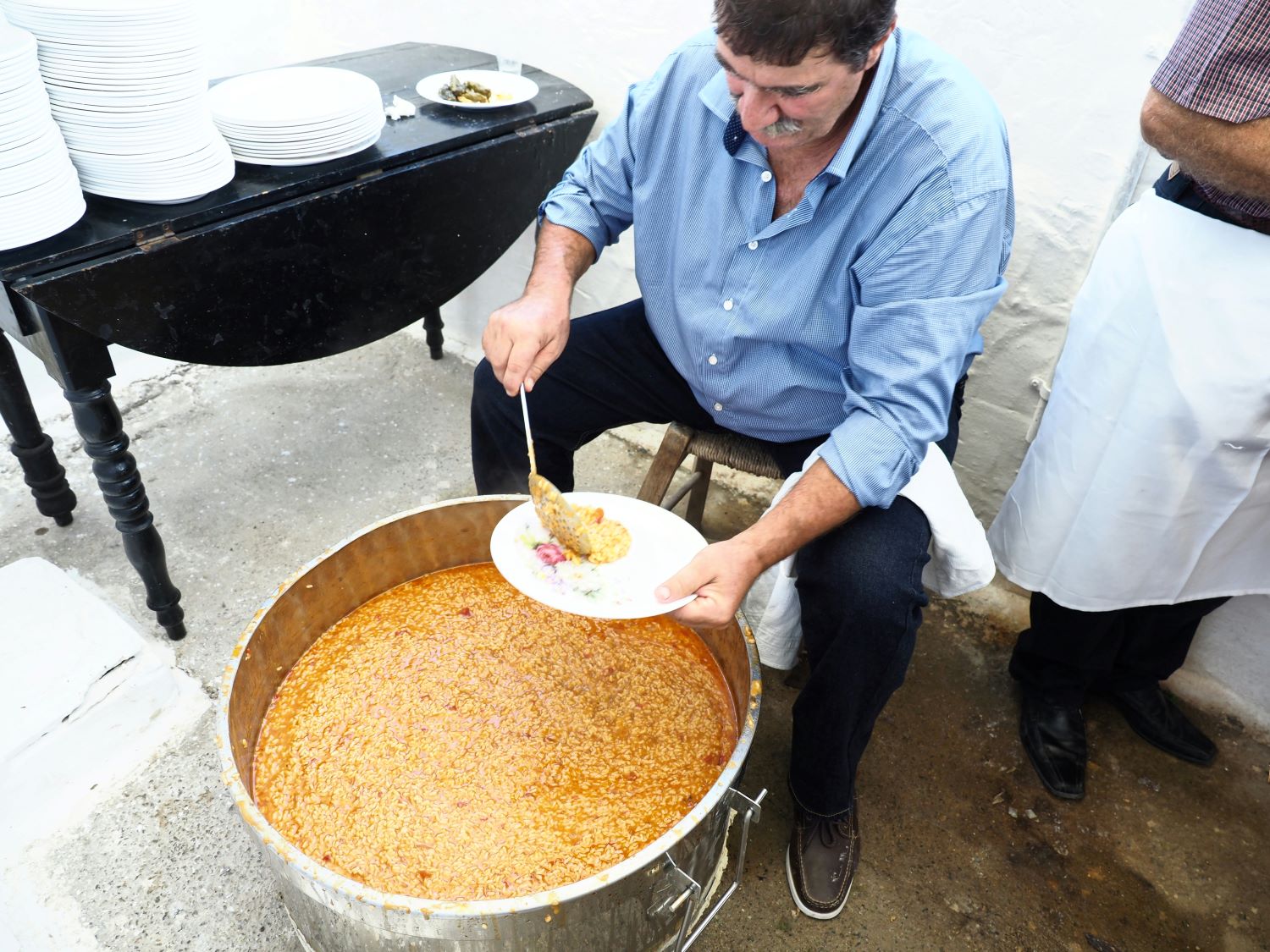 Το ανακατεύουν συνεχώς δύο παραμάγειρες με τις μεγάλες, ξύλινες, κουτάλες και ο μάγειρας το δοκιμάζει τακτικά, για να κατέβει το καζάνι από τη φωτιά όταν το ρύζι θα «στέκει» και δεν θα σπάσει με το επί πλέον βράσιμο που υφίσταται και μετά την απόσυρσή του από την παρανιστιά. Δύο αγανταεροί νέοι αναλαμβάνουν να κατεβάσουν το καζάνι με πολύ προσπάθεια στο κέντρο των μαγειρείων, και αφού το αφήσουν δέκα λεπτά «να σταθεί», το βάζουν στη γραμμή σύνθεσης του πιάτου του γλεντιού, που αυτό περιμένει για να αρχίσουν να φεύγουν τα πιάτα προς την αυλή της εκκλησιάς.