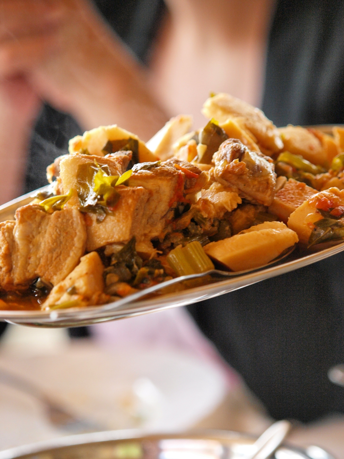 Κι όταν μιλάμε για Κρασοχώρια, ταξιδεύουμε στο Όμοδος, στη Βάσα Κυλανίου και στο Άρσος. Στο Όμοδος ήρθε μπροστά μας το χοιρινό με γιαχνιστό κολοκάσι. Το κολοκάσι είναι ο κόνδυλος του φυτού με τα τεράστια, καλλωπιστικά αλλά δηλητηριώδη, φύλλα, που, όμως, είναι πολύ αγαπητό φαγητό της Μέσης Ανατολής, Στην Κύπρο ευδοκιμεί γύρω από τη Σωτήρα στα Κοκκινοχώρια. Η καλύτερη εποχή του είναι ο Δεκέμβριος, αλλά το είδαμε στην πλούσια και πολύχρωμη, πολύ γραφική, αγορά της Λεμεσού κάθε εποχή. Μαγειρεύεται πάντα με λεμόνι. Έτσι κι εδώ που το γιαχνιστό κολοκάσι συνδυάζεται με χοιρινό κρέας από μπέικον ή σπάλα κομμένο σε κύβους, όπως και ο κόνδυλος. Και τα δύο μαζί τσιγαρίζονται σε ελαιόλαδο και ψήνονται στην κατσαρόλα με καρότα, σέλινα και τριμμένες ώριμες ντομάτες.