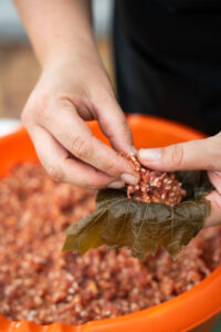 Μπήκαμε στην κουζίνα, όπου μαζί με τη βοηθό της, είχαν ήδη ξεκινήσει την προετοιμασία. Είχαν ήδη περάσει τα κληματόφυλλα από το νερό και τα έβαζαν σε στρώσεις. Σε ένα μεγάλο μπολ, είχαν αναμείξει τον κιμά από βοδινό και χοιρινό, με το ρύζι, τον πελτέ, την τριμμένη τομάτα και το ψιλοκομμένο κρεμμύδι. Βγήκαμε έξω στην αυλή για να τα ετοιμάσουν εκεί κάτω από το φυσικό φως. Παρατηρούσα τα χέρια τους καθώς δίπλωναν τα «φύλλα».
