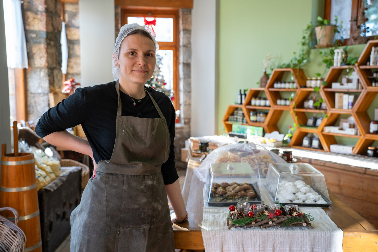 Μπαίνοντας στον χώρο, το βλέμμα μαγνητίζεται από τη διακόσμηση που συνδυάζει την απλότητα με την παραδοσιακή αισθητική. Το πωλητήριο είναι γεμάτο καλούδια -από μελομακάρονα, κουραμπιέδες και γλυκά ταψιού, μέχρι βότανα και μέλι παραγωγής της οικογένειας.