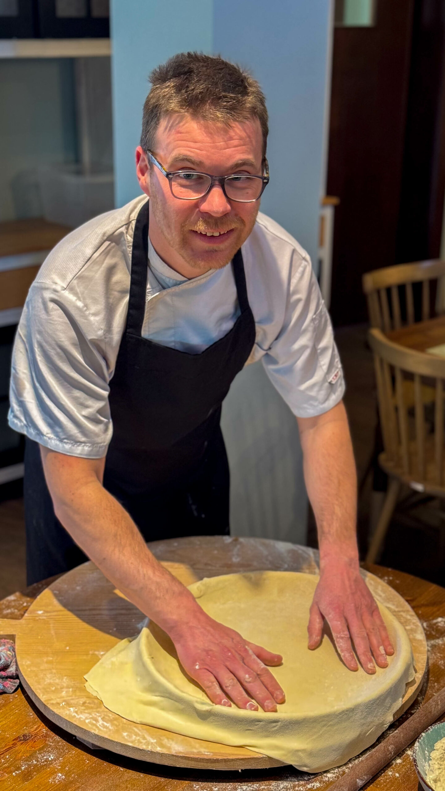 «Ξεκίνησα από τα Τρίκαλα, την πόλη μου, όπου έκανα τα πρώτα μου επαγγελματικά βήματα», αναφέρει. «Έπειτα εργάστηκα στη Λάρισα, την Αθήνα, τη Σαντορίνη: κάθε μέρος και μια διαφορετική εμπειρία, κάθε κουζίνα και ένα διαφορετικό μάθημα». Καθώς μιλά, τα χέρια του δε μένουν ακίνητα. Ανοίγει με μαεστρία ένα φύλλο για την παραδοσιακή χορτόπιτα που ετοιμάζεται να μας παρουσιάσει, δείχνοντας τη δεξιοτεχνία που έχει αποκτήσει με τα χρόνια. «Κάθε προορισμός μού έδωσε κάτι διαφορετικό. Στα Τρίκαλα και τη Λάρισα, εμπέδωσα τις θεσσαλικές γεύσεις που με μεγάλωσαν. Στην Αθήνα, ήρθα σε επαφή με τη σύγχρονη γαστρονομία και τις διεθνείς τάσεις. Στη Σαντορίνη, γνώρισα την κυκλαδίτικη κουζίνα και τον πλούτο των τοπικών προϊόντων του νησιού».