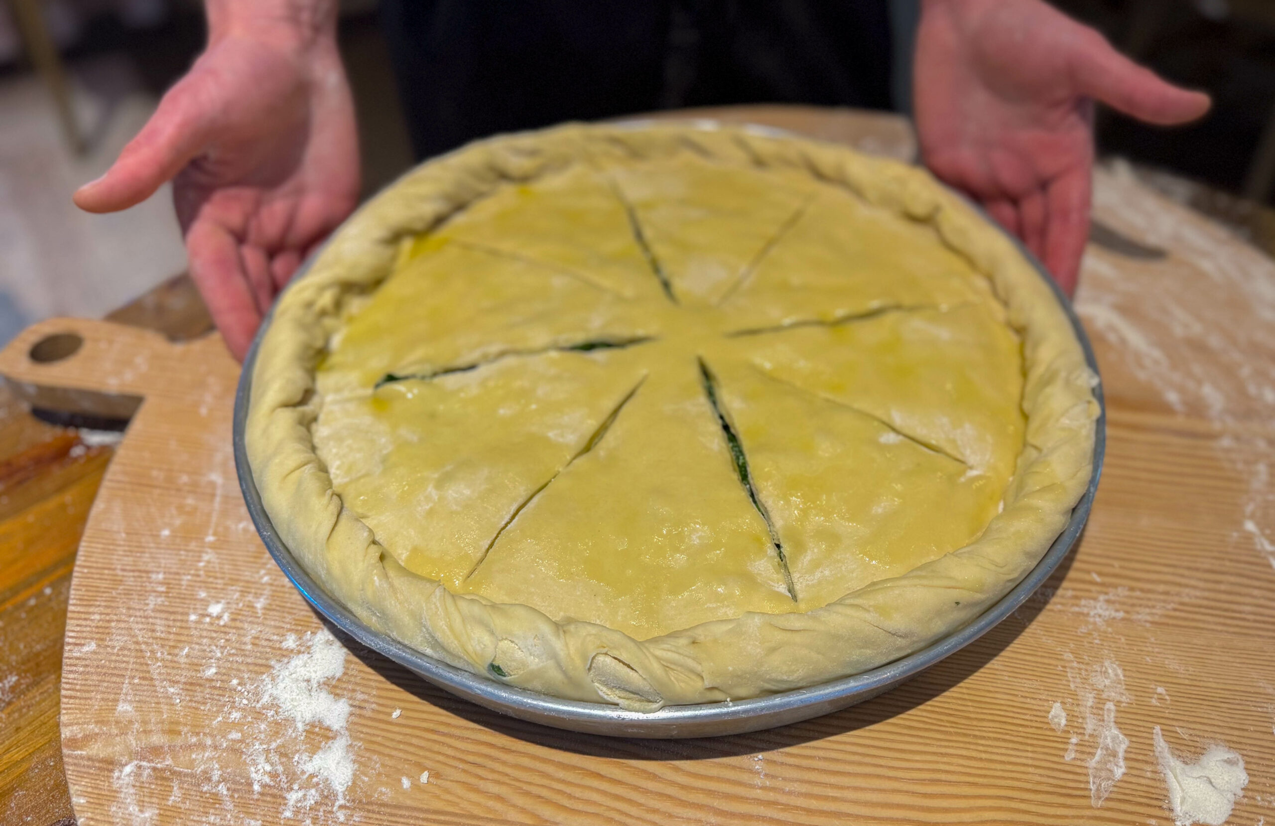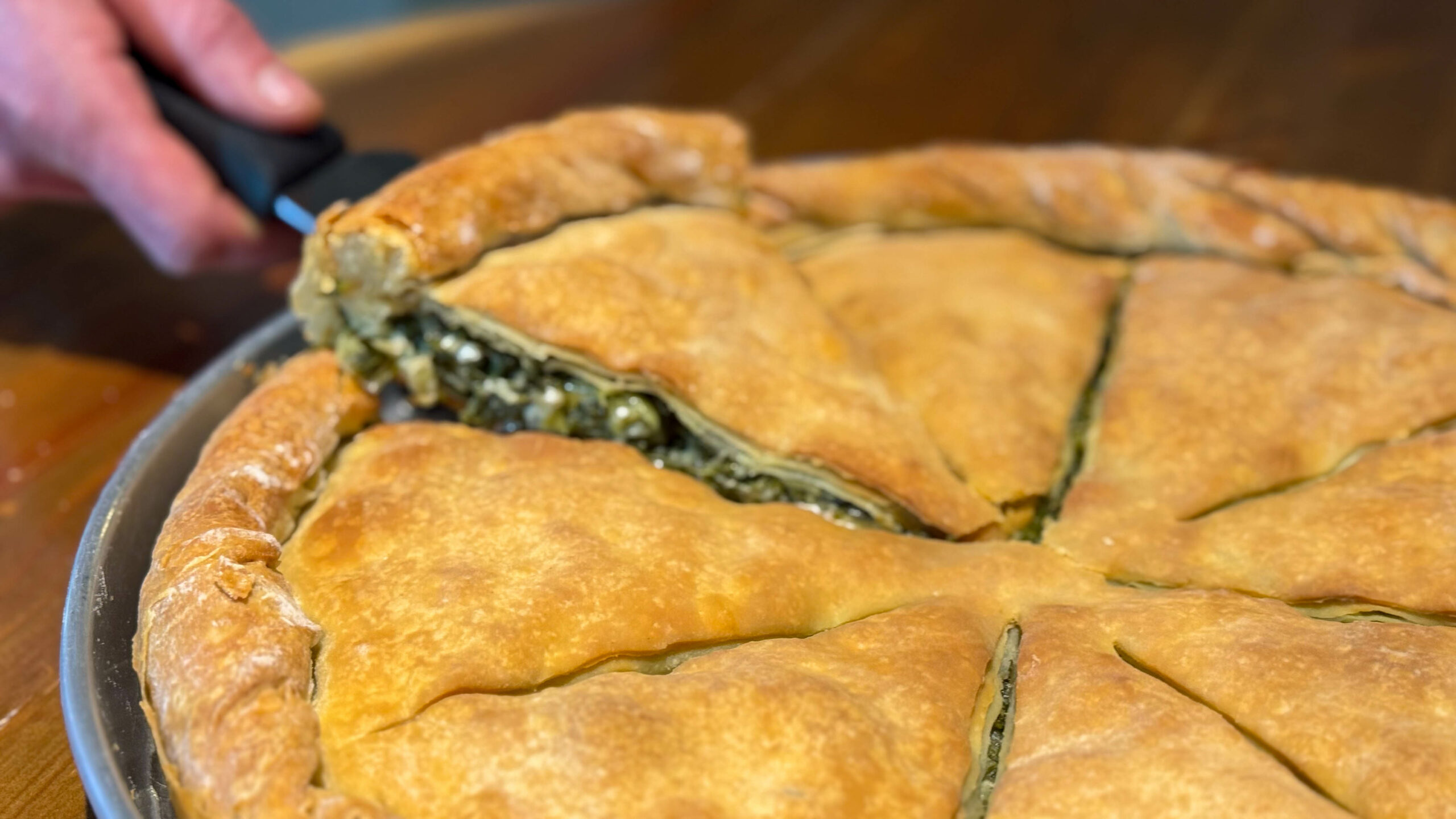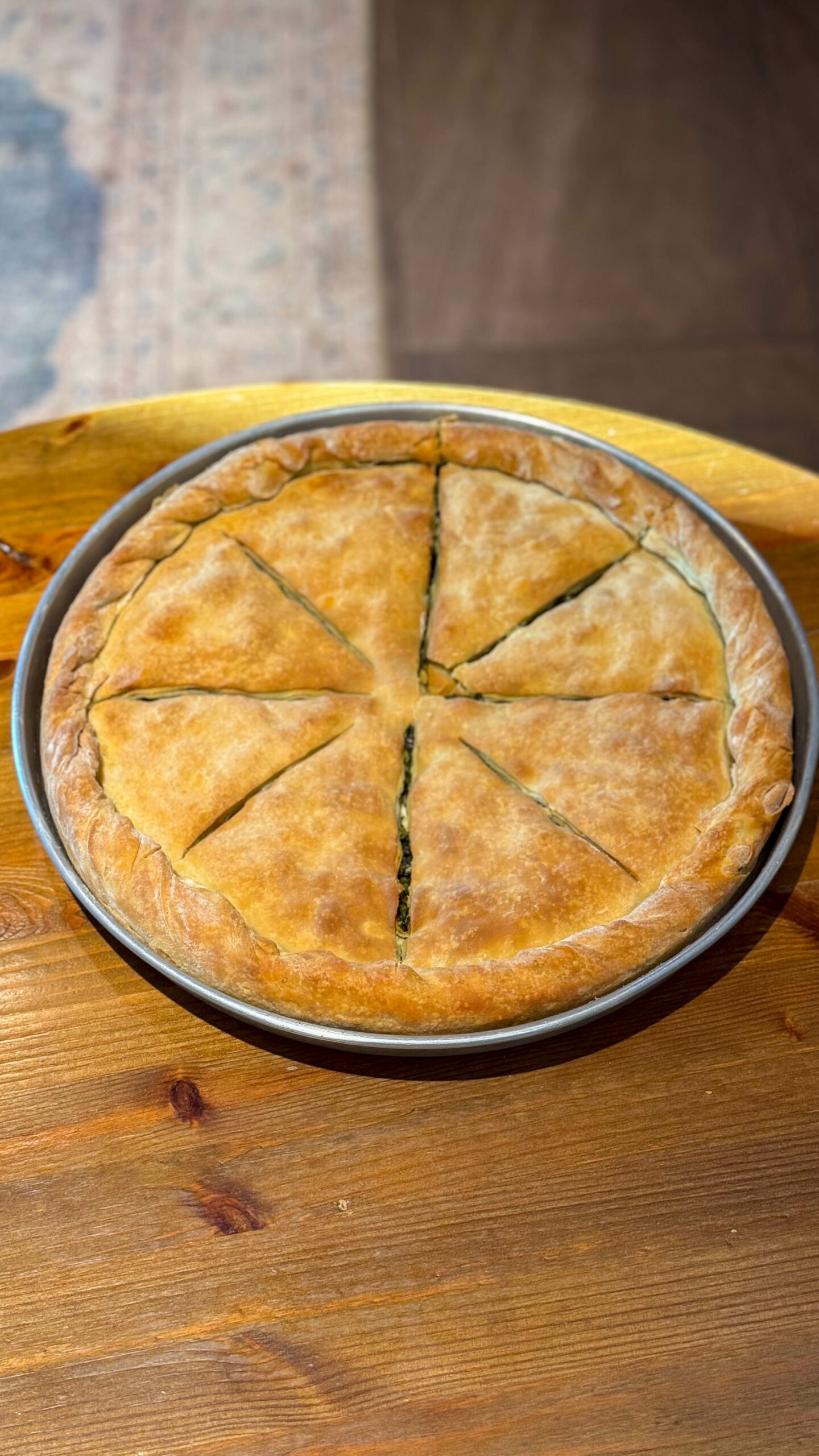 Καθώς η συζήτησή μας πλησιάζει στο τέλος της, ο φούρνος ανοίγει για να αποκαλύψει μια χρυσαφένια, αχνιστή χορτόπιτα. Ο Κωνσταντίνος την τοποθετεί προσεκτικά σε έναν ξύλινο δίσκο και την κόβει με μαεστρία, αποκαλύπτοντας τη ζουμερή, αρωματική γέμιση. «Αυτή η πίτα είναι ένα παράδειγμα αυτού που προσπαθώ να πετύχω», εξηγεί. «Το φύλλο ανοιγμένο στο χέρι, όπως το έφτιαχναν οι γιαγιάδες μας. Η γέμιση από σπανάκι, σέσκουλα και φέτα, απλή αλλά πλούσια σε γεύση. Τα μυρωδικά που ενισχύουν χωρίς να επισκιάζουν. Είναι μια συνταγή που έρχεται από το παρελθόν, αλλά παραμένει επίκαιρη και απολαυστική».