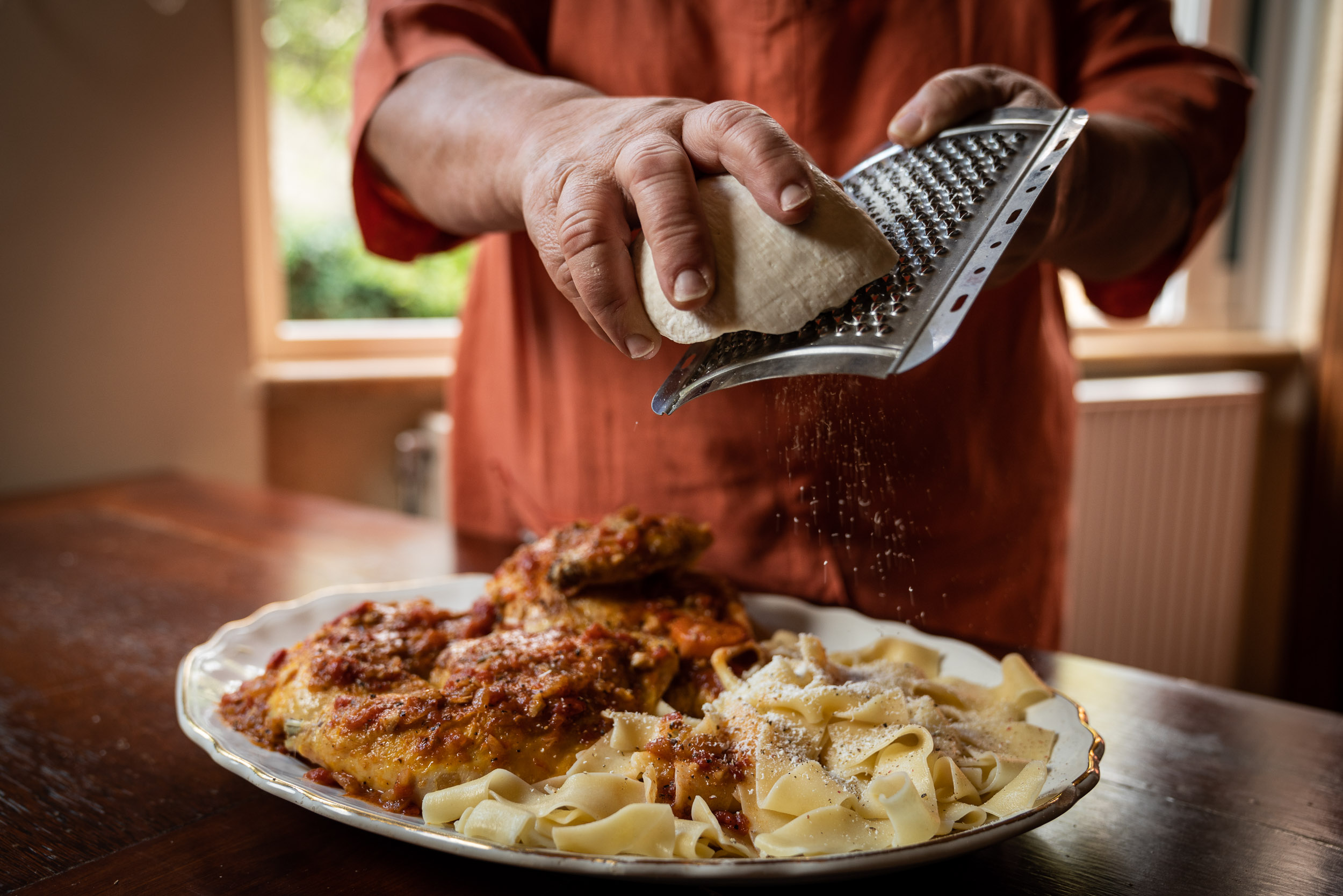 Μεταφέρετε τη σάλτσα σε γάστρα με καπάκι ή σε πλατιά και χαμηλή κατσαρόλα. Τοποθετείτε επάνω στη σάλτσα τα κομμάτια του κόκορα, κουνάτε την κατσαρόλα ή τη γάστρα.