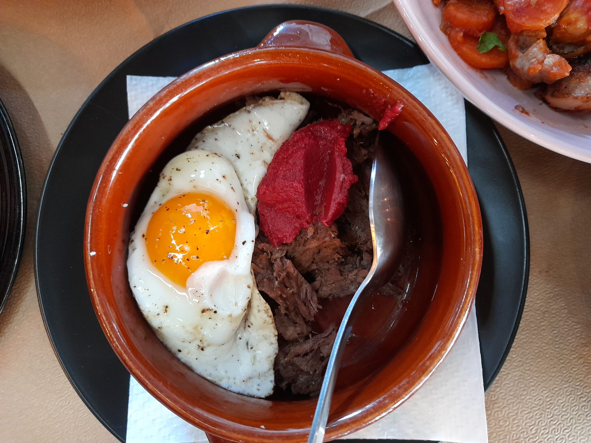 Το μεσημεριανό μας τραπέζι είχε στρωθεί στον σταθμό των τρένων της Δράμας. Ένα σύγχρονο ψητοπωλείο – το οποίο λειτουργεί και ως μπαρ καφέ- με το όνομα Καρβουνιάρης, βγάζει τραπεζάκια στην πλατφόρμα επιβίβασης, στην μπροστινή είσοδο αλλά και σε ένα μικρό κηπάκι με ροδιές ακριβώς δίπλα.