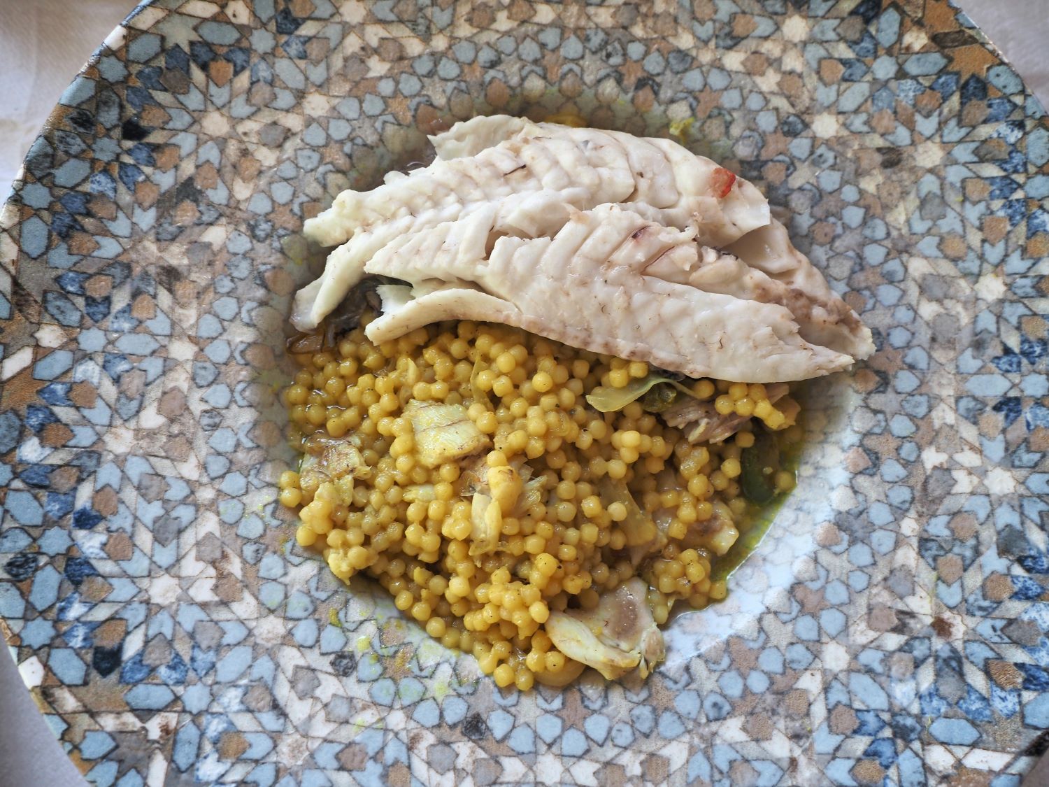Το τσιγαρισμένο κρεμμύδι σβήνει με λευκό κρασί και το αρωματίζει με φύλλο δάφνης και κουρκουμά, μαζί με αλάτι και πιπέρι. Προσθέτει το ζωμό της μεγάλης σκορπίνας που έχει ψηθεί στον ατμό, και συμπληρώνει το κουσκούς που βράζει μέσα σε αυτό. Δεν είναι πατροπαράδοτο φαγητό, αλλά, για εμάς, θα είναι παράδοση να το αναζητούμε κάθε φορά που η βάρκα θα μας ξεμπαρκάρει στη Δρώτα – όπως και την προσευχή στην Κρυφτή Παναγιά – για να είναι ολοκληρωμένη η εμπειρία μας εκεί. Όπως και τις τηγανιτές σουπιές σβησμένες με ξίδι και αρωματισμένες με δενδρολίβανο. Αυτός είναι, όντως, ένας πατροπαράδοτος τρόπος στη Λέσβο (κάνουν έτσι και τα καλαμάρια) για να δώσουν στα τηγανιτά εντελώς ξεχωριστή γεύση. Κόλπο του κόλπου της Καλλονής, μας είπαν.