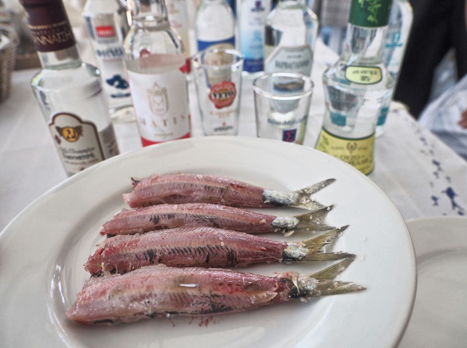 Ο Πάτροκλος στο «Μπαλκονάκι», στη Βαρειά, μας κάνει τις πρώτες συστάσεις με τις παστές σαρδέλες, φέρνοντας στο τραπέζι μας το πιάτο με εντελώς ανάρτυτο – χωρίς λάδι ή λεμόνι – τον πλέον επιφανή μεζέ. Τις έβαλε ο ίδιος πριν δύο ώρες στο ημίχοντρο αλάτι, και τις έπλυνε και τις καθάρισε μόλις τις παραγγείλαμε, για να μην αποβάλλουν το λίπος τους ή την υγρασία τους, και να διατηρήσουν την «ζωντανή» γεύση τους. Η παπαλίνα, που εμφανίζεται στις αρχές Αυγούστου στους κόλπους της Καλλονής και της Γέρας, επειδή είναι μικρότερη σαρδέλα, χρειάζεται λιγότερο χρόνο στο αλάτι. Ο Πάτροκλος μας προέτρεψε να σχίσουμε αμέσως τη σαρδέλα από την ουρά και να τη γευτούμε χωρίς καθυστέρηση, γιατί ο χρόνος λειτουργεί εις βάρος της. Και φυσικά να σηκώσουμε αμέσως μετά το ποτήρι μας με το γαλακτερό ποτό, γιατί τίποτε άλλο δεν ταιριάζει τόσο αρμονικά.
