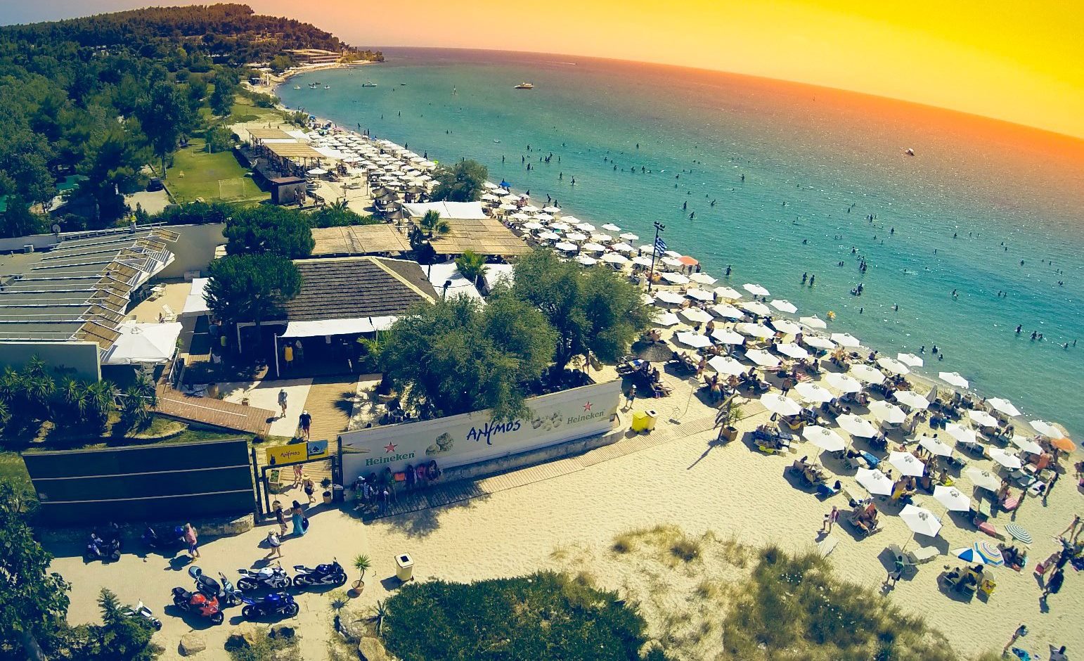 Βρίσκεται μπροστά σε μία από τις ωραιότερες παραλίες του πρώτου ποδιού, την παραλία του Σάνη και γι’ αυτό συγκεντρώνει πολύ κόσμο κατά τη διάρκεια της ημέρας. Όσο πλησιάζει το απόγευμα όμως, ο κόσμος ελαττώνεται και είναι η κατάλληλη στιγμή για μια τελευταία βουτιά στα κρυστάλλινα νερά πριν φύγει ο ήλιος. Απέναντι, ο ήλιος θα βουτάει πίσω από τα βουνά βάφοντας τα πάντα πορφυρά. Η επιστροφή στην ξαπλώστρα ταιριάζει με ένα περιποιημένο κοκτέιλ ονόματι Beach Life με τζιν, μαστίχα και λάιμ ή μία Piña Colada που την φτιάχνουν άψογα.