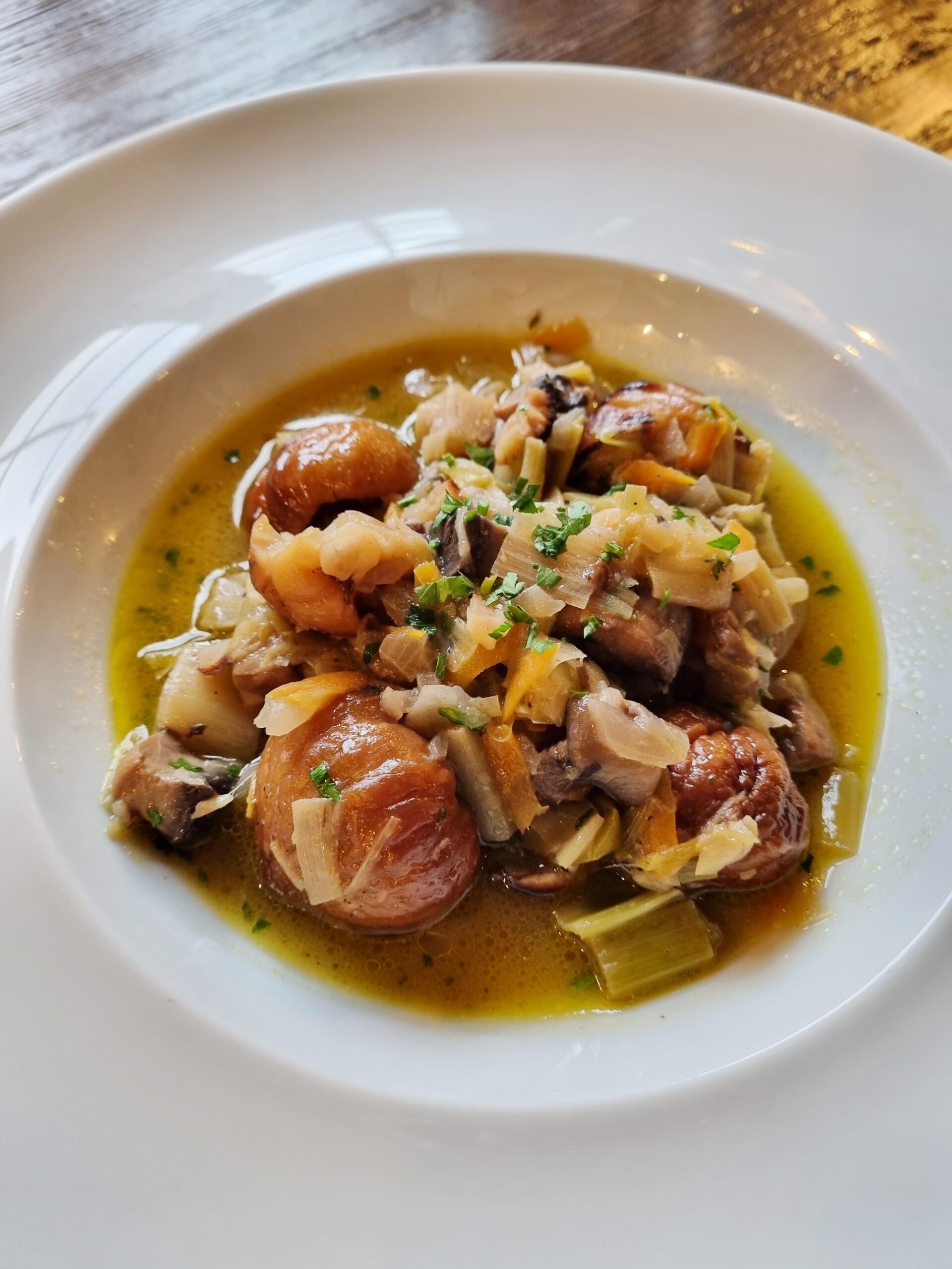 Η ποιότητα των πιάτων αρχίζει από το εξαιρετικό ψωμί και συνεχίζεται με σαλάτες που συνδυάζουν φρεσκάδα και γεύση. Ένα από τα πιάτα που ξεχωρίσαμε είναι τα «σαγάνια», μια πρωτότυπη παρασκευή γεμιστών κρεμμυδιών με πλιγούρι. Η ανοιχτή πίτα με πάπια και μανιτάρια, καθώς και το πιάτο με κάστανα, πράσα και μανιτάρια, προσφέρουν μια πλούσια γευστική εμπειρία. Το μοσχαρίσιο μάγουλο με τραχανά, είναι ένα παραδοσιακό ελληνικό πιάτο που αποτελεί επίσης μία ενδιαφέρουσα επιλογή. Το επιδόρπιο περιλαμβάνει την black forest και την πάβλοβα με μανταρίνι, ιδανικές επιλογές για μια γλυκιά κατάληξη του γεύματος.