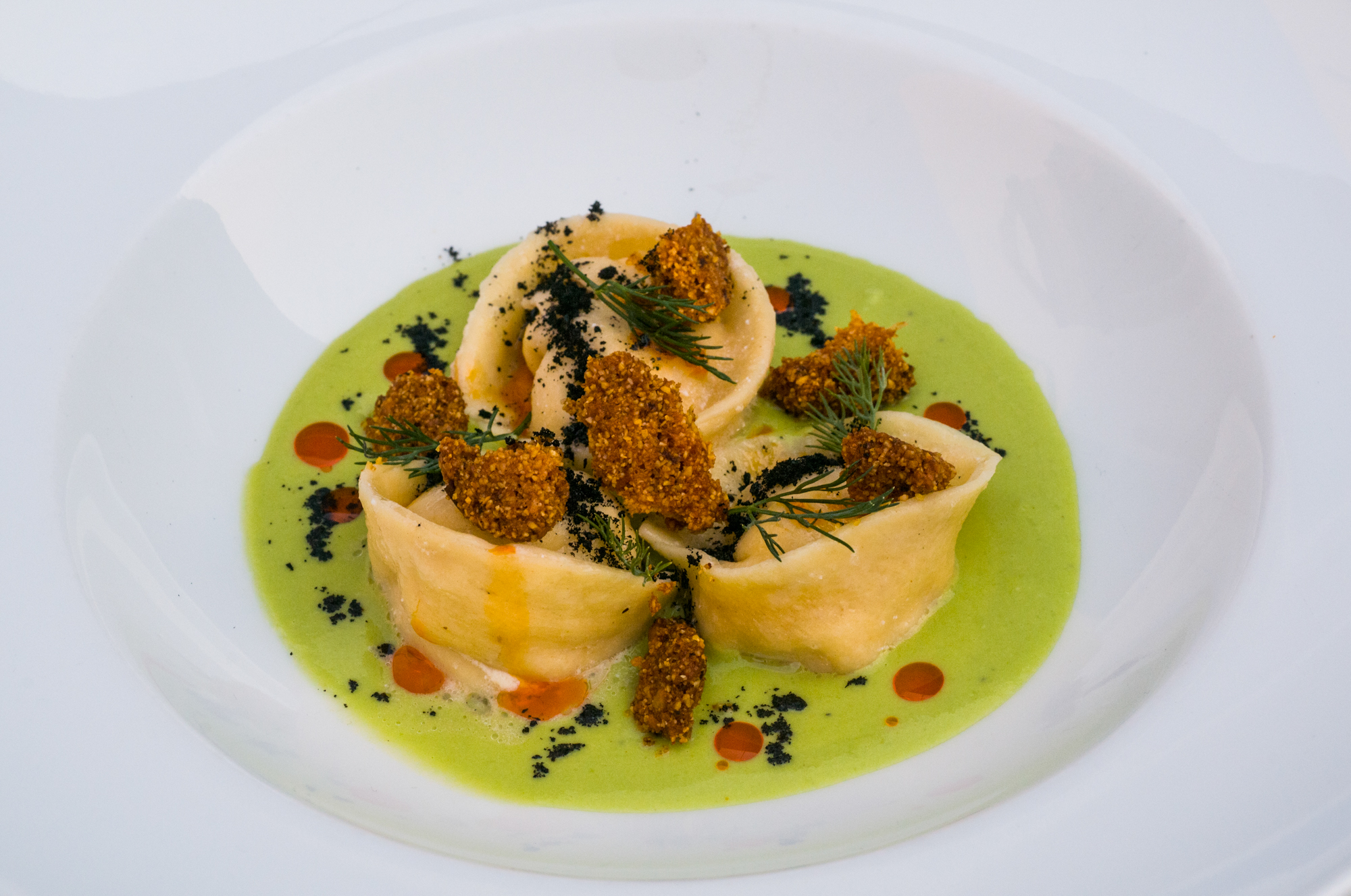 Κάτω από τον αδυσώπητο ήλιο του μεσημεριού -και όχι του ιαγουάρου- ξεδιψάσαμε με άφθονο νερό, καθώς η αίσθηση της όρασης χαιρόταν με την καλαισθησία του εστιατορίου, τη φροντισμένη επιλογή των τραπεζοκαθισμάτων, των διακριτικών διακοσμητικών λεπτομερειών που ομόρφαιναν το υπέροχο ανακαινισμένο κτίριο του 1923 με την ανθισμένη βουκαμβίλια και τους σγουρούς βασιλικούς. Οι μυρωδιές που αναδίδονταν από το μικρό παραθυράκι, προκαλούσαν ανοιχτά τους γευστικούς μας κάλυκες. Την απορία για όσα γίνονταν μέσα στην κουζίνα έλυσε εν μέρει ο Giovanni: «Μόλις φτιάξαμε ταρτάρ από λαβράκι, μαριναρισμένο σε ξινό τσάι και λίγο πριν βγήκαν τορτέλι γεμισμένα με ανθότυρο και λιαστή ντομάτα, κρέμα από μπιζέλια και crumble από ένα ιταλικό πικάντικο σαλάμι και λάδι από καμένο λεμόνι».