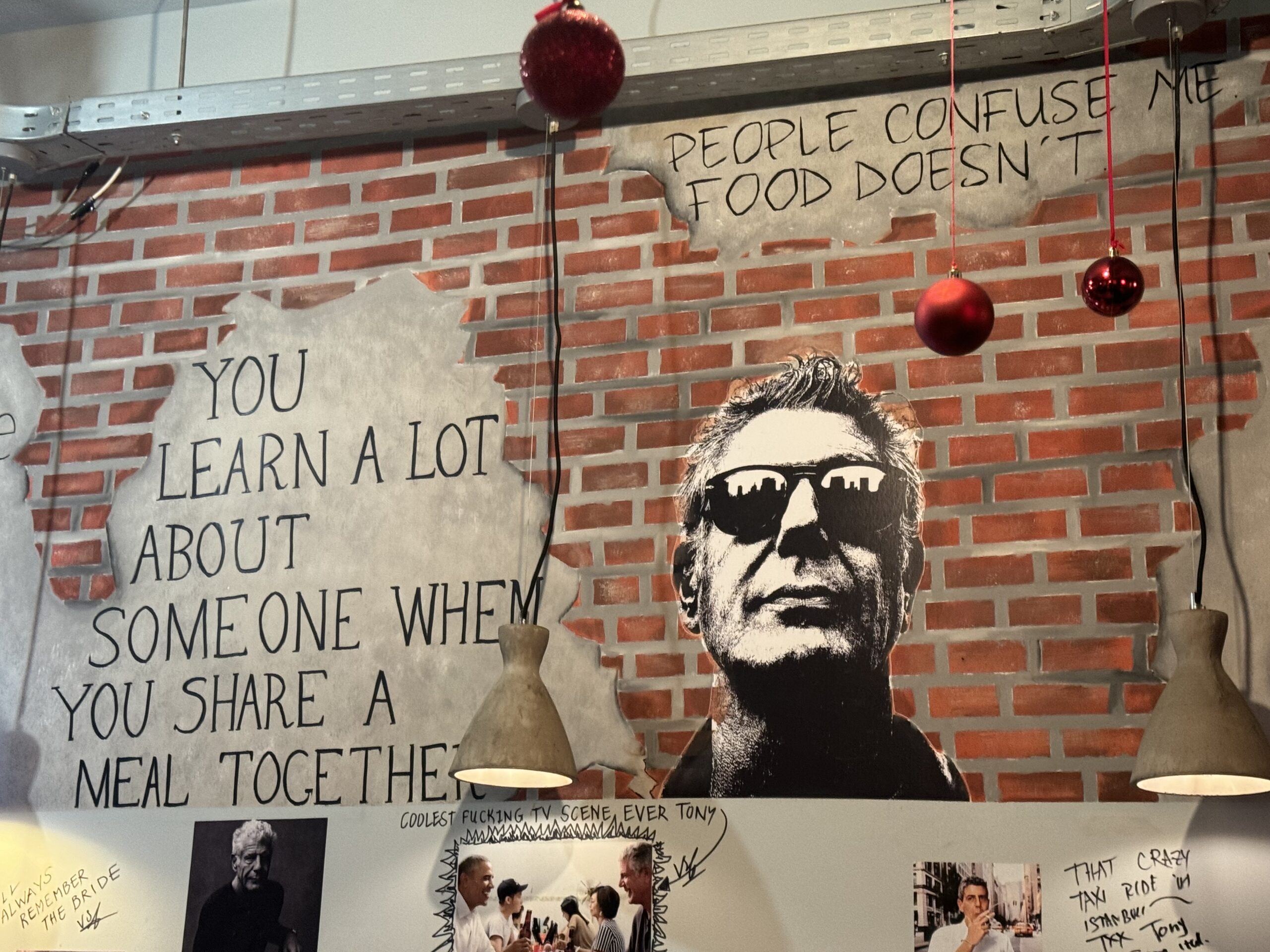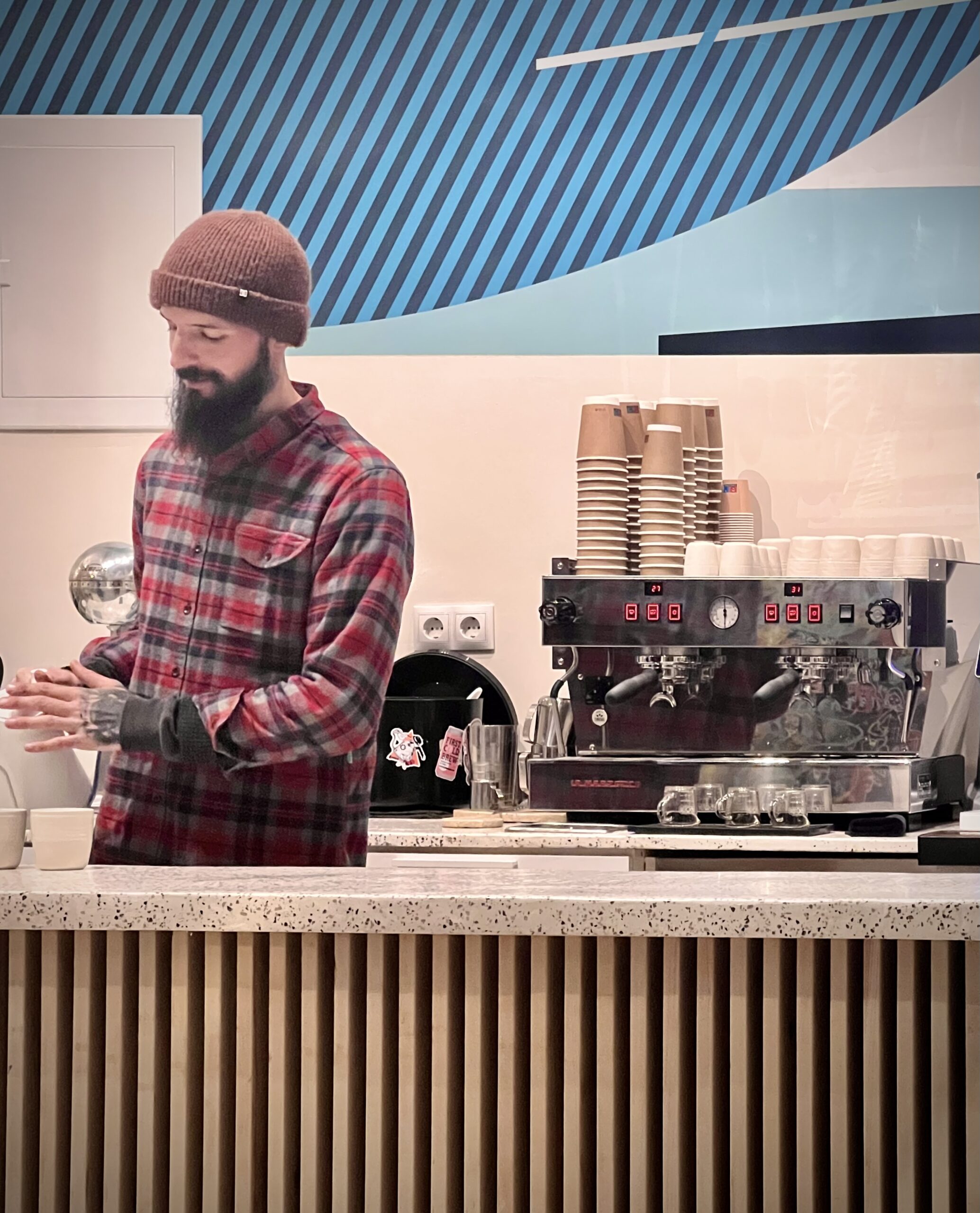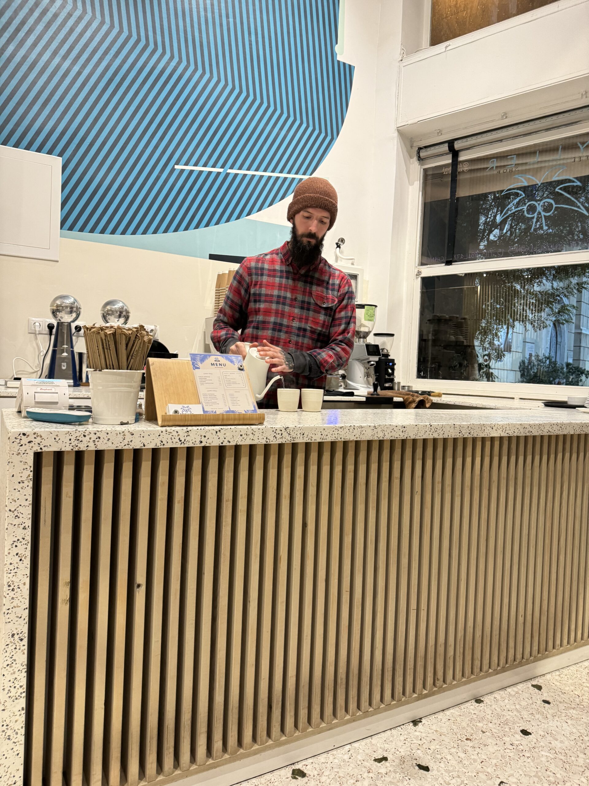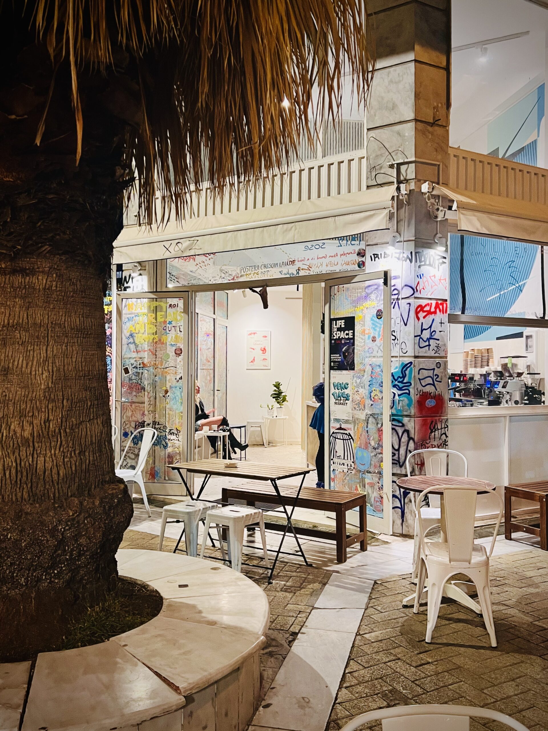 Ο Κωνσταντίνος Μετάξας είναι ο ανήσυχος αρχιτέκτονας που επιμελήθηκε την ανακαίνιση και έχει δημιουργήσει καθαρές και λιτές γραμμές. «Και για τα τζάμια ποιος είχε τη φοβερή ιδέα;», ρωτάω. «Το μαγαζί είχε πολλά τζάμια και ήταν δύσκολο να τα καθαρίζουμε και έτσι, ο Ευάγγελος Μιχάλης, ο εικαστικός που ασχολείται με το interior, είχε την ιδέα να τα γεμίσουμε τα τζάμια με γκράφιτι. Έτσι και έγινε». Μαζί με τον καφέ δίνουν μαρκαδόρους στους θαμώνες και εκείνοι αυτοσχεδιάζουν. Εγώ ζωγράφισα στο κενό ένα Julie και πολύ χαίρομαι που και εγώ χώρεσα κάτι σε αυτό το τζάμι.