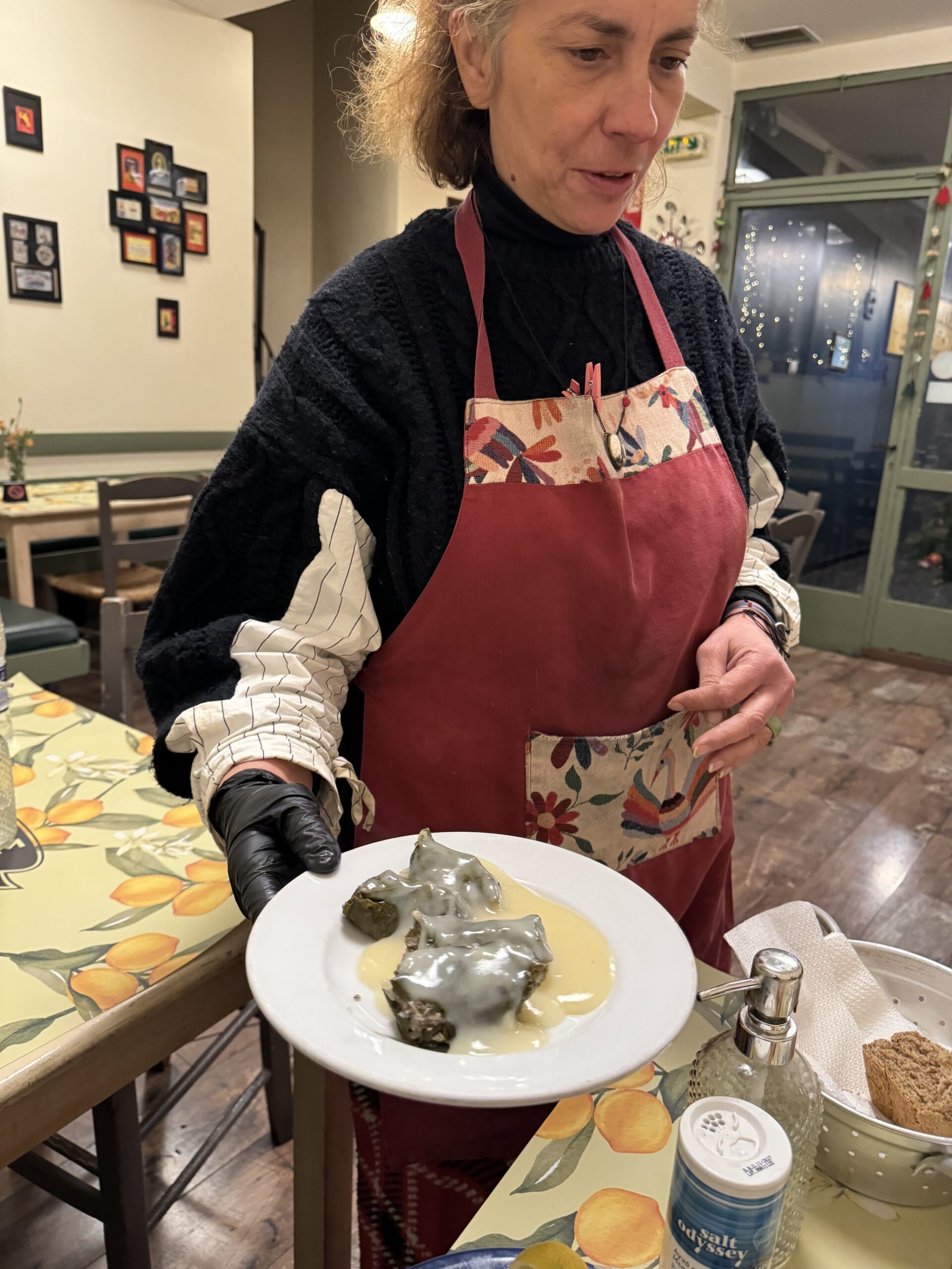 Την ρωτάω αν στο φαγητό της χωράει συναίσθημα και λέει αφοπλιστικά «Μόνο συναίσθημα». «Είσαι χαρούμενη που τα φαγητά σου είναι τα πιο νόστιμα;», ρωτάω και απαντάει με ειλικρίνεια «Εννοείται». Λίγοι θα το καταλάβουν, γιατί η γεύση πάνω-κάτω θα είναι η ίδια, αλλά όταν η ψυχή χορεύει τότε και τα φαγητά είναι ένα ποίημα. Τα ταΐζεις ευτυχία. Το ευτυχισμένο φαγητό μας έχει ευεργετικά οφέλη». Τρώω υπέροχα χόρτα, μπιφτέκια αφράτα και μια ψητή πικάντικη φέτα που βουτάω τις χρυσαφένιες τηγανιτές πατάτες, τηγανισμένες σε καθαρό λαδάκι και νιώθω ότι μεταφέρομαι σε μια παλιά καλή Ελλάδα που όλα ήταν πιο τίμια και αγνά. Είναι σημαντικό να μπορώ να κάνω το μεσημεριανό μου διάλειμμα σε ένα μέρος, τόσο καθαρό και περιποιημένο, που να είναι σαν να τρώω στο σπίτι αγαπημένου συγγενή πάνω σε καλοστρωμένα καρό τραπεζομάντηλα.