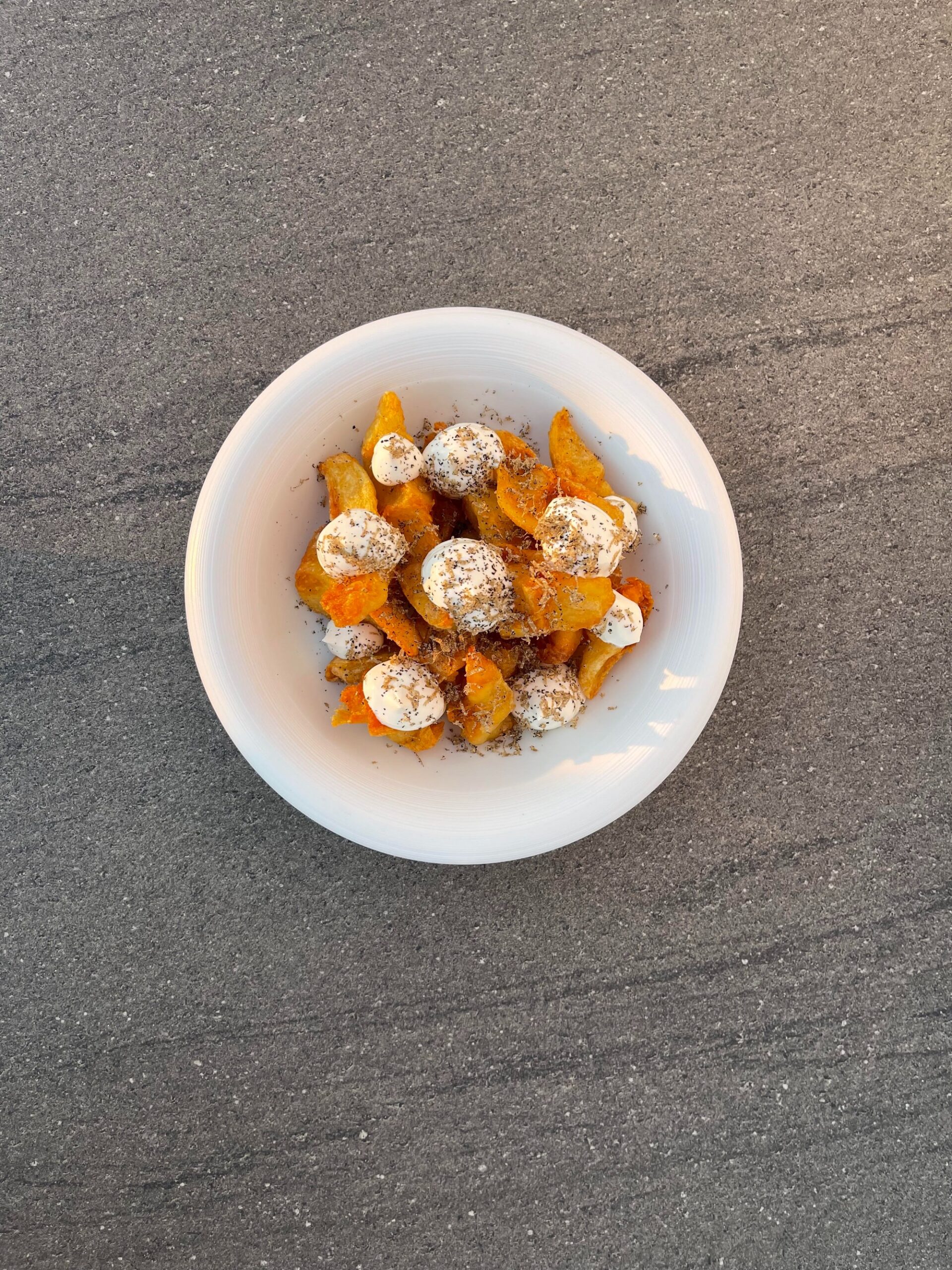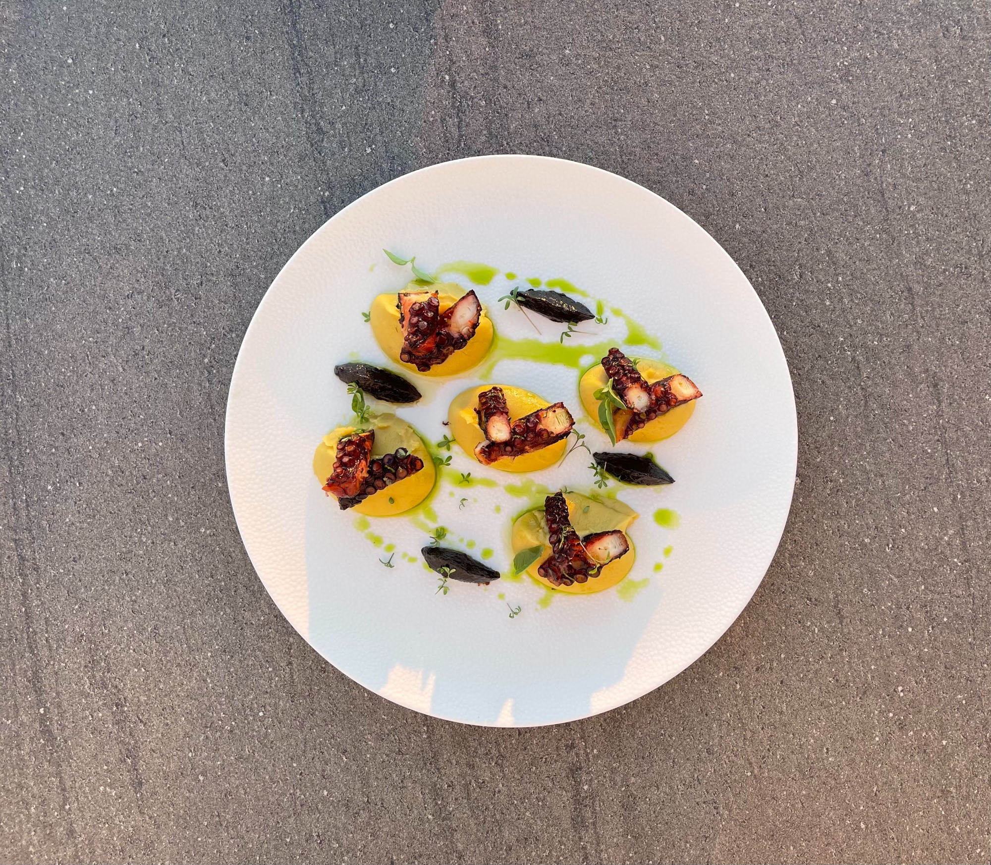 Ελληνικό χαρακτήρα σε μοντέρνο αμπαλάζ έχει επίσης ο κύριος κατάλογος του εστιατορίου, που σερβίρεται την ώρα του μαγικού ηλιοβασιλέματος κι έχει δημιουργήσει η ταλαντούχα σεφ Αυγερία Σταπάκη με chef de cuisine την Έλλη Μιτράι.