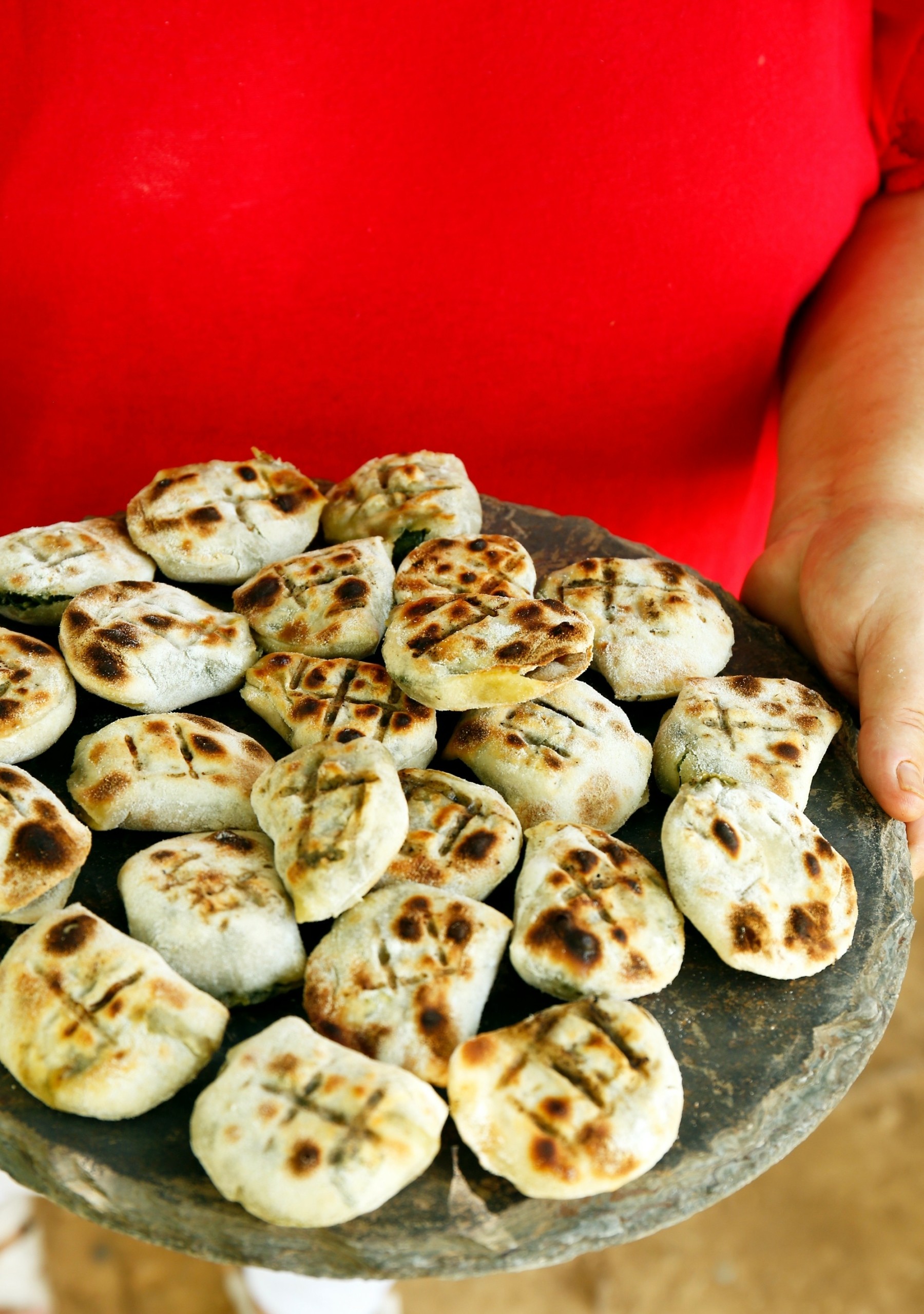 Τα χορτοπιτάκια είναι μια ακόμα εμπειρία. Στη σχάρα ψήνονται αντί του τηγανιού, τραγανές μπουκιές γεμισμένες με καυκαλήθρες, αχατζίκους, τσιλιμπινίδια, κουρνοπόδι αλλά και μάραθο, οι οποίες ταλαιπωρούνται μόνο ελάχιστα λεπτά επάνω από τα πυρωμένα κάρβουνα που έχει στήσει με περισσή επιμέλεια ο Αετός στην κουζίνα, πριν σερβιριστούν ως αποκορύφωμα στους ανυπόμονους, ήδη ποτισμένους με εμφιαλωμένη τσικουδιά, επισκέπτες.