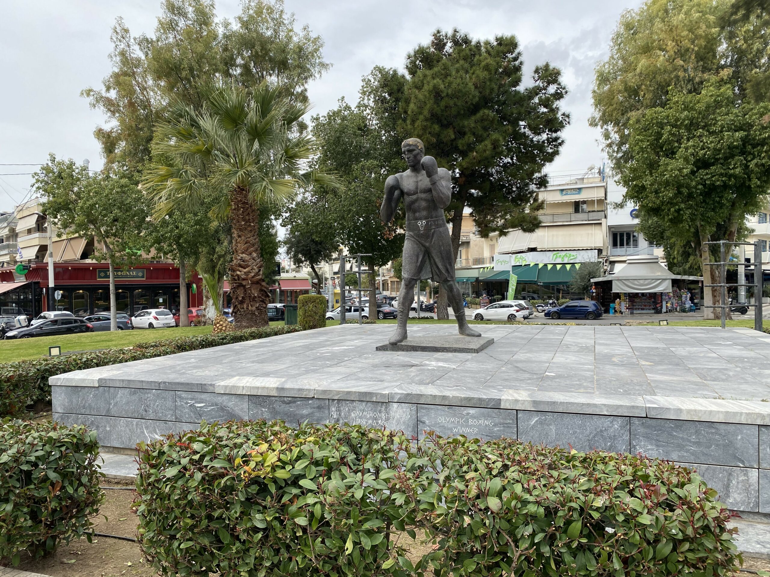 Ένας λεβέντης πυγμάχος σε υποδέχεται στιβαρός και σίγουρος στην κεντρική πλατεία Μπουρναζίου. Το Ολυμπιακό Κέντρο Πυγμαχίας που εγκαινιάστηκε στους Ολυμπιακούς Αγώνες της Αθήνας το 2004, είναι μόλις ένα χιλιόμετρο μακριά. Και ο πυγμάχος του Μπουρναζίου αποτίνει φόρο τιμής στους αθλητές μας, αλλά και σε όλους του ανθρώπους μια γειτονιάς που γνωρίζουν καλά τι θα πει μάχη για τη ζωή. Ακτινωτά, γύρω από την πλατεία, μια σειρά καταστήματα της δίνουν ζωή από τα ξημερώματα έως αργά το βράδυ.
