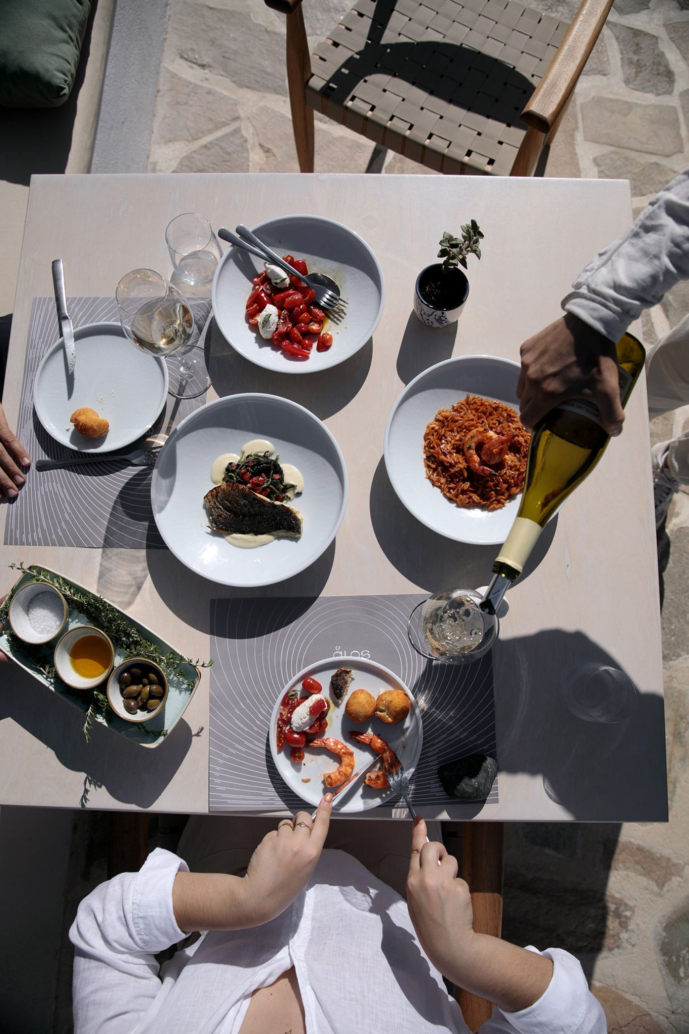 Παραμένοντας σε αυτή την πλευρά του νησιού, όπου ακόμη και στην καρδιά του Αυγούστου δεν φτάνουν τα τουριστικά πλήθη, υπάρχει μια γωνιά πλάι στο κύμα όπου το εστιατόριο Alos δημιουργεί ένα ιδιαίτερο σύμπαν. Μπροστά σε ένα ορμίσκο με το γαστρονομικό όνομα «Τηγάνι», το μπουτίκ ξενοδοχείο Ostria Inn φιλοξενεί αυτή τη γαστρονομική γωνιά. Από τους πρωινούς specialty καφέδες και τις αφράτες ομελέτες, μέχρι το καρπάτσιο φρέσκου τόνου, τις γαριδομακαρονάδες και τις δροσερές σαλάτες, το μενού καλύπτει όλες τις ώρες της ημέρας. Η Ευδοκία στην κουζίνα, η Λούλα στα κοκτέιλ και το σέρβις, και ο Κωνσταντίνος πανταχού παρών, συνθέτουν μια αυθεντική κυκλαδίτικη εμπειρία. Το Αιγαίο απλώνεται μπροστά σας, η Δονούσα κάνει νεύμα από απέναντι και οι βραχονησίδες Μάκαρες βρίσκονται μια ανάσα μακριά.