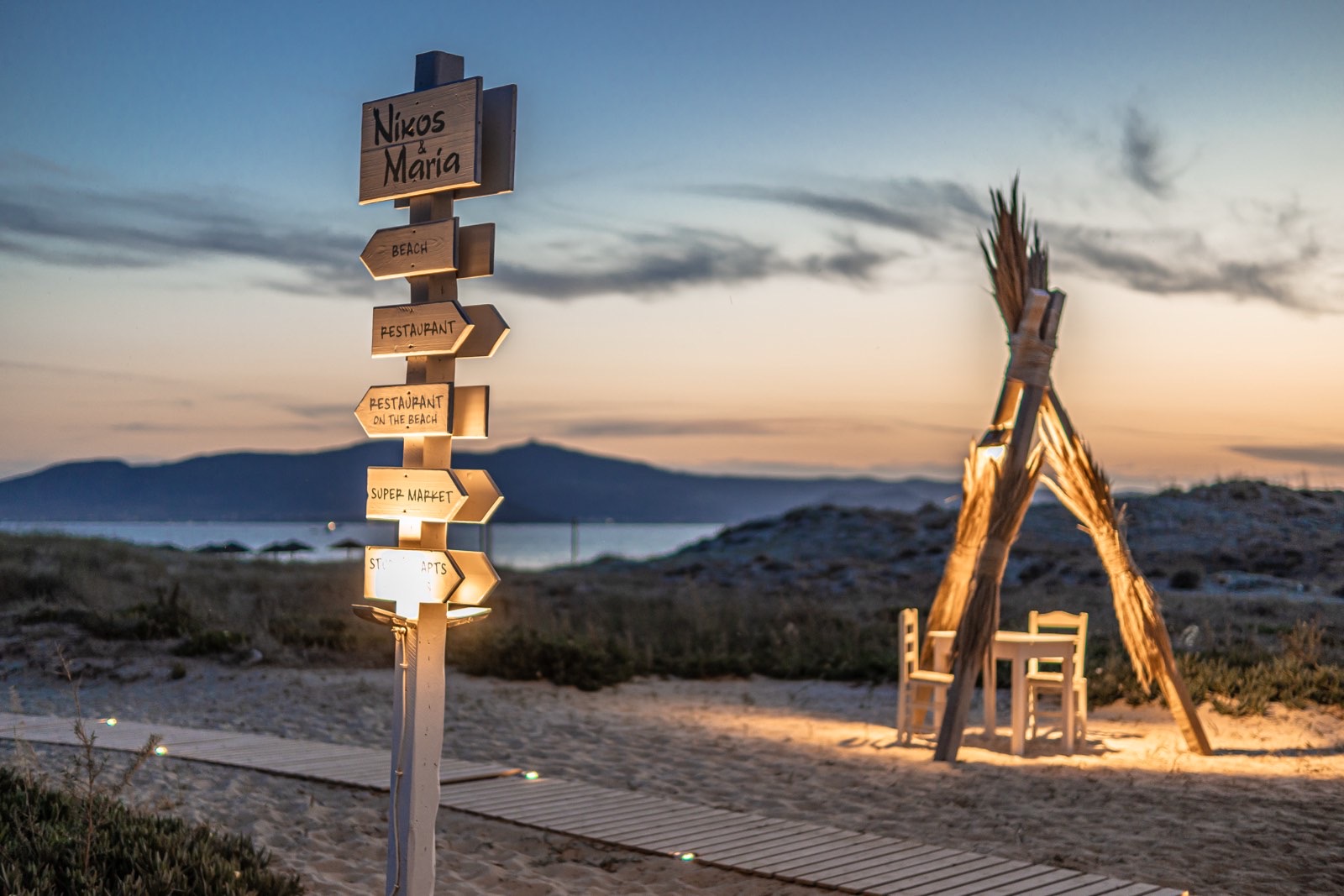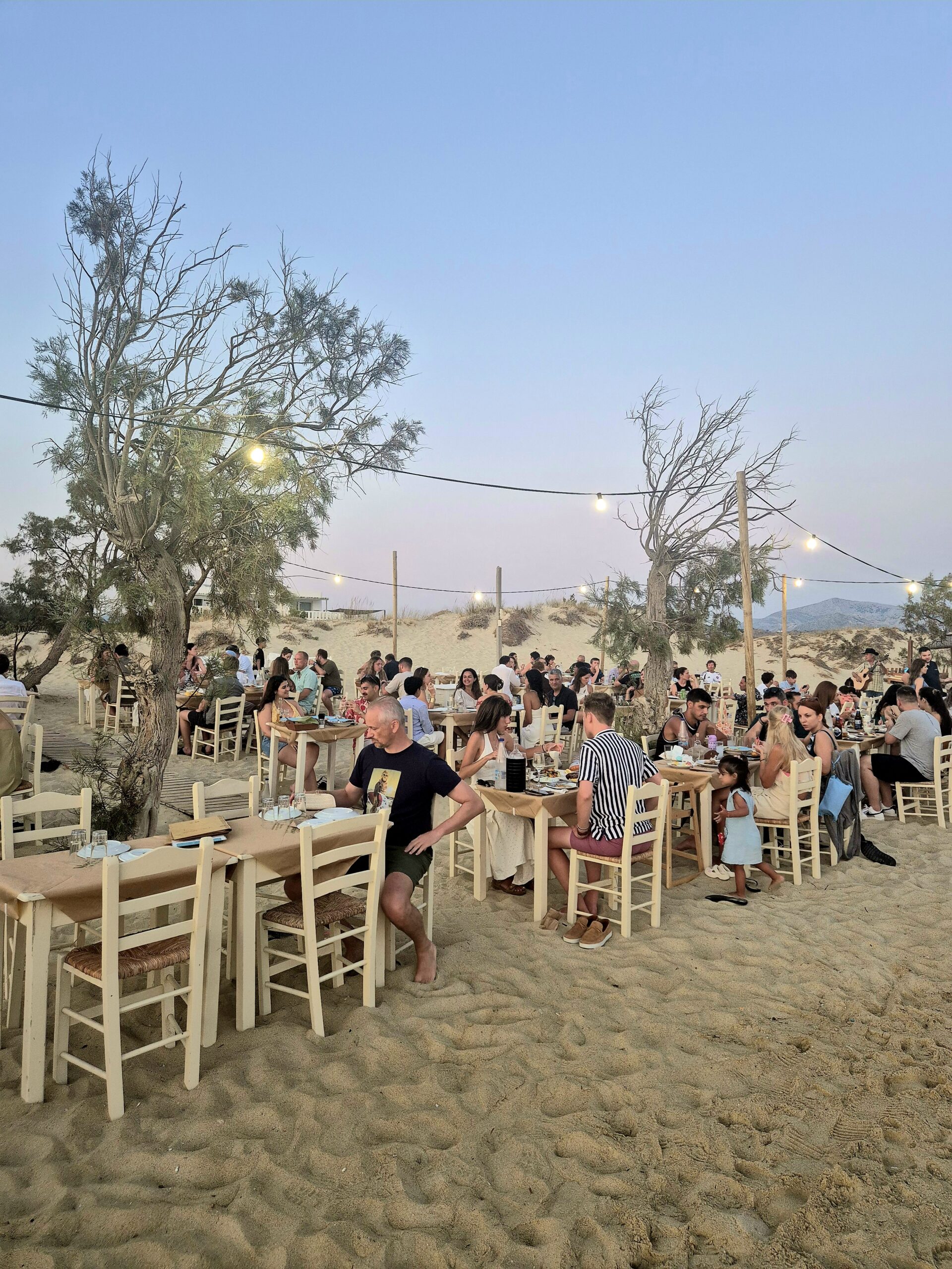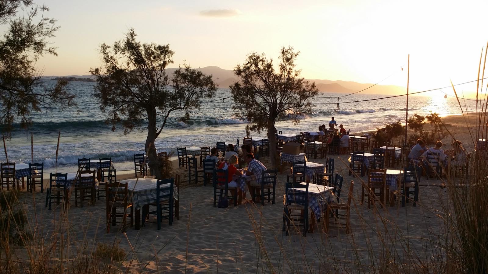 Λίγο πιο πίσω, τα λαμπιόνια ανάβουν και τα λευκά, ξύλινα τραπεζοκαθίσματα της ταβέρνας «Νίκος Μαρία», της παλαιότερης στην Πλάκα, γεμίζουν γοργά. Νέα ζευγάρια, παρέες που αναζητούν το ανεπιτήδευτο και το ουσιαστικό, οικογένειες με παιδιά που ευχαριστιούνται λίγο ακόμη παιχνίδι στην άμμο. Μυρωδιές που από την κουζίνα φτάνουν ως πέρα από τον δρόμο στην ακροθαλασσιά και ανοίγουν περισσότερο την όρεξη, άφθονη λάμψη από το φεγγάρι, γενναιόδωρες μερίδες που καταφθάνουν στα τραπέζια, πόδια στην απαλή σαν πούδρα άμμο, ποτήρια που τσουγγρίζουν, το τραγούδι ενός κιθαρίστα που εμφανίζεται σχεδόν κάθε βράδυ: οι εικόνες μοιάζουν με καλομελετημένο σκηνικό, αλλά χωρίς αμφιβολία μεταδίδουν την αίσθηση του αυθεντικού, του μη προσποιητού, αυτού που όλοι ευχόμαστε να ζήσουμε στις διακοπές και που θέλουμε να κρατήσουμε σαν πολύτιμη ανάμνηση.