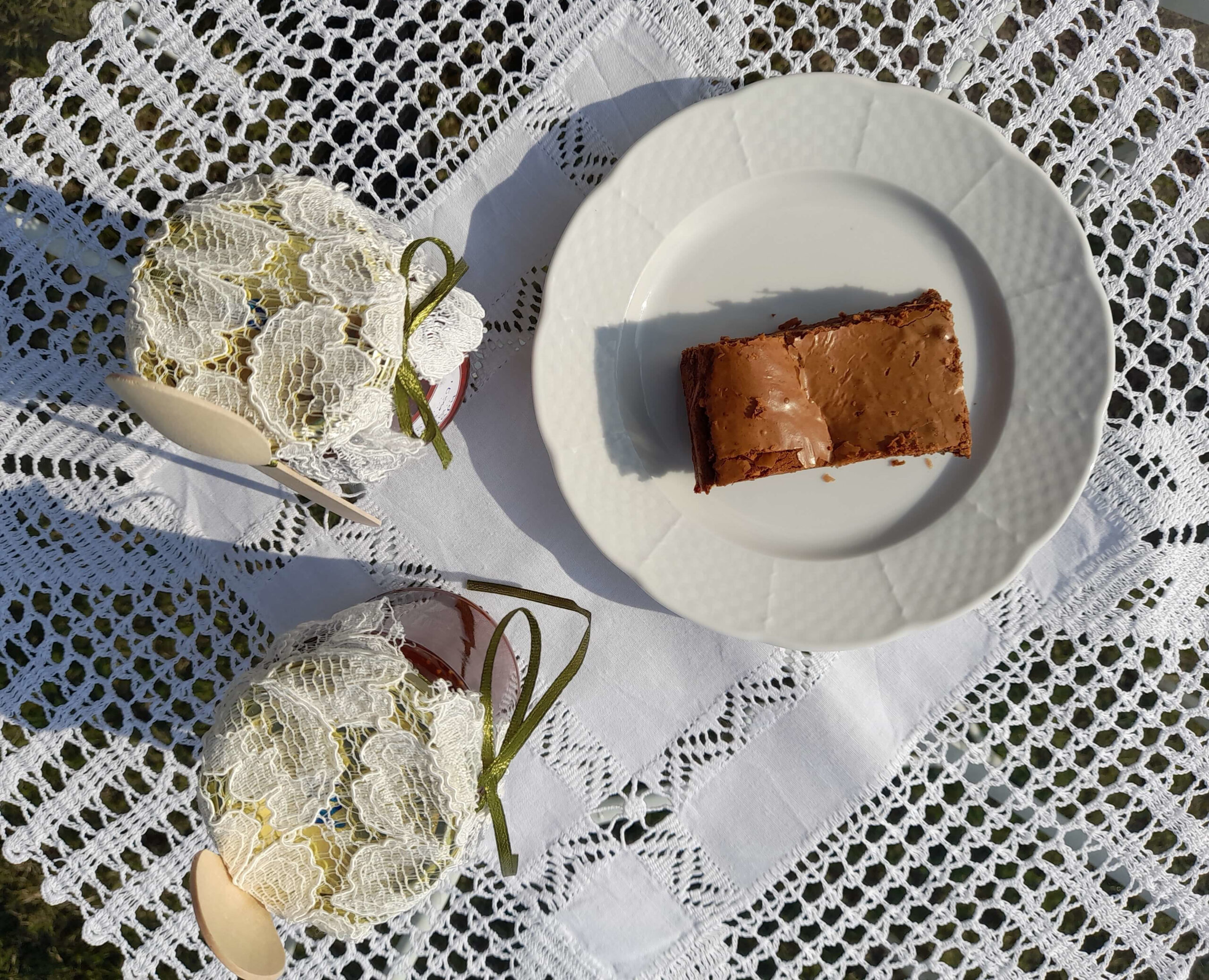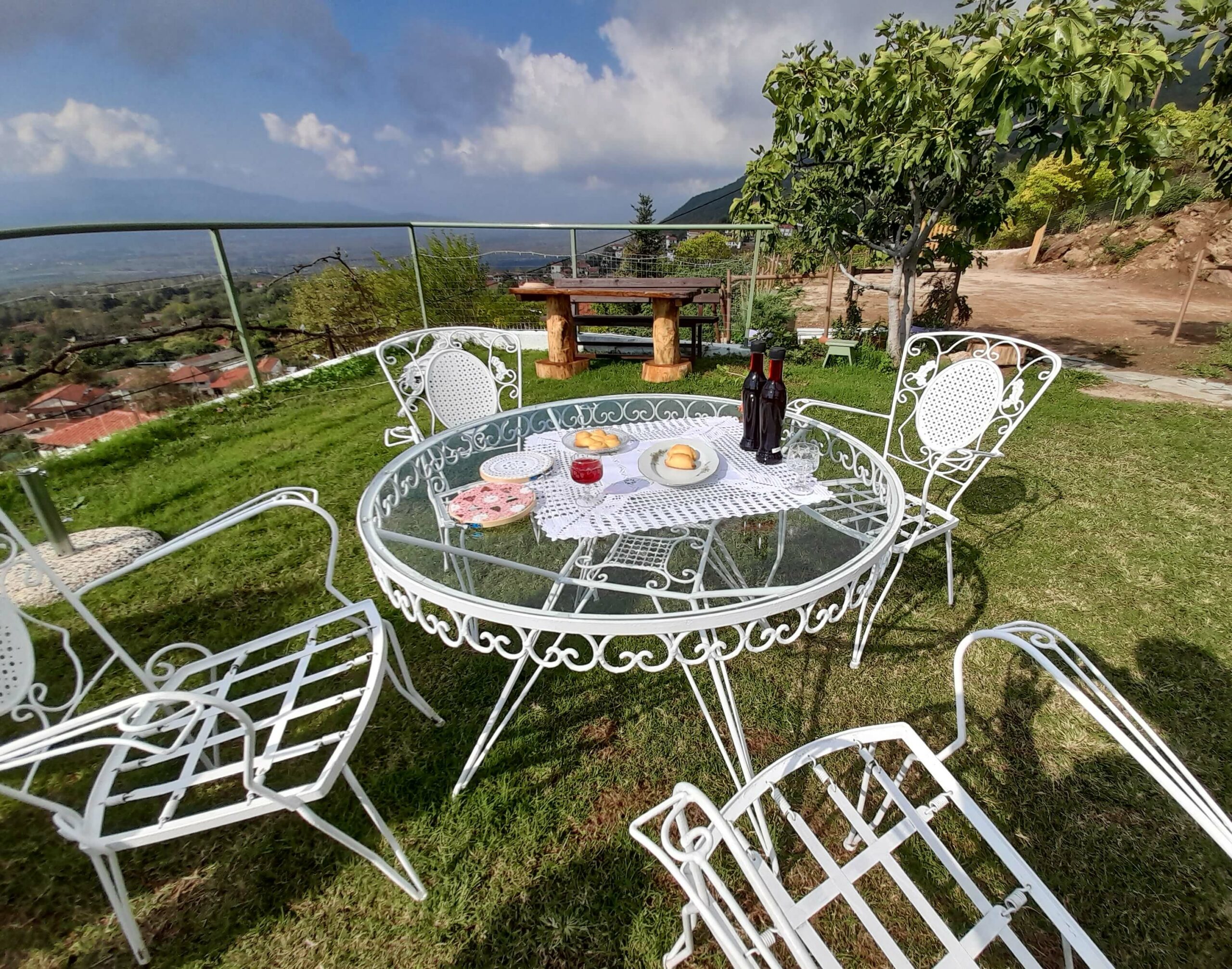 Στο μικρό αυλιδάκι του καφέ, οι άσπρες φερ φορζέ καρέκλες, υπενθυμίζουν το αστικό παρελθόν του χωριού και συνυπάρχουν με μοναστηριακά ξύλινα τραπέζια, ιδανικά για να απλωθούν όλες οι νοστιμιές που φτιάχνονται στο μικρό παρασκευαστήριο.