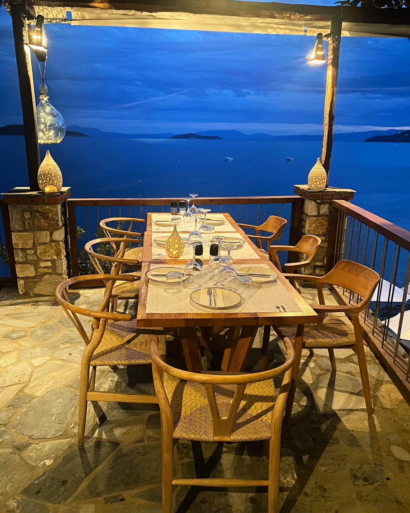 Μαγευτική θαλασσινή θέα στο ηλιοβασίλεμα από την κομψή βεράντα. Δημιουργικό μενού με προσεγμένα πιάτα από την ελληνική και διεθνή κουζίνα με βάση προϊόντα από ντόπιους παραγωγούς.. Πλούσια λίστα κρασιών.