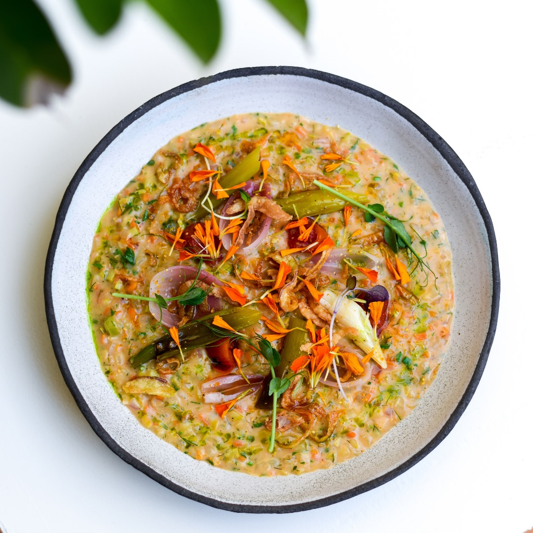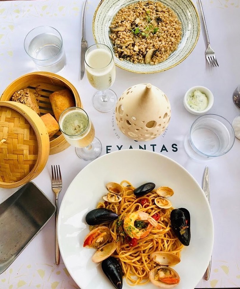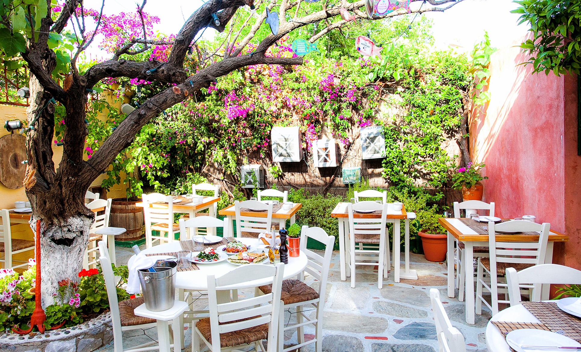 Ταβέρνα στην αυλή παλιού διώροφου αρχοντικού κάτω από τις κληματαριές και τις μπουκαμβίλιες. Ελληνική κουζίνα με δημιουργικές πινελιές με πιάτα όπως όπως vegan μουσακάς και καλαμάρι με λαχανικά, κάπαρη και φύκια.
