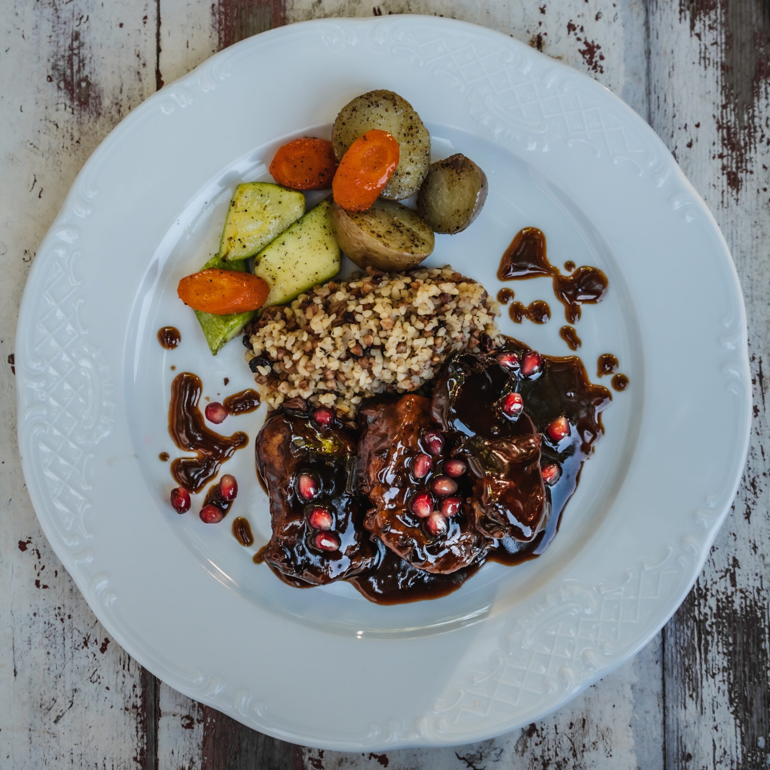 Ανάμεσά τους ξεχωρίζει το Χοιρινό με σάλτσα από ρόδι με συνοδεία από λαχανικά εποχής και «πιλάφι» από πλιγούρι, φαγόπυρο, ρόδι και σταφίδες, η Μελιτζάνα γεμιστή με κρέμα γιαουρτιού και γαρνιρισμένη με σουμάκ, μαυροσούσαμο και ρόδι, η Μαραθόπιτα με άγριο μάραθο, κασέρι, κεφαλοτύρι και φινόκιο, η «κολομπαρόπιτα» (μπατσίνα) μια πίτα από πράσινα κολοκυθάκια χωρίς φύλλο αρωματισμένη με φρέσκο κρεμμυδάκι και δυόσμο και φέτα, το (σπάνιο να το βρεις) αρνάκι Αφύτου στη γάστρα με ρύζι, πάρα πολλά φρέσκα αρωματικά βότανα (φρέσκα κρεμμυδάκια, άνηθο, δυόσμο) και ξινά δαμάσκηνα. Ενημερωμένη λίστα κρασιών με περίπου 80 ετικέτες συν παλαιωμένα κρασιά, όλα από τον ελληνικό αμπελώνα, και αρκετά αποστάγματα.