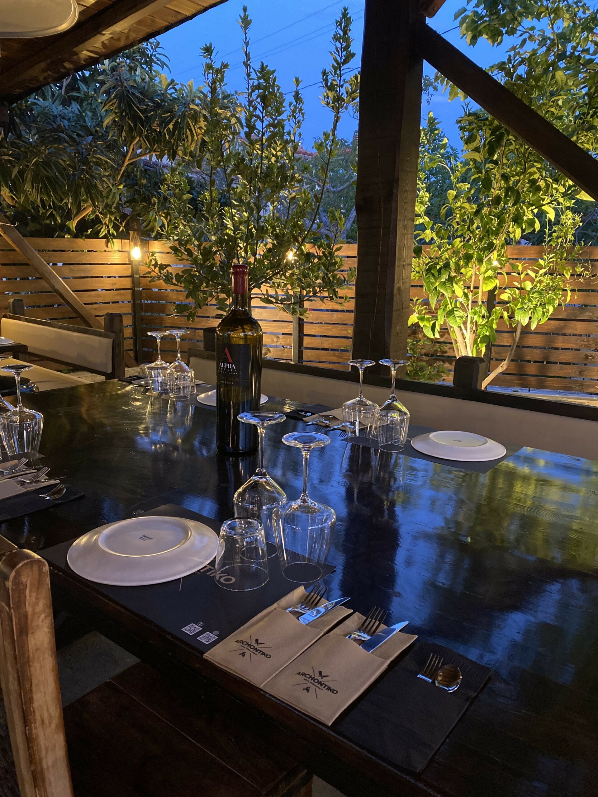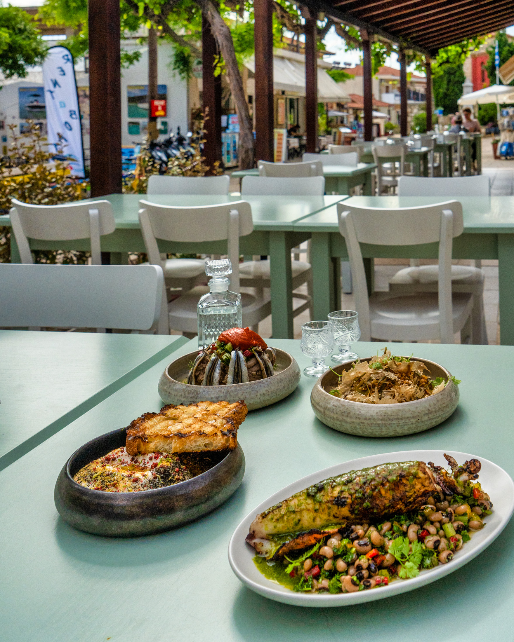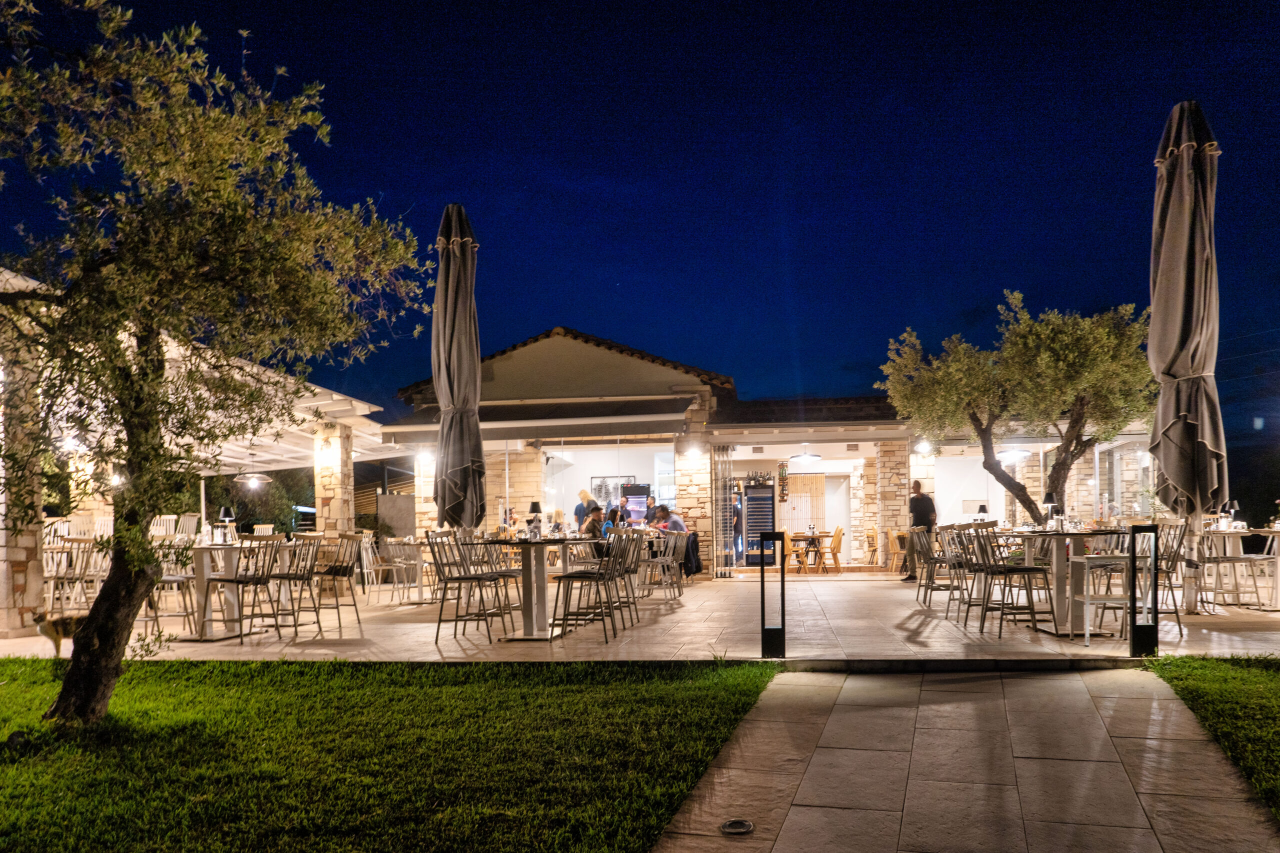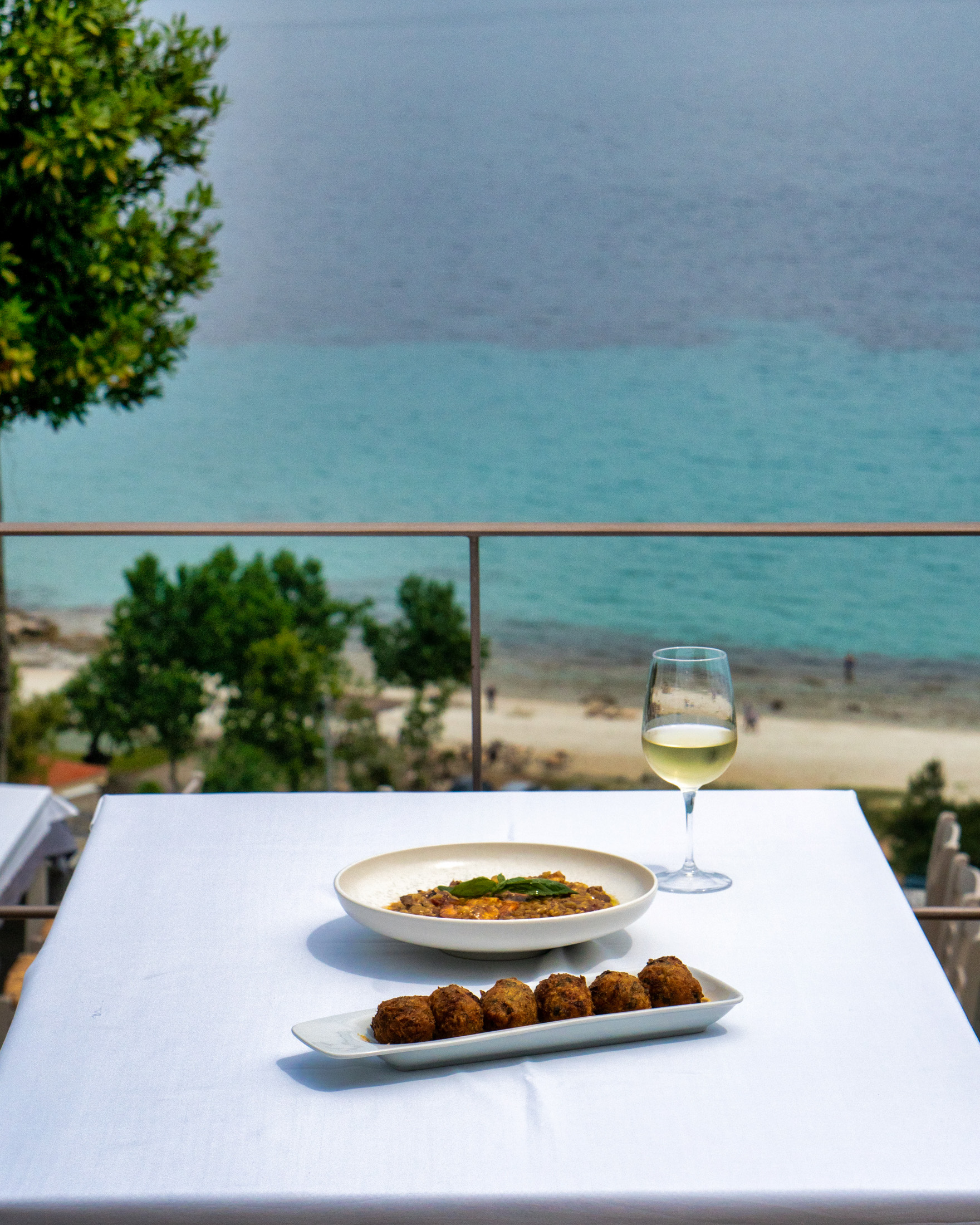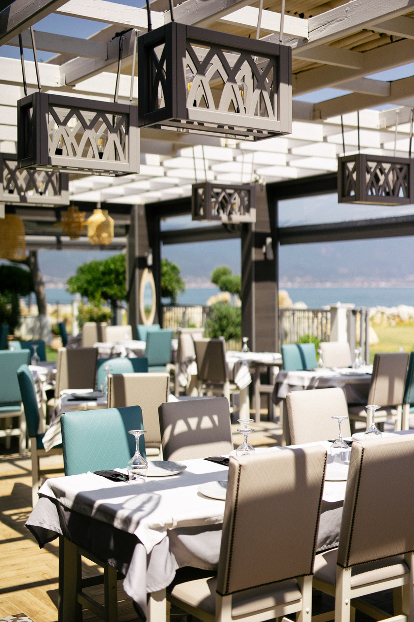 Το πράσινο του κήπου ενώνεται με το γαλάζιο της θάλασσας, τα τραπέζια στρώνονται στην όμορφη βεράντα με καλαίσθητη λιτή art de la table. Η γκουρμέ διάθεση του σεφ Χρήστου Γκρέμου στο ύφος της σύγχρονης ελληνικής κουζίνας συντονίζεται με την κλασική ελληνική θαλασσινή κουζίνα και ορισμένες σταθερές της Αγιορείτικης μαγειρικής. Ξεχωριστά πιάτα, το Σαλατούρι με μπακαλιάρο σε ταραμά αβοκάντο, η Χταποδοτηγανιά σε τάρτα φάβας, η Γαρίδα σαγανάκι µε σάλτσα φρέσκιας ντοµάτας και ξύγαλο Σητείας. Ενδιαφέρουσα λίστα κρασιών με έμφαση στον τοπικό αμπελώνα.
