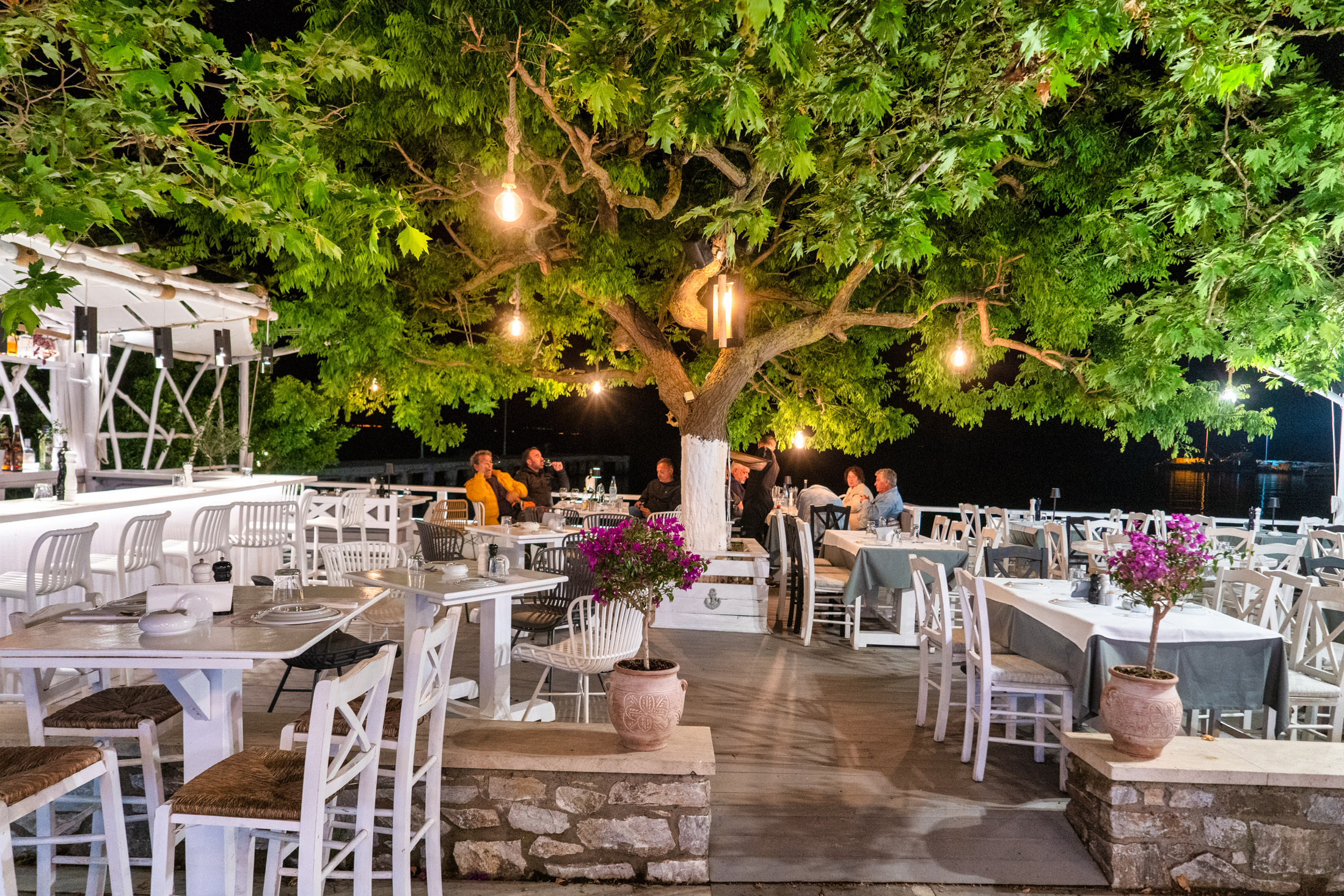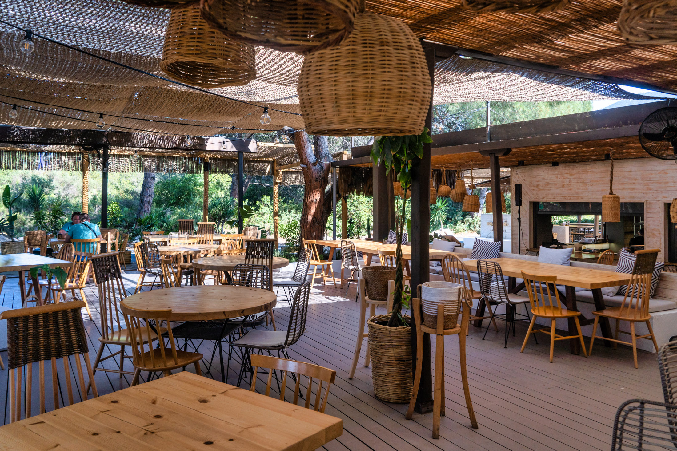 Το πιο καλοκαιρινό περιβάλλον μέσα στα τεράστια καταπράσινα πεύκα, δύο λεπτά από την παραλία. Ξύλινα τραπεζοκαθίσματα και αναπαυτικοί καναπέδες στο υπερυψωμένο ντεκ, στέγαστρα από καλάμι και υφασμάτινα πανό, φωτιστικά από ψάθα. Κορμός του μενού τα ψάρια και τα θαλασσινά, consultant σεφ ο διάσημος Γιάννης Μπαξεβάνης. Πεντανόστιμη η Γαρίδα ψημένη σε βότσαλο αρτυμένη με πούδρα από αποξηραμένα φύκια και ούζο πάνω σε χαρουπόψωμο με ταραμά, το Φιλέτο λαυράκι σαβόρε πάνω σε λεμονάτο σπανακόρυζο, με πουρέ καρότα και κρέμα γραβιέρα είναι απόλαυση, νόστιμο το Διάφραγμα αρωματισμένο με αρώματα Ανατολής. Ενδιαφέρον επιδόρπιο η Τριλογία χαλβά με παγωτό, τριμμένο φιστίκι και αφρό φιστίκι.