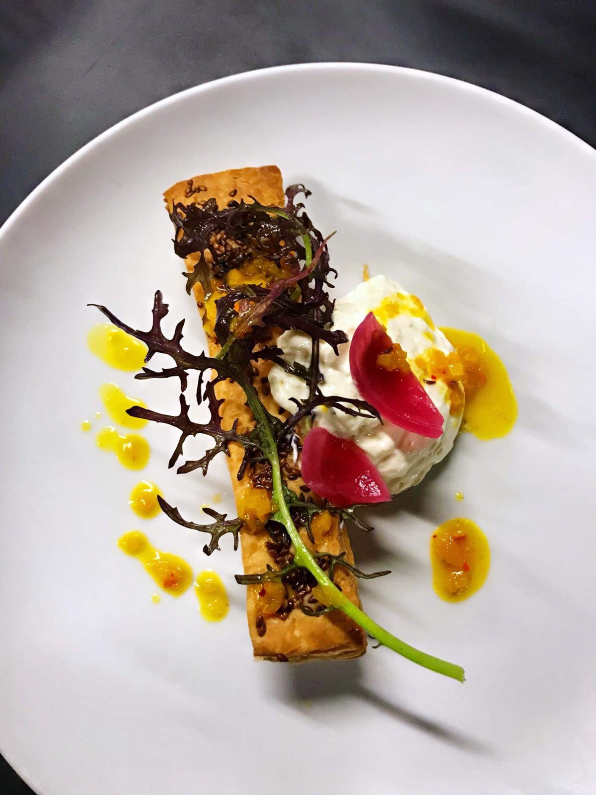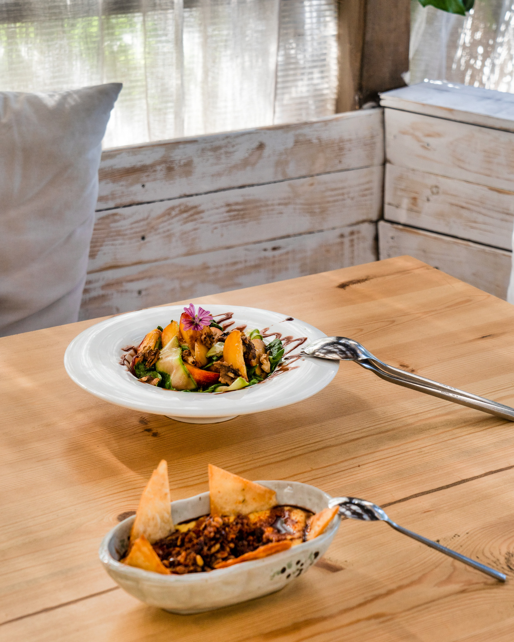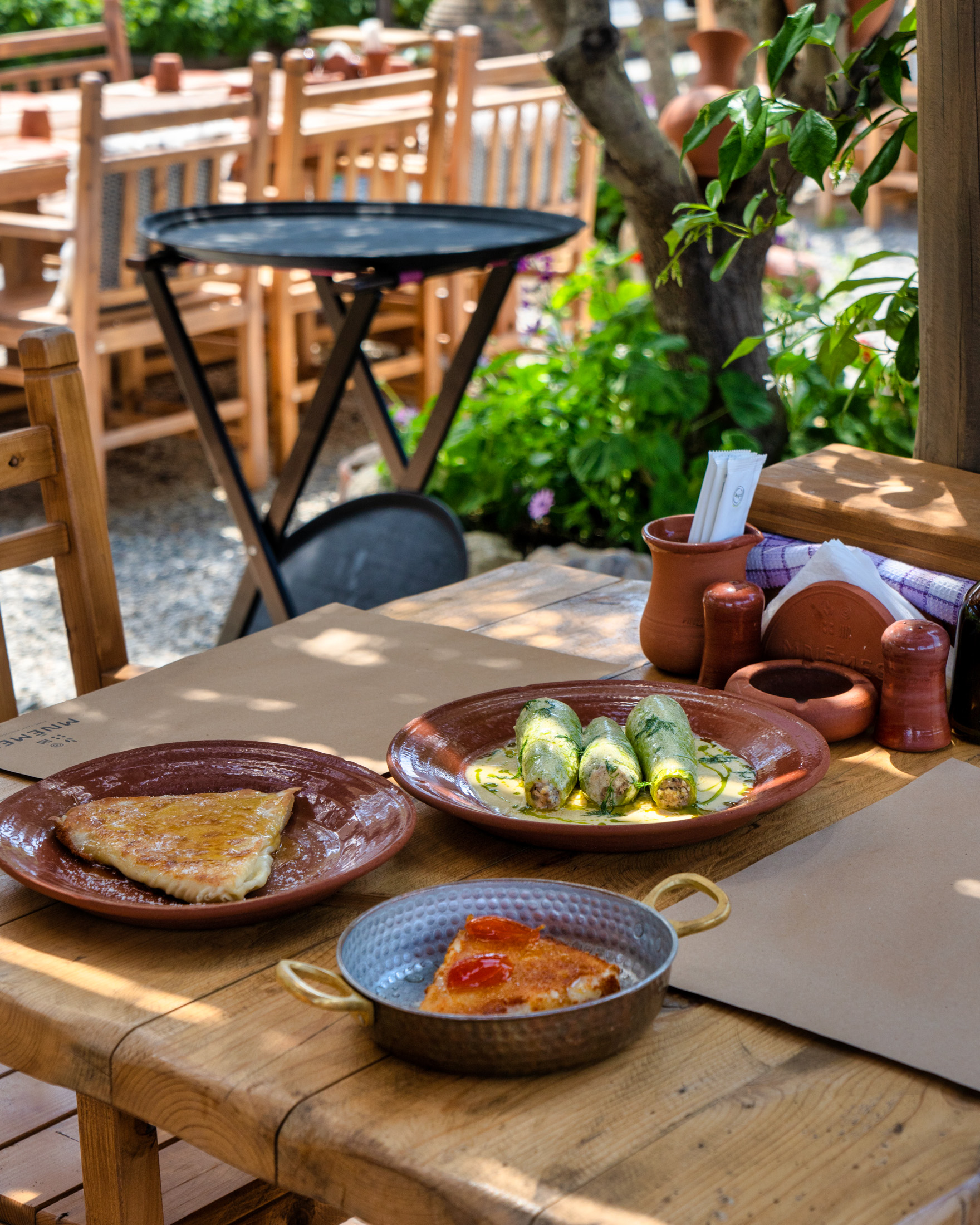 Επιδόρπια με έμπνευση το ένα εξ Aνατολών και το άλλο εξ Δυσμών, ο Χαλβάς σιμιγδαλένιος με κρέμα ρυζόγαλο, μπισκότο μελιού και παγωτό μαστίχα Χίου και το Snickers in the pot, το (γνωστό διεθνές σνακ) με κρέμα φυστικοβούτυρο, καραμέλα με φιστίκι αλατισμένο και χώμα κακάο. Δοκιμάστε την τοπική μπύρα Valtinger και ζητείστε Μουντοβίνα -το χαλκιδικιώτικο τσίπουρο από κηρήθρα της Αρναίας κα. Λουλούδια σε ντενεκέδες ζωγραφισμένους από τον τοπικό καλλιτέχνη Βασίλη Παυλή, υπερυψωμένη πέτρινη βεράντα, μουσικές jazz, blues, funk, swing, άψογη περιποίηση.