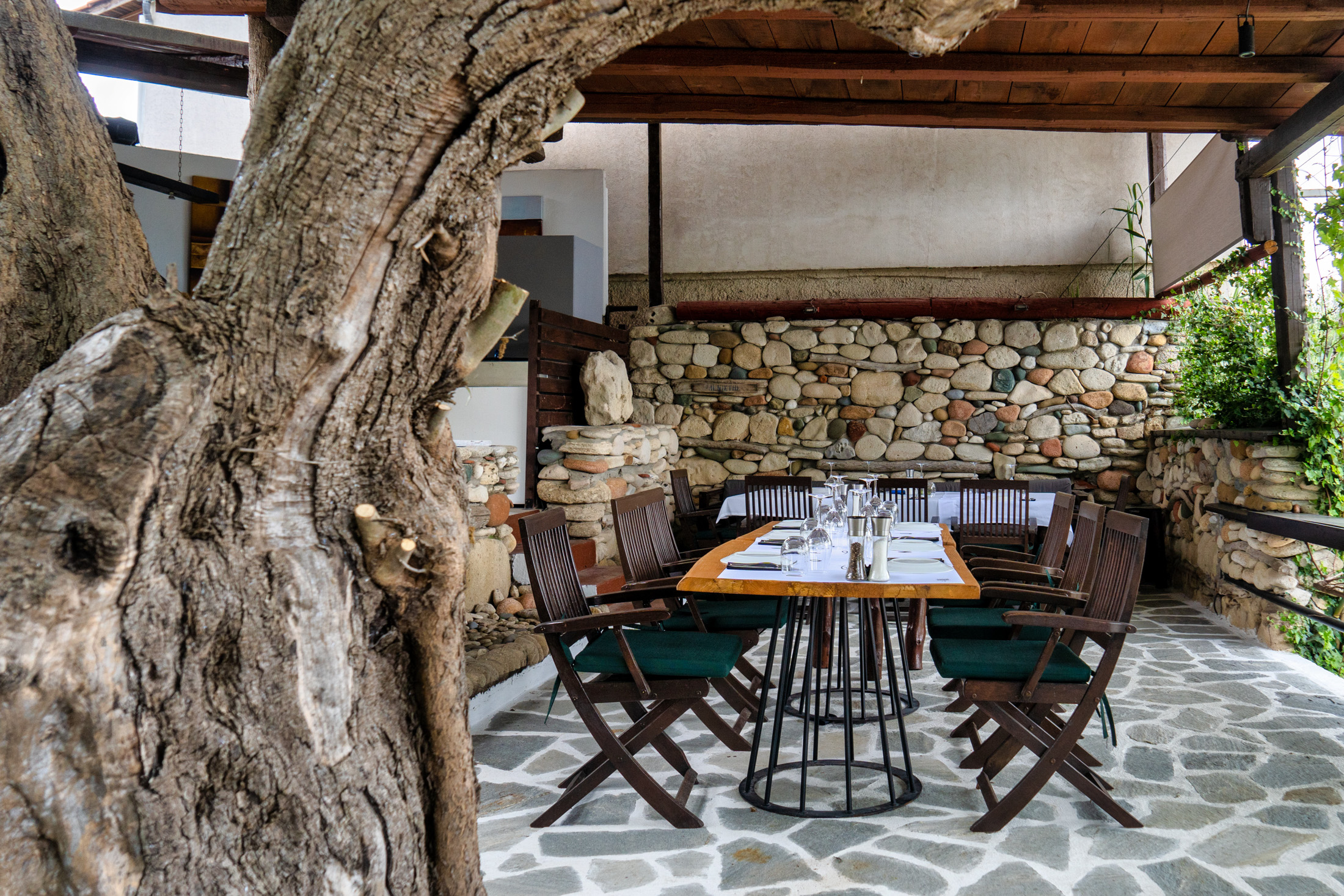 Ένα μαγευτικό δάσος από πανύψηλες βελανιδιές καδράρει το εστιατόριο σε υψόμετρο 620 μέτρων στους πρόποδες του Χολομώντα, λίγο έξω από το παραδοσιακό χωριό Αρναία, στο υπέροχο άλσος της Αγίας Παρασκευής με το ιστορικό εκκλησάκι του. Ο ιδιοκτήτης και σεφ Δημήτρης Πολύζος με βάση τη μακρόχρονη πείρα του σε εστιατόρια των Βρυξελλών, δημιουργεί μία ζωντανή ελληνική κουζίνα με προσωπικές πινελιές, που βασίζεται κυρίως σε τοπικά προϊόντα. Μέρος των αναγκών του εστιατορίου σε καλοκαιρινά λαχανικά εξυπηρετείται από το μποστάνι του ενώ κορμός του μενού είναι τα ντόπια κρέατα συν κάποιες premium κοπές μοσχαριού που έρχονται από το εξωτερικό. Πιάτα με ιδιαίτερο ενδιαφέρον είναι το σιγομαγειρεμένο Μοσχάρι με λευκό κρασί, κρεμμύδι και γλυκό τραχανά από αγελαδινό γάλα, η μαύρη Φακή με παντζάρι και φιλέτο κολιού, το Φύλλο κρούστας με κατσικίσιο τυρί, σάλτσα εσπεριδοειδών και πίκλα κρεμμυδιού, η Παντσέτα σιγοψημένη και καραμελωμένη με πλιγούρι, βότανα και δαμάσκηνα. Ο χώρος αποπνέει φιλόξενη, comfort διάθεση με το ξύλο και την πέτρα ως βασικά δομικά υλικά, διαθέτει μεγάλη και ασφαλή παιδική χαρά και είναι pet friendly.